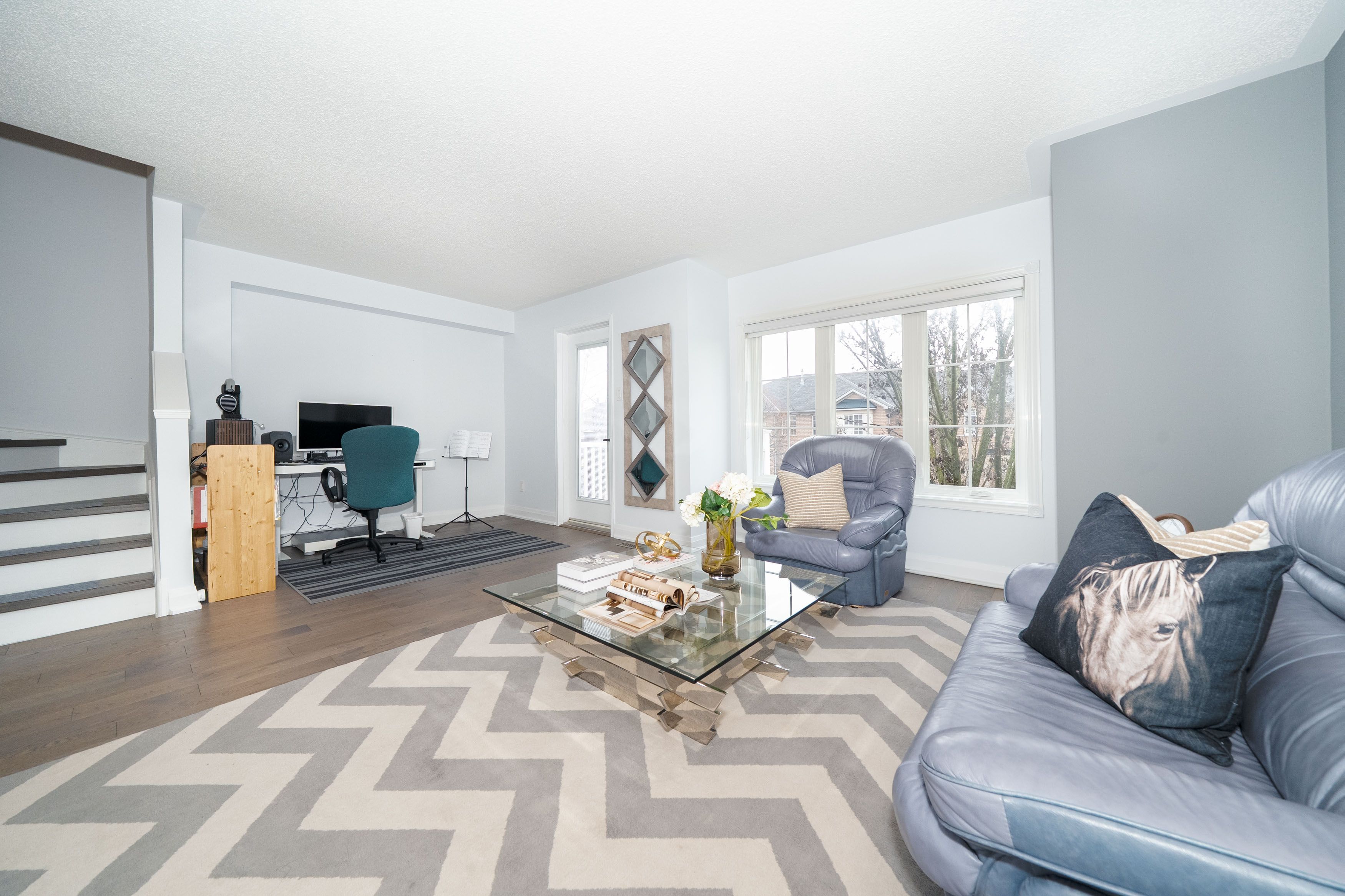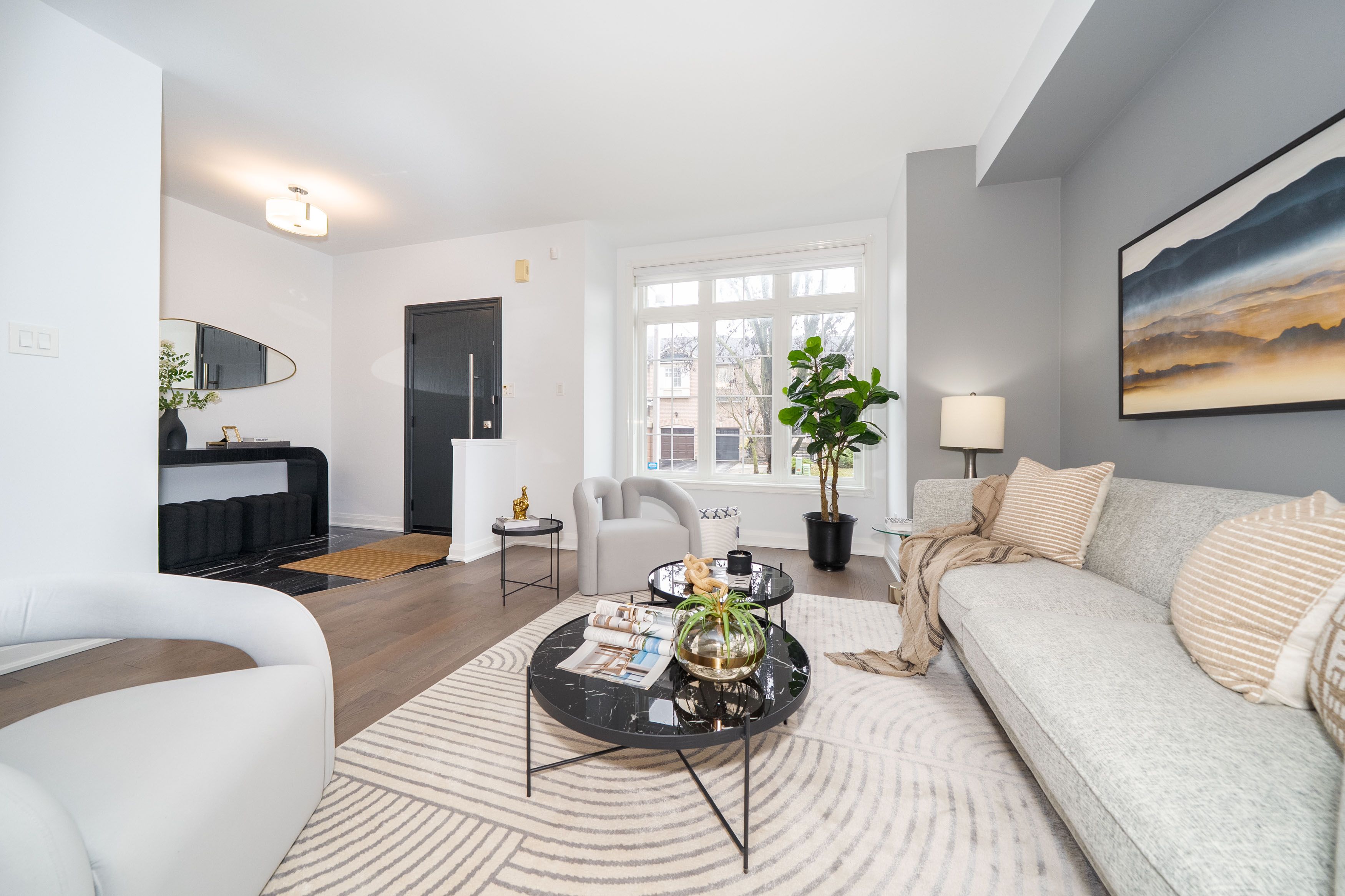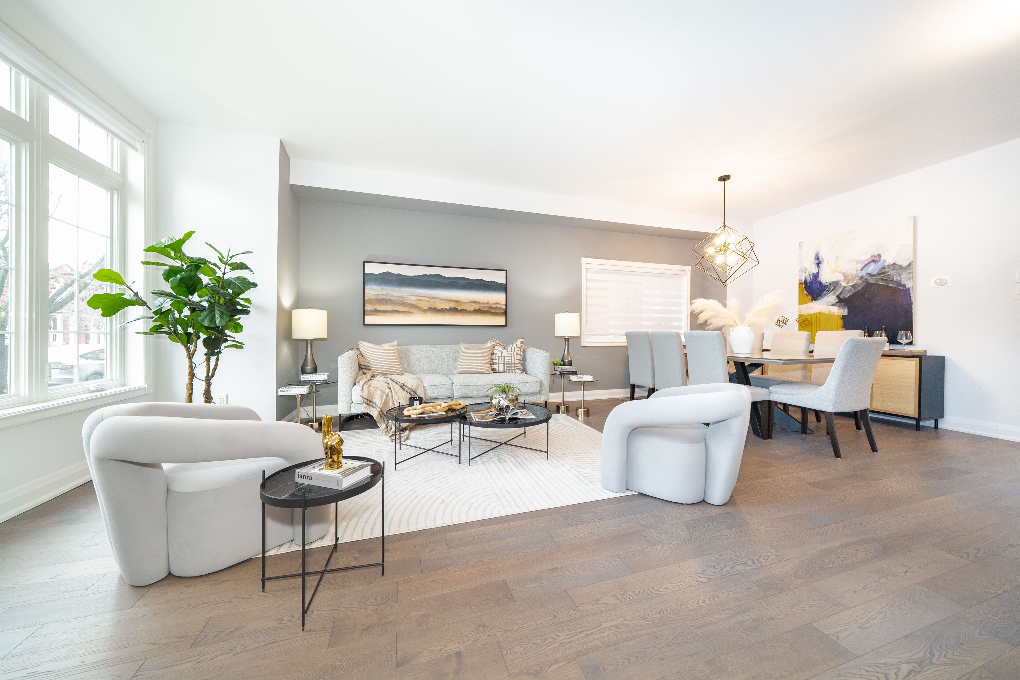 • Bright open-concept main level filled with natural light and hardwood flooring.