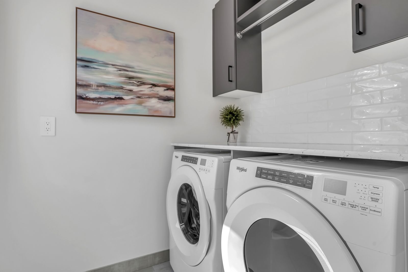 • Chef's kitchen features quartz countertops and high-end Whirlpool appliances.