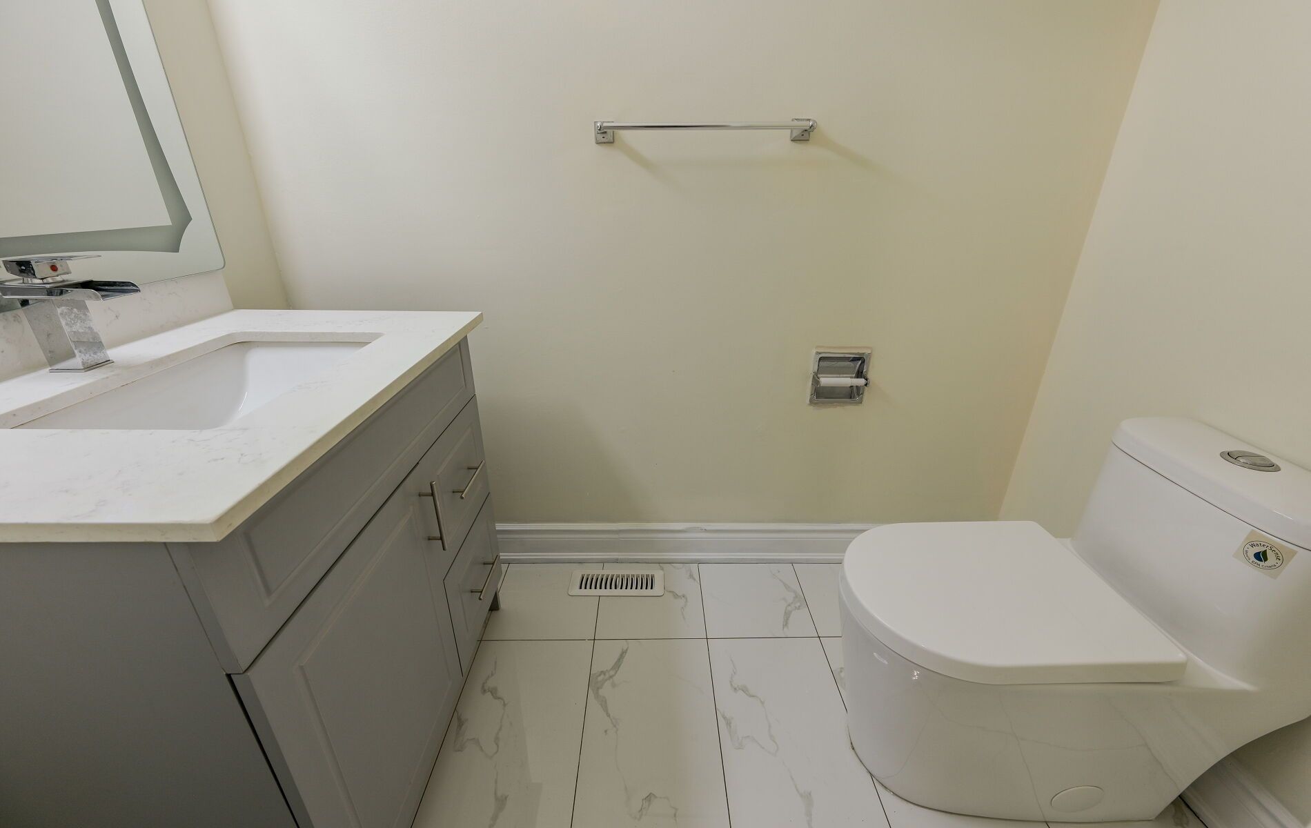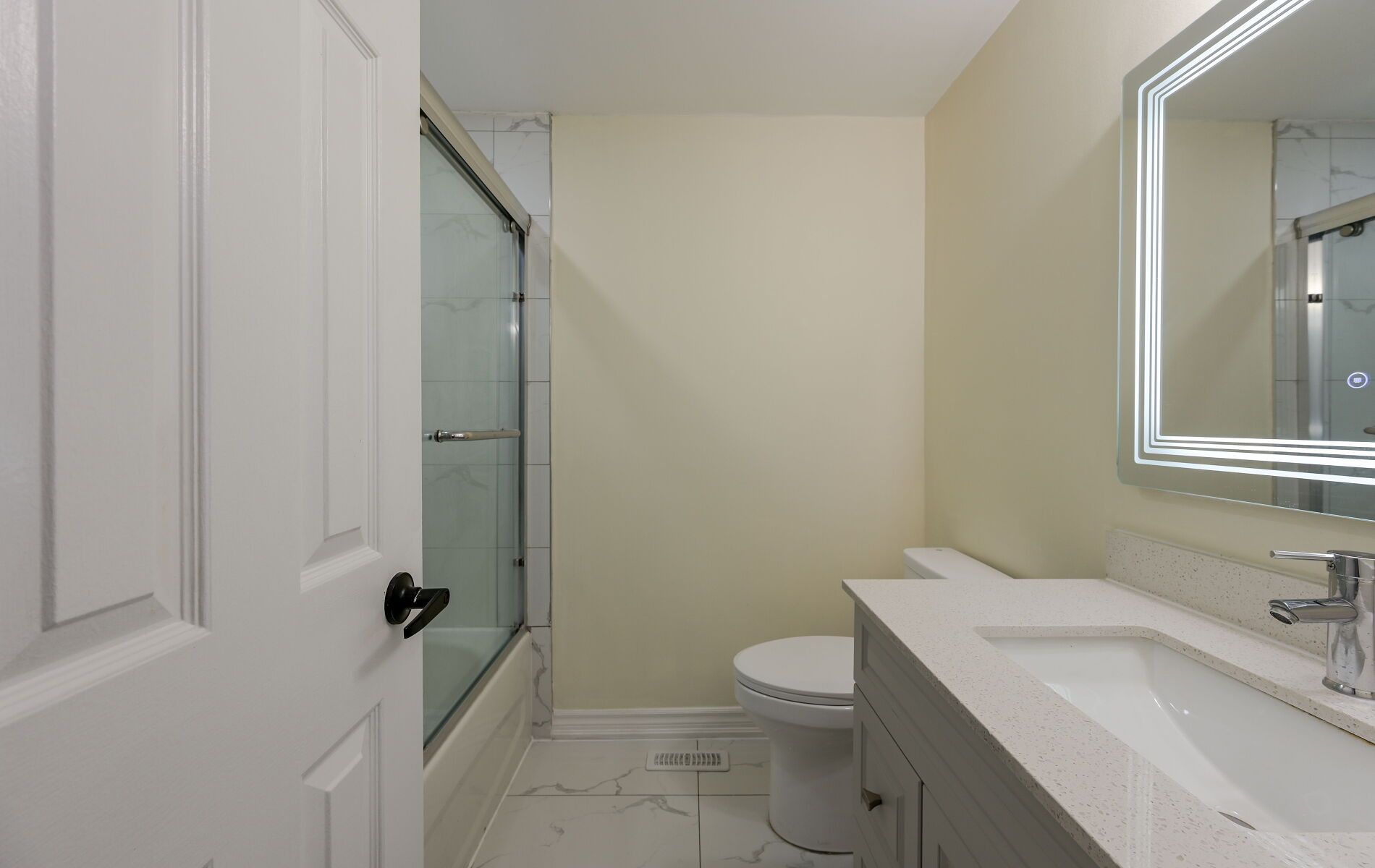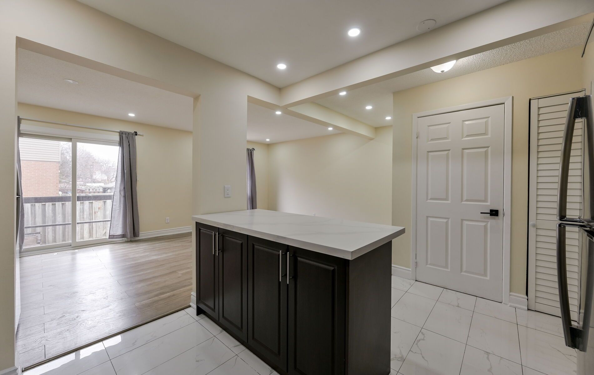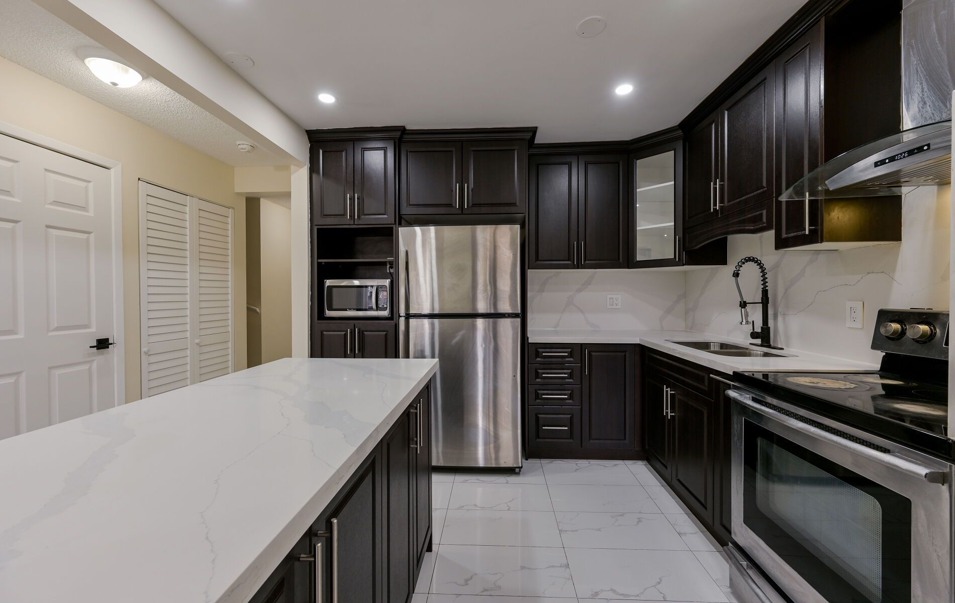 • Modern kitchen featuring quartz countertops and stainless steel appliances.