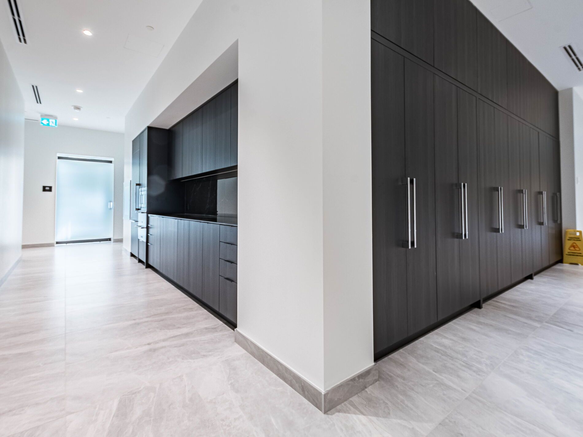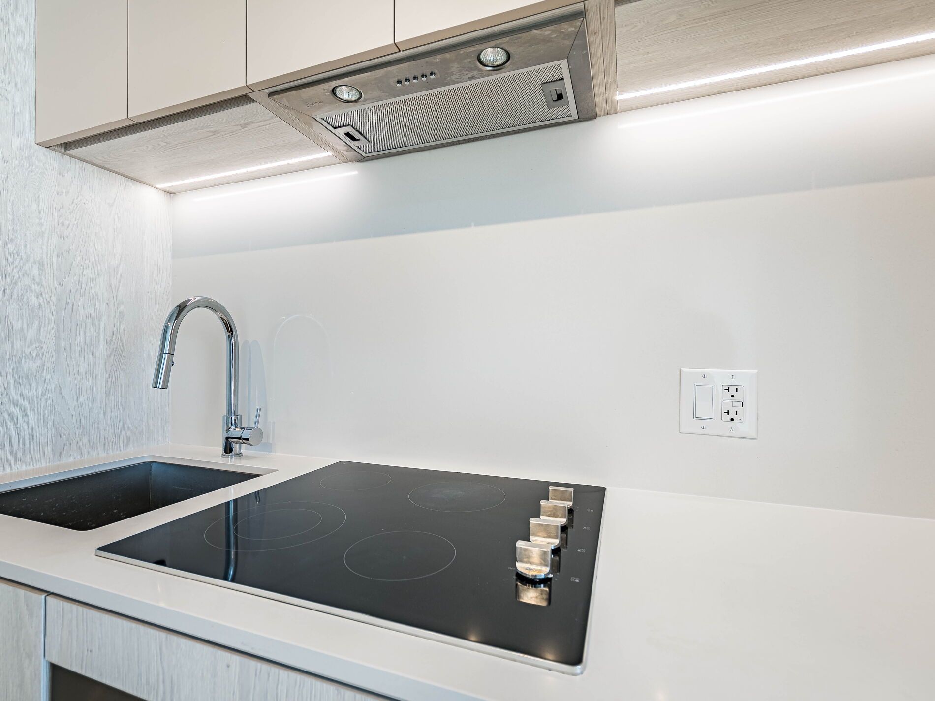 • Contemporary kitchen with stainless steel appliances and quartz countertops.