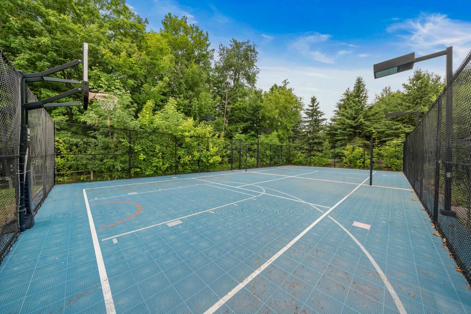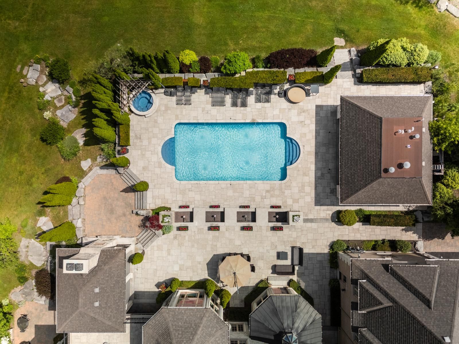 • Outdoor areas include a swimming pool, cabana, and sports court.