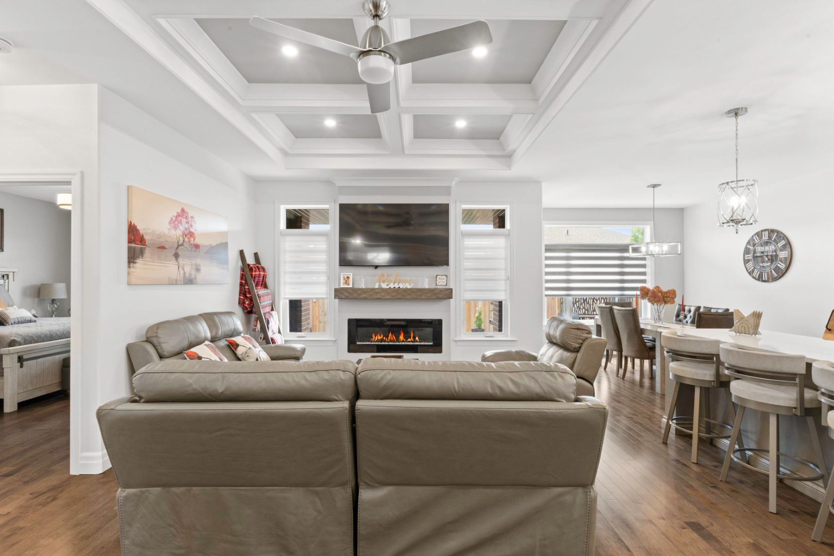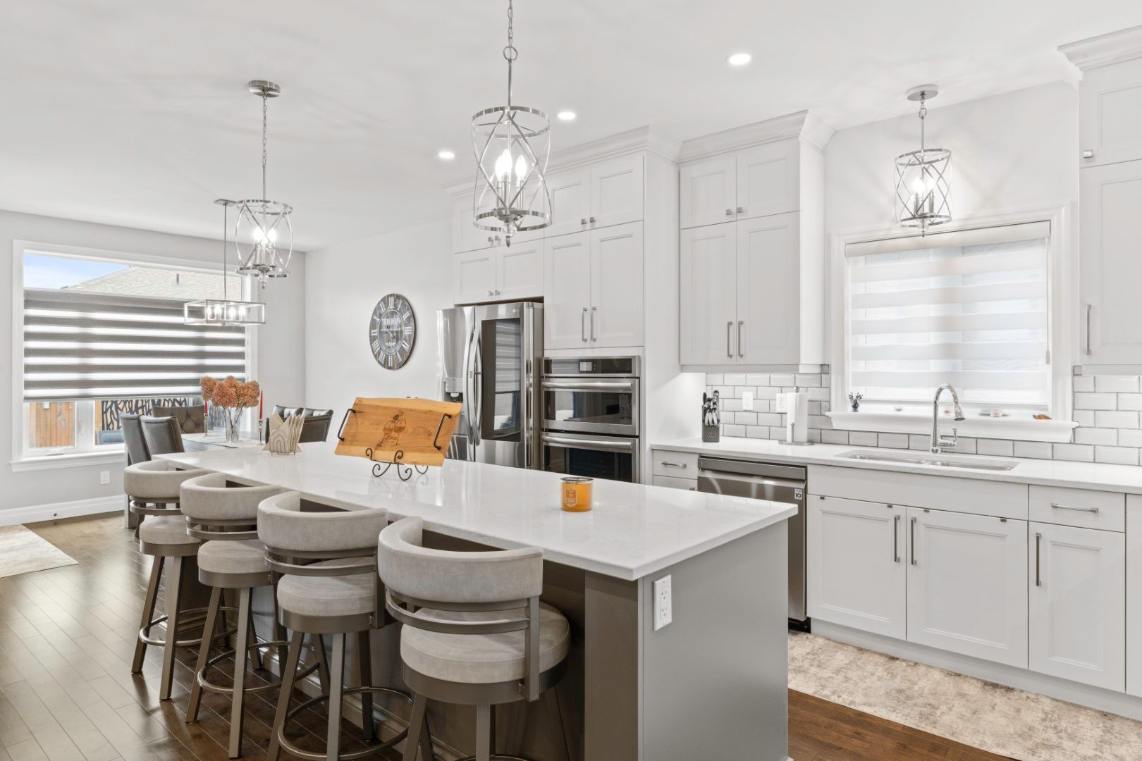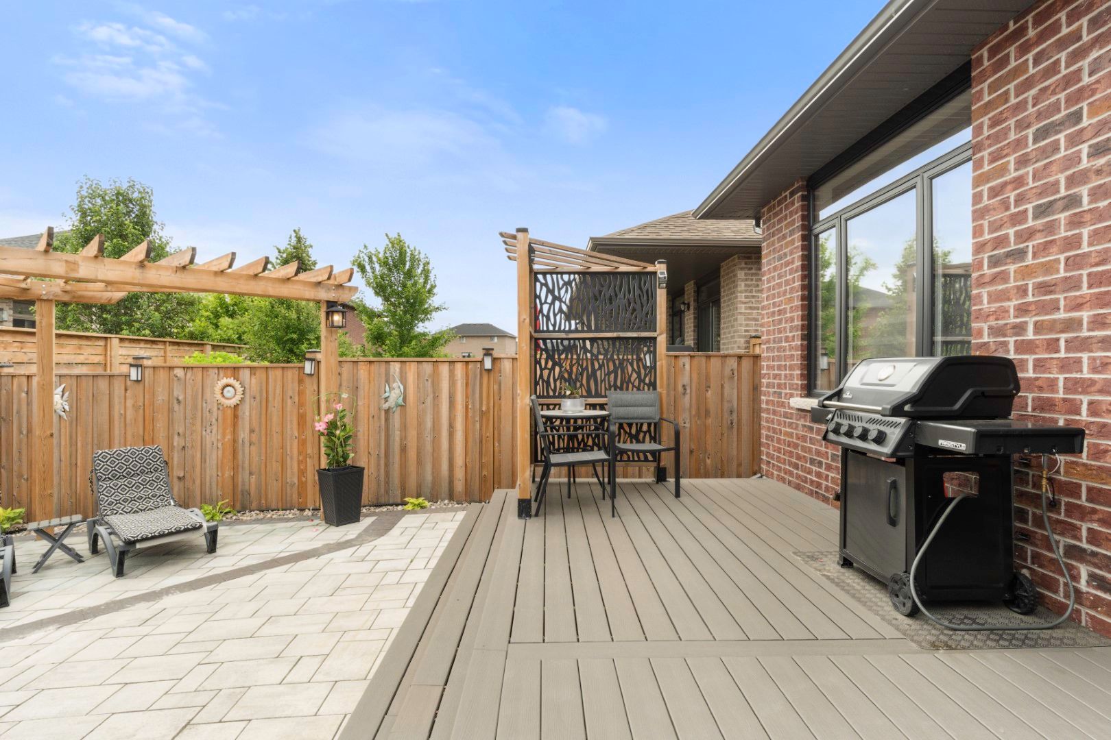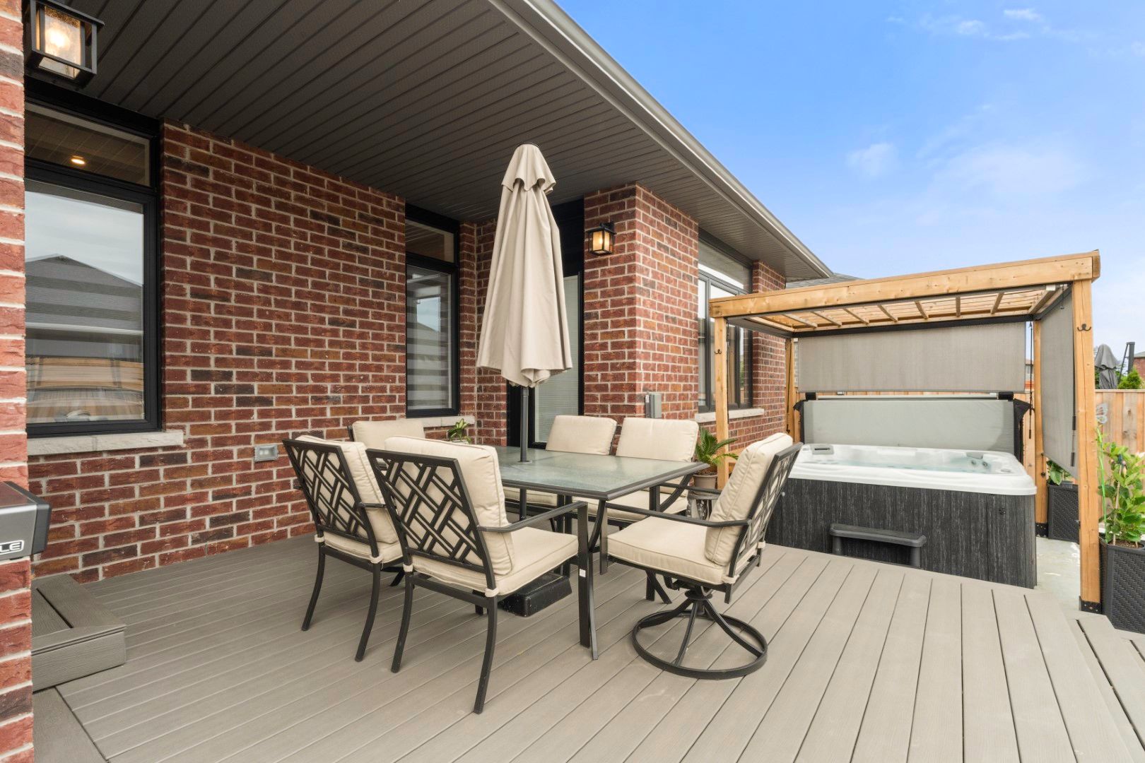 Immaculate staikos built three-year-old brick bungalow in caniff mills, belleville. This four-bedroom, three-bathroom home features a high-quality kitchen with built in wall ovens, cooktop, pantry and built in wine cooler, cambria quartz counters, mirage hardwood flooring, custom powered blinds, phantom screen doors - front and back - for that perfect cross breeze, detailed coffered ceiling in the great room and built in electric fireplace with mantel. The primary bedroom includes a walk-in closet and a 4-piece ensuite with tiled glass shower, double sink vanity with cambria quartz counters. Full finished basement with large rec room, bar for entertaining, full bathroom with heated floors, 2 bedrooms, office area and lots of storage space. Relax in the maintenance-free interlock backyard, complete with hot tub with privacy screens, gas bbq hookup, a composite deck, pergola, bistro area perfect for morning coffee and shed/workshop with hydro. Attached double car garage and triple wide driveway with interlock makes for lots of parking space. Conveniently located near all amenities, this home also provides easy access to the 401, subdivision playground park and the riverside trail. Harmony school district. School bus pickup available.