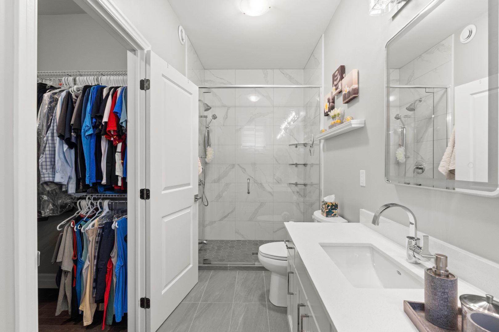 • Gourmet kitchen equipped with premium quartz counters and built-in appliances.