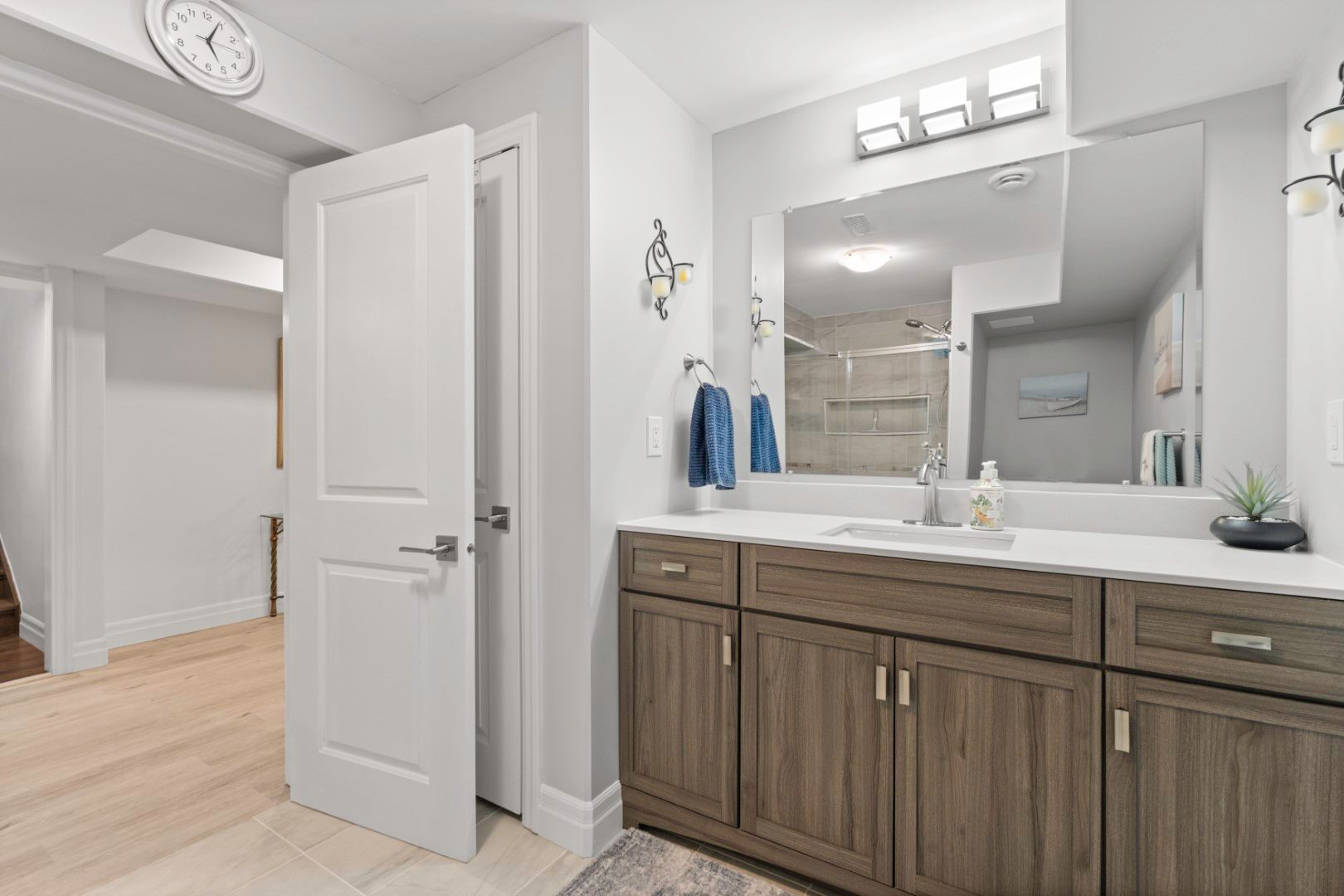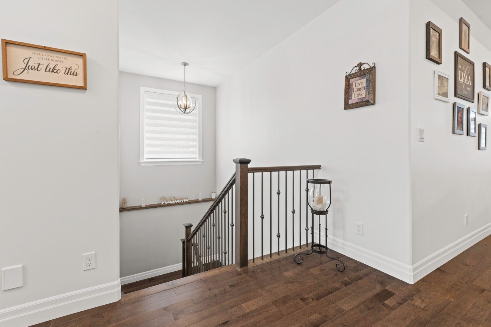• Open-concept living space features hardwood flooring and a custom electric fireplace.