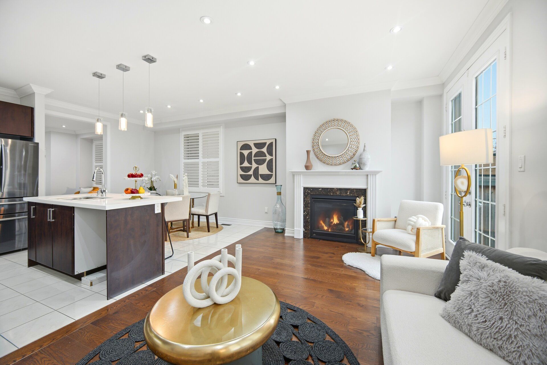 • Open-concept main floor with hardwood flooring and a welcoming fireplace.