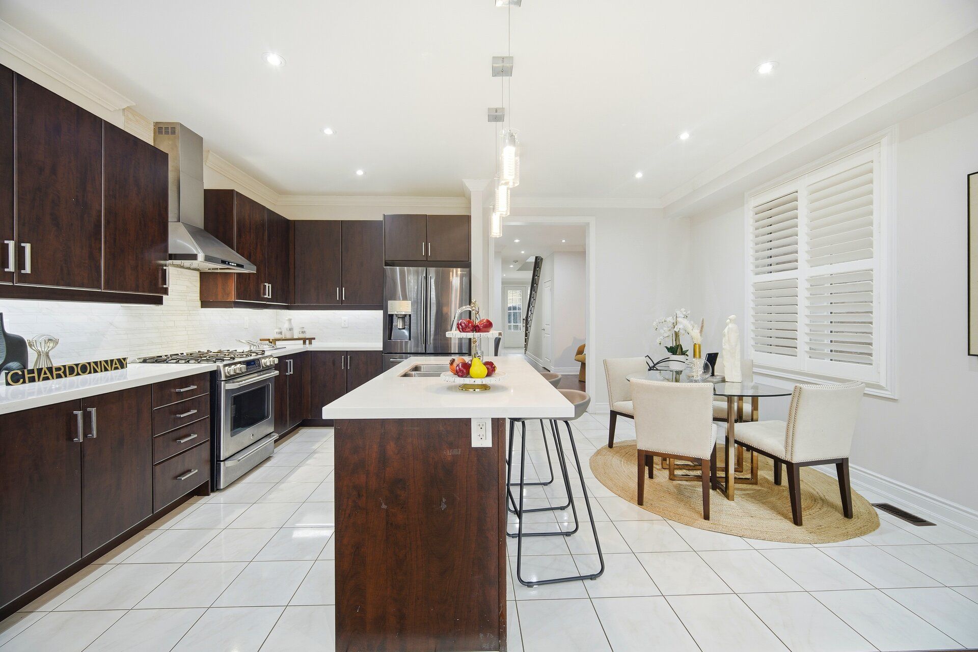 • Modern kitchen features quartz counters and stainless steel appliances.