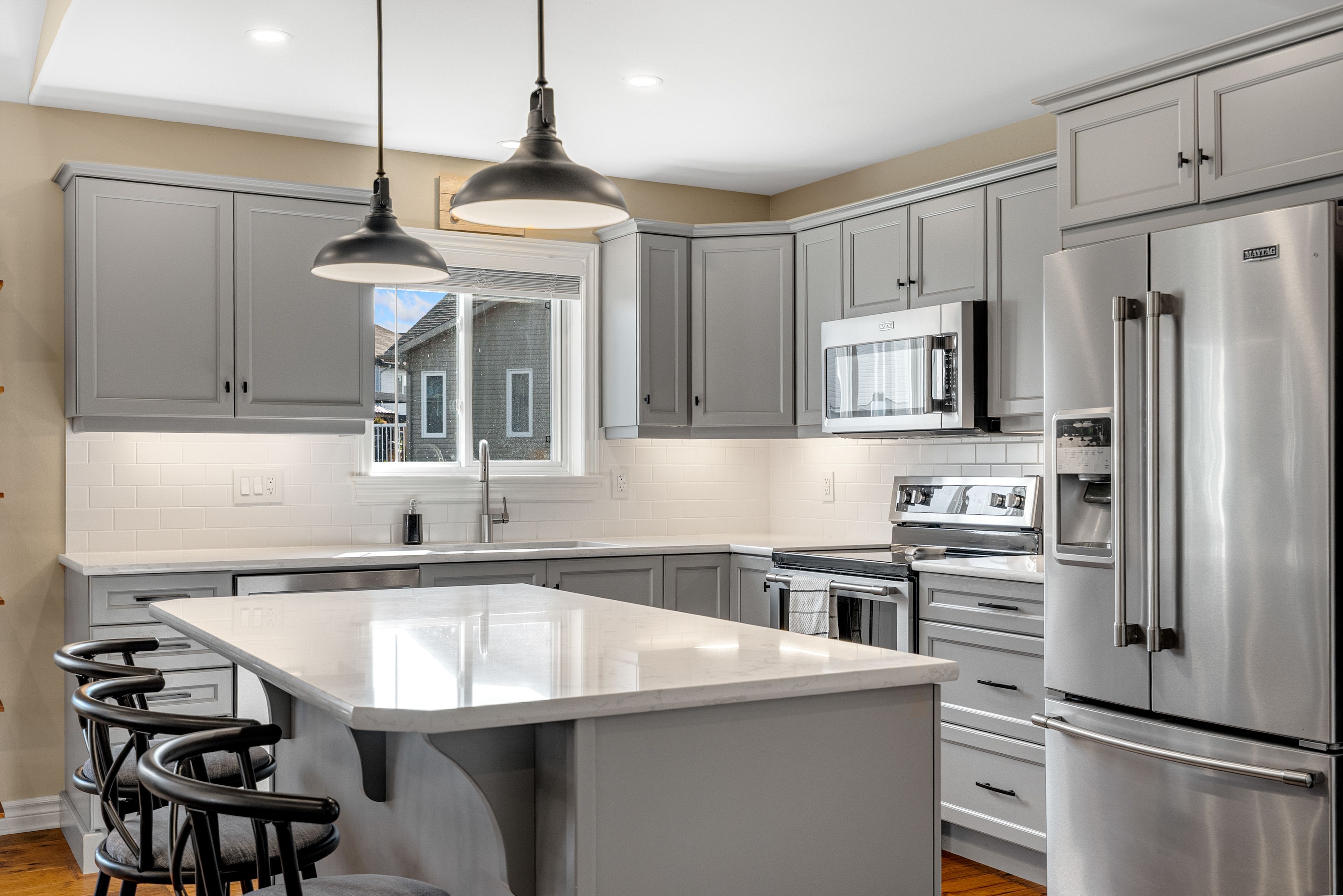 • Stylish Deslaurier kitchen with granite countertops and stainless-steel appliances.