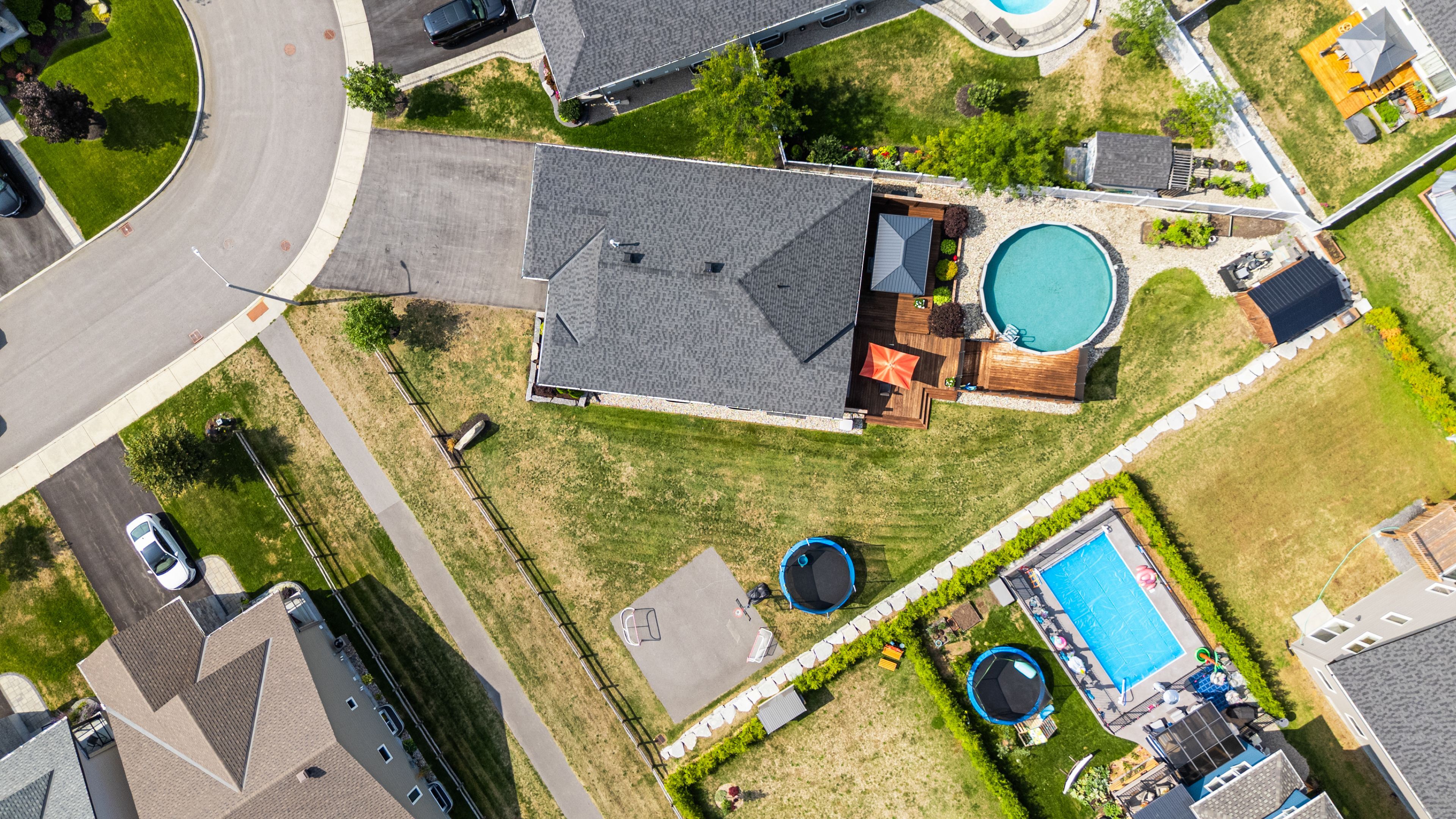 • Expansive backyard features multi-level decks, a pool, and sports area.