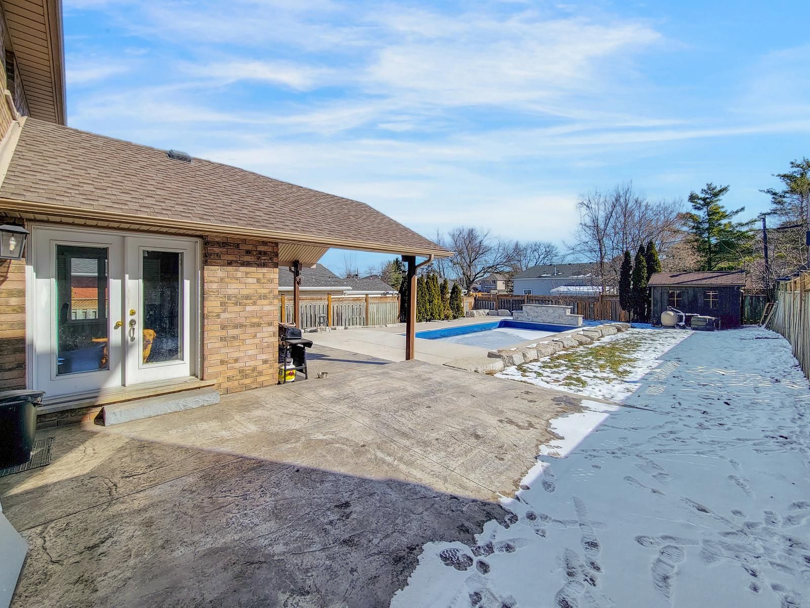 • Backyard features an in-ground pool, hot tub, and covered porch.