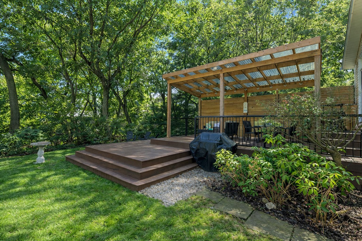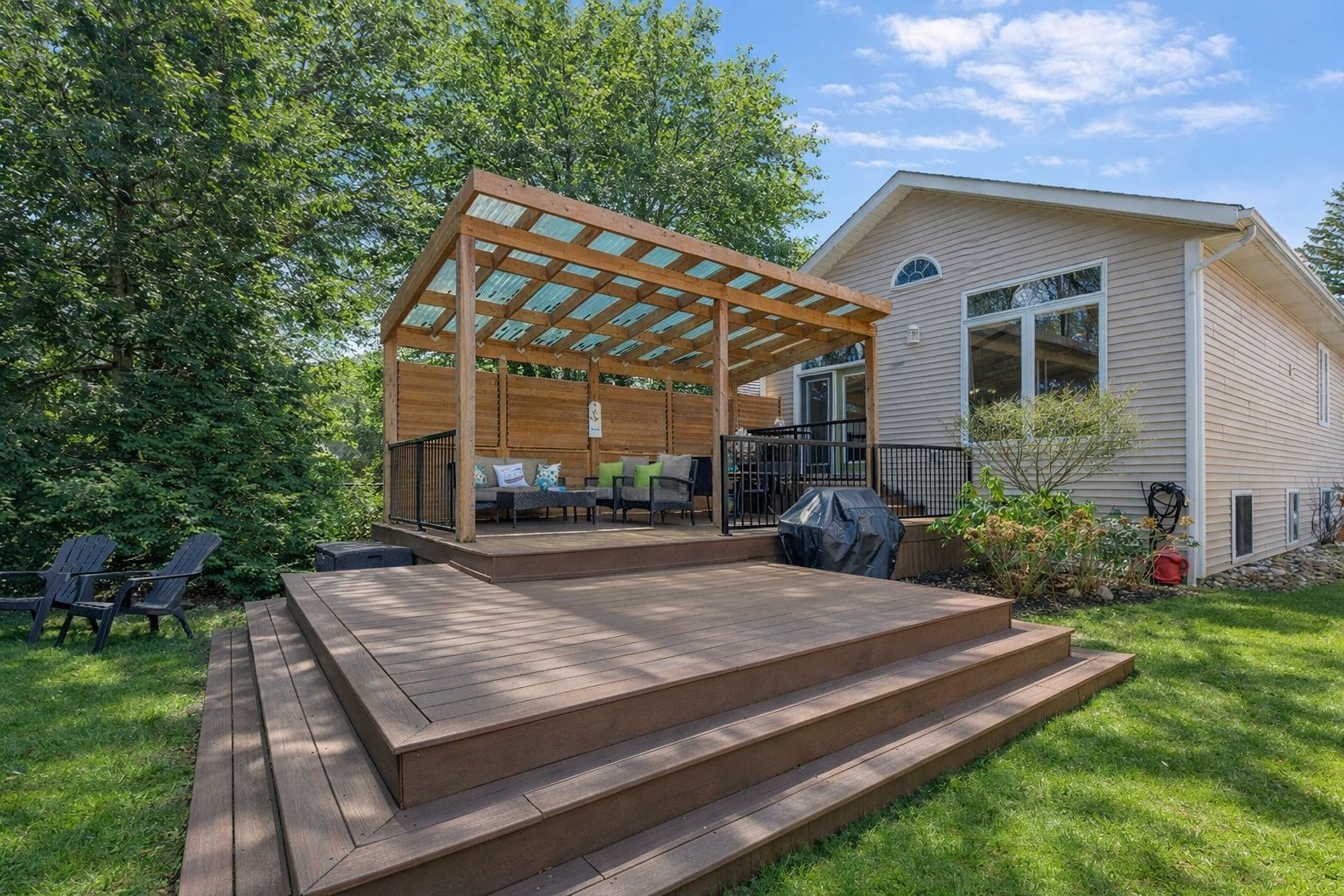• Custom three-tier Trex deck designed for outdoor living and entertaining.