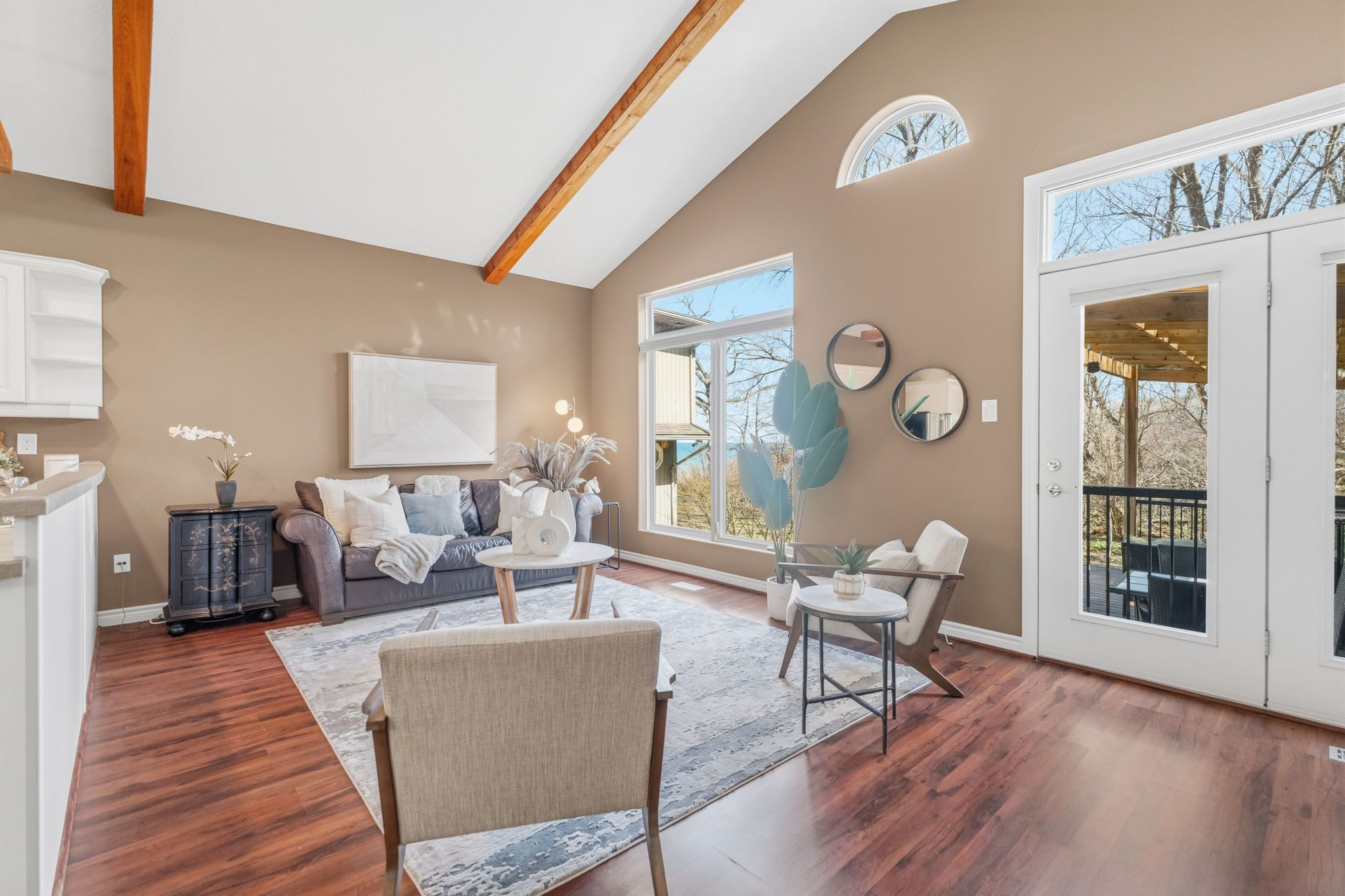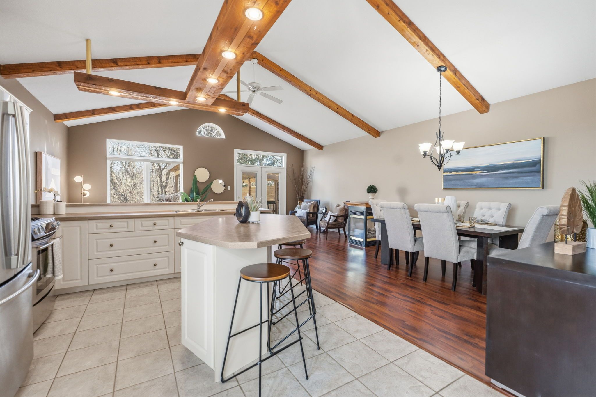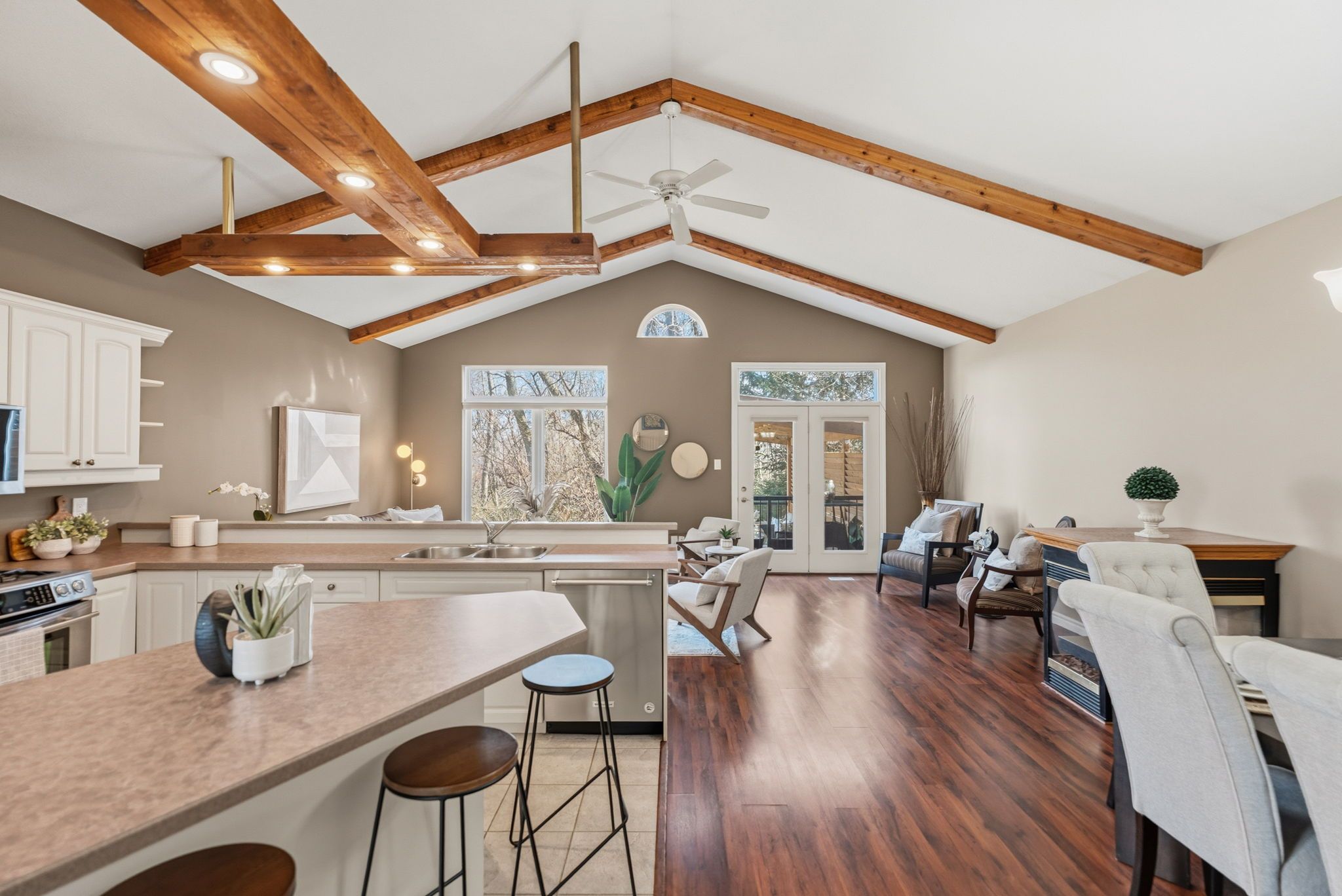 • Bright open-concept layout with vaulted ceilings and large windows.