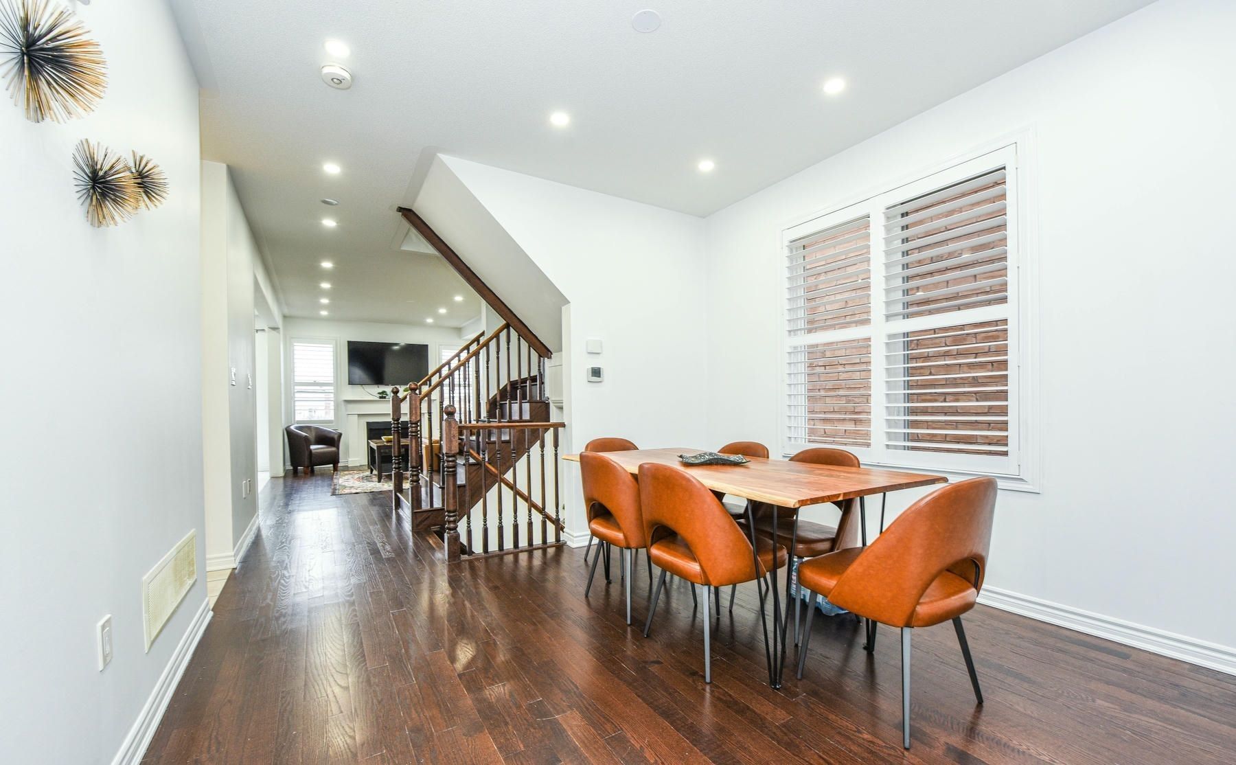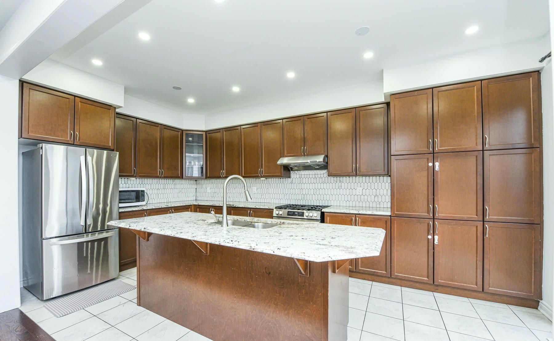 Stunning detached home main and upper level only ( no basement ) with an exceptionally rare layout! This beautiful property boasts 4 spacious bedrooms and 3 full bathrooms (two bedrooms have attached washrooms)on the second floor, complemented by 9-ft ceilings on the main level and hardwood floors throughout. The chef's delight kitchen includes granite counters, stainless steel appliances, a stylish backsplash, and a walk-out to a backyard overlooking a tranquil pond. The primary bedroom features a 5-piece ensuite and walk-in closet, while the 2nd bedroom also has its own 4-piece ensuite. Two additional bedrooms share a generous 4-piece bath. Upgraded oak hardwood stairs add elegance, and the home includes freshly applied new paint & a separate laundry on the main floor.