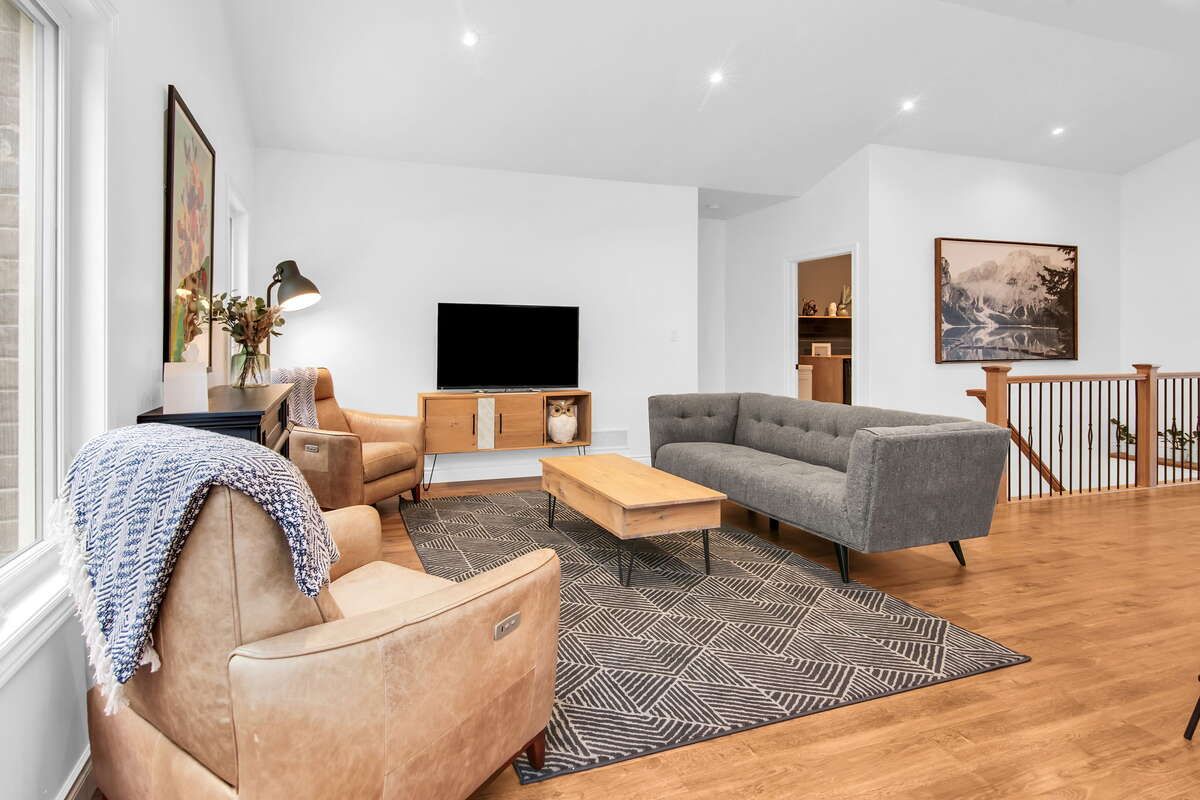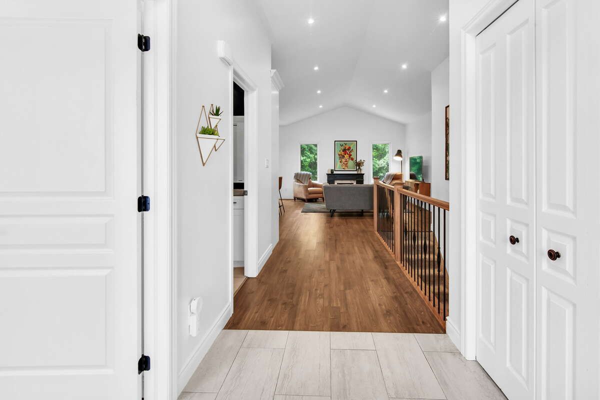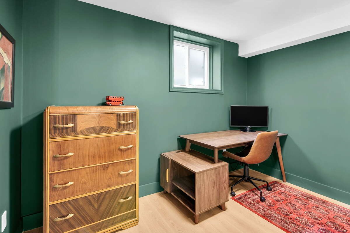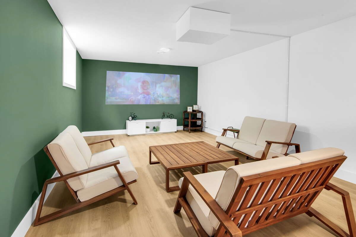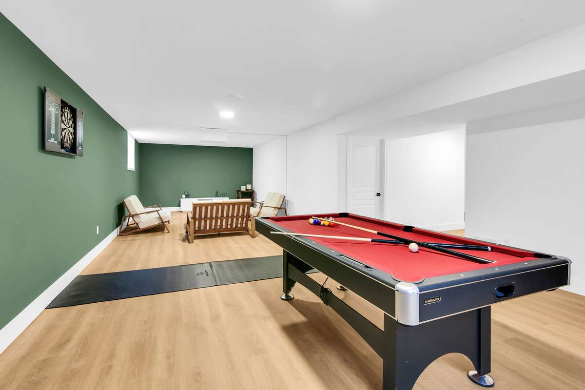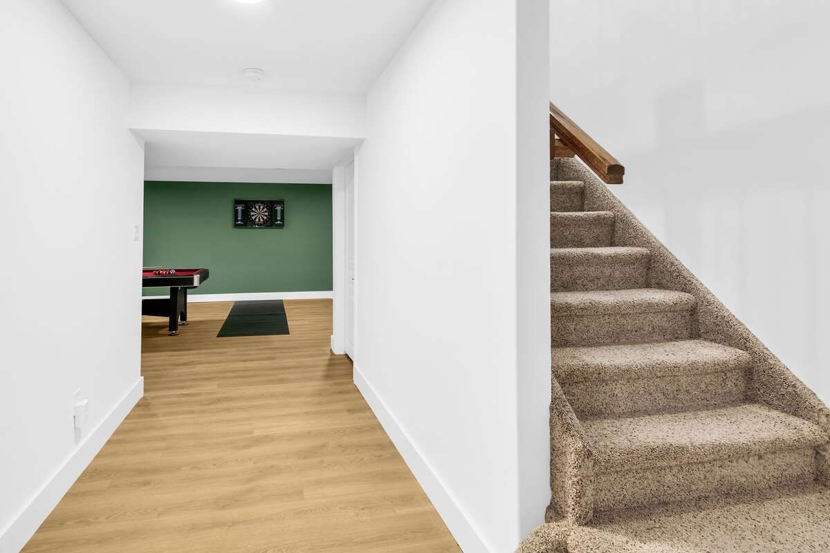 • Finished basement with modern flooring and built-in projector for movie nights.