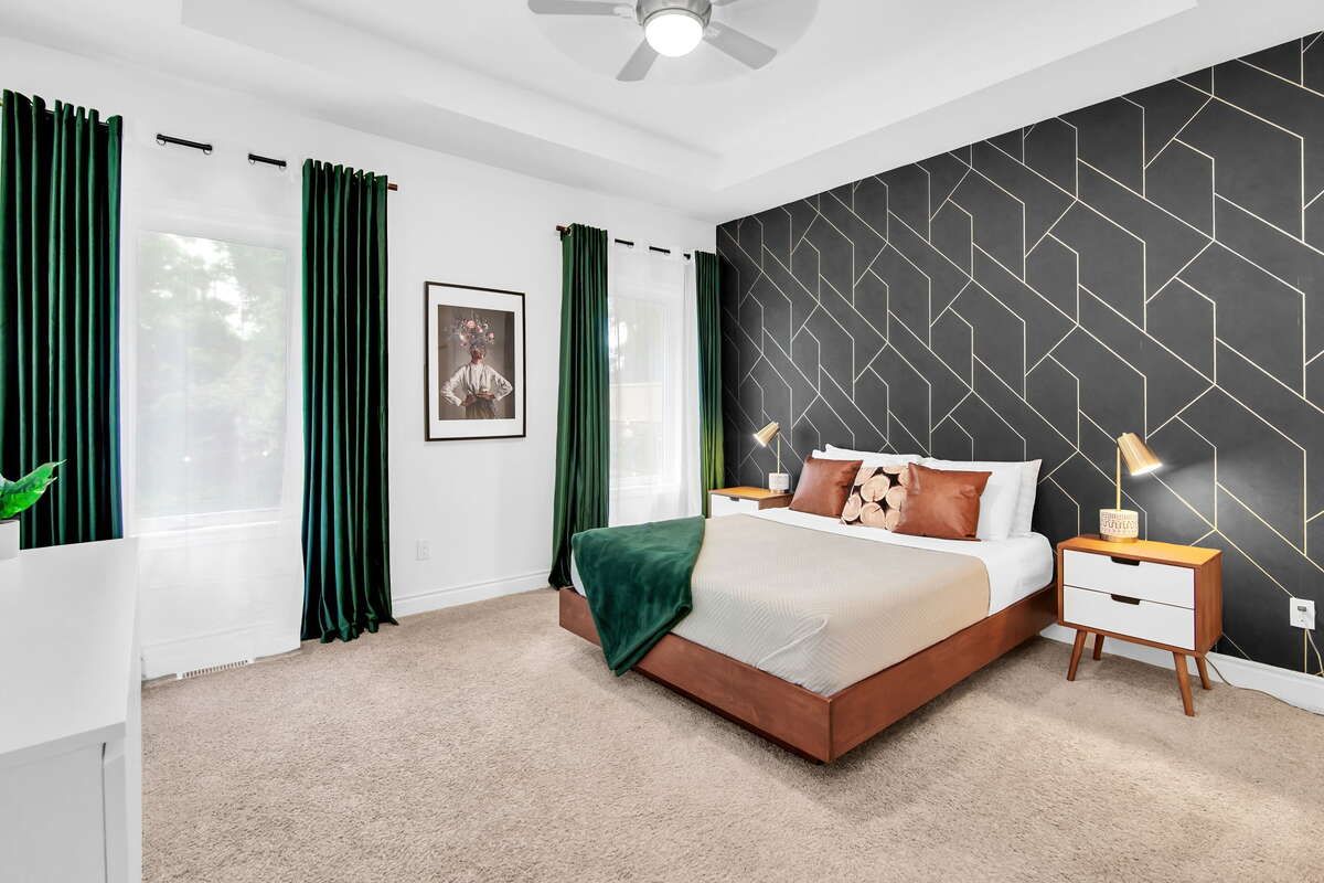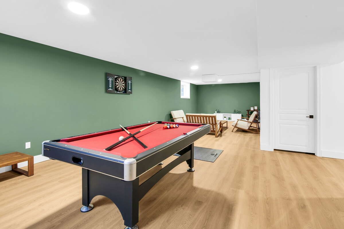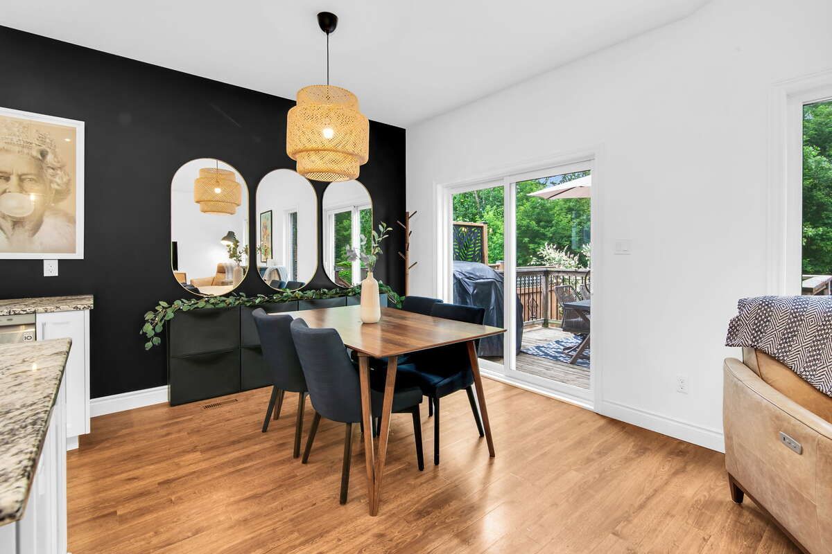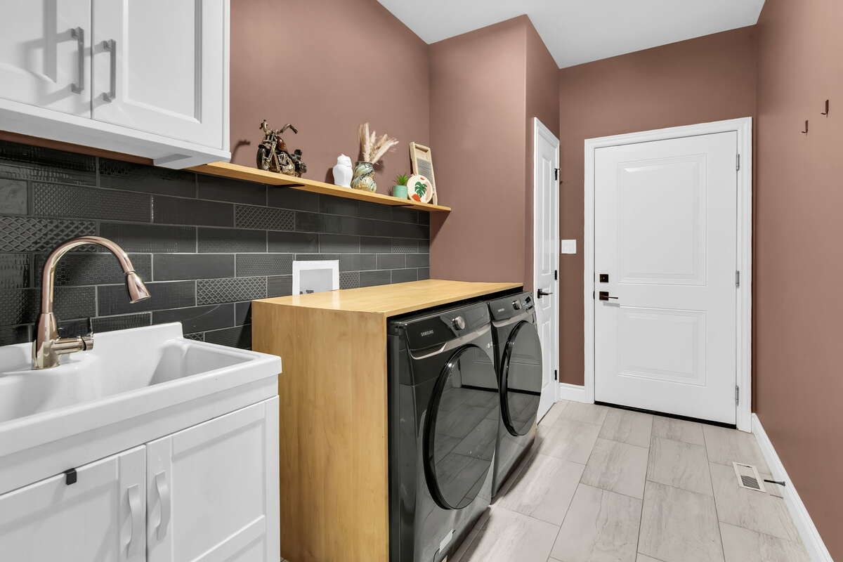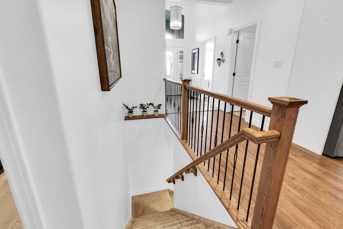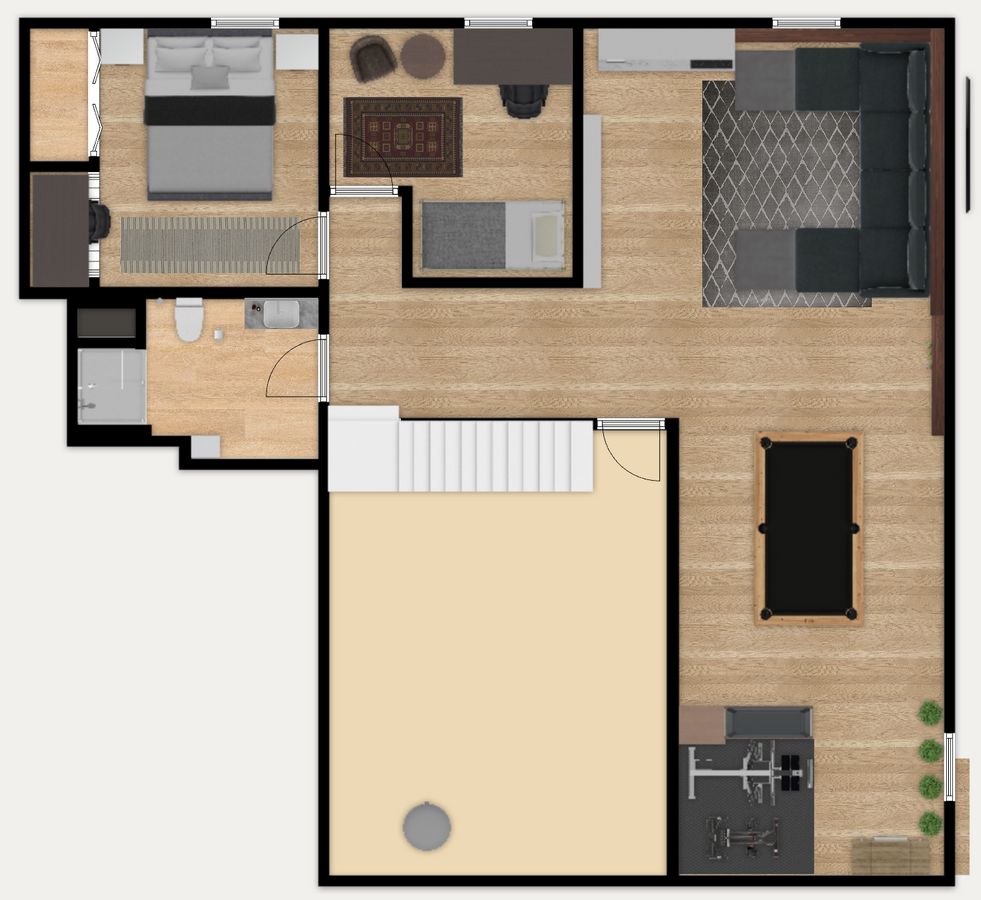 • Finished basement with modern flooring and built-in projector for movie nights.