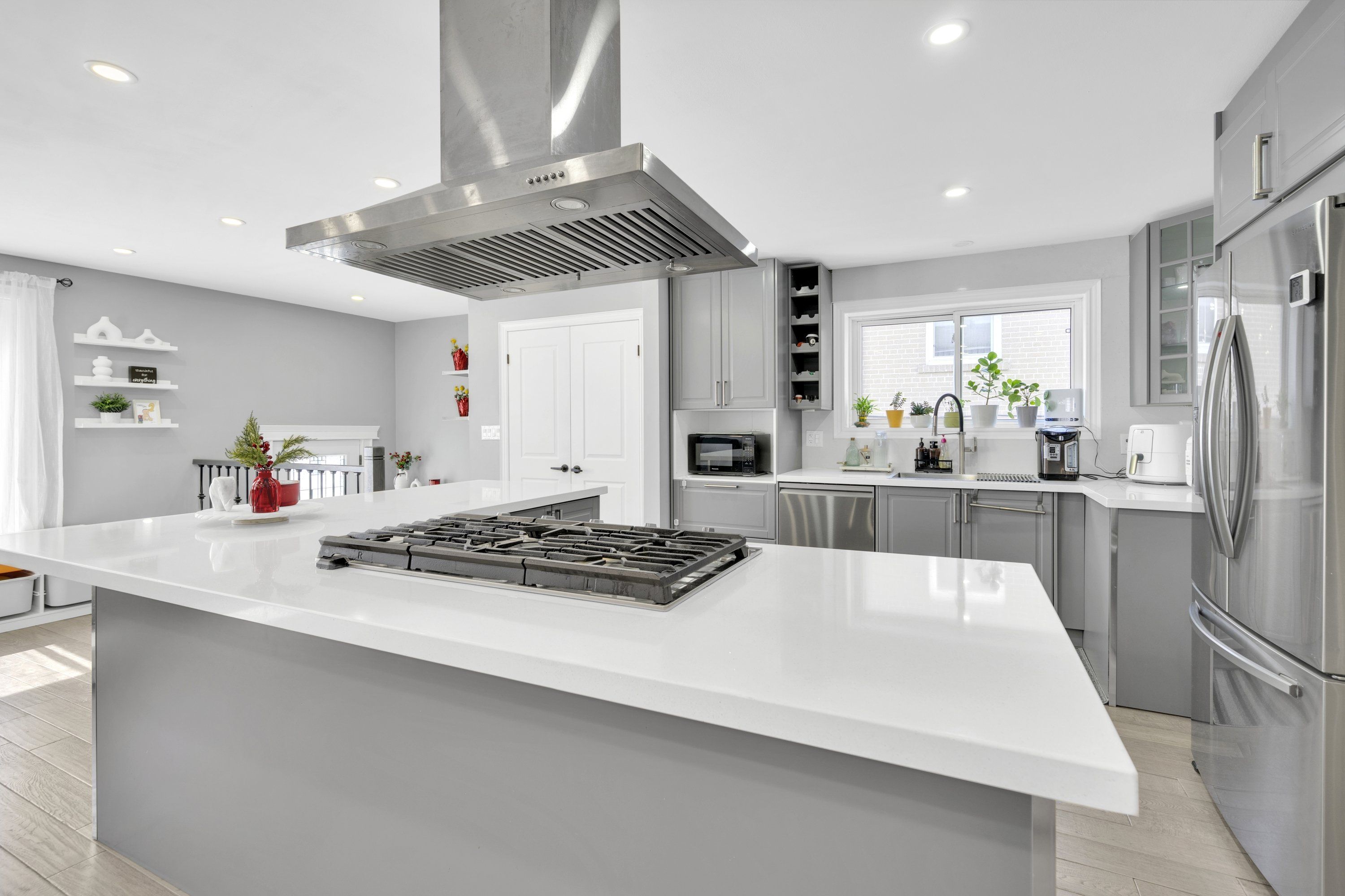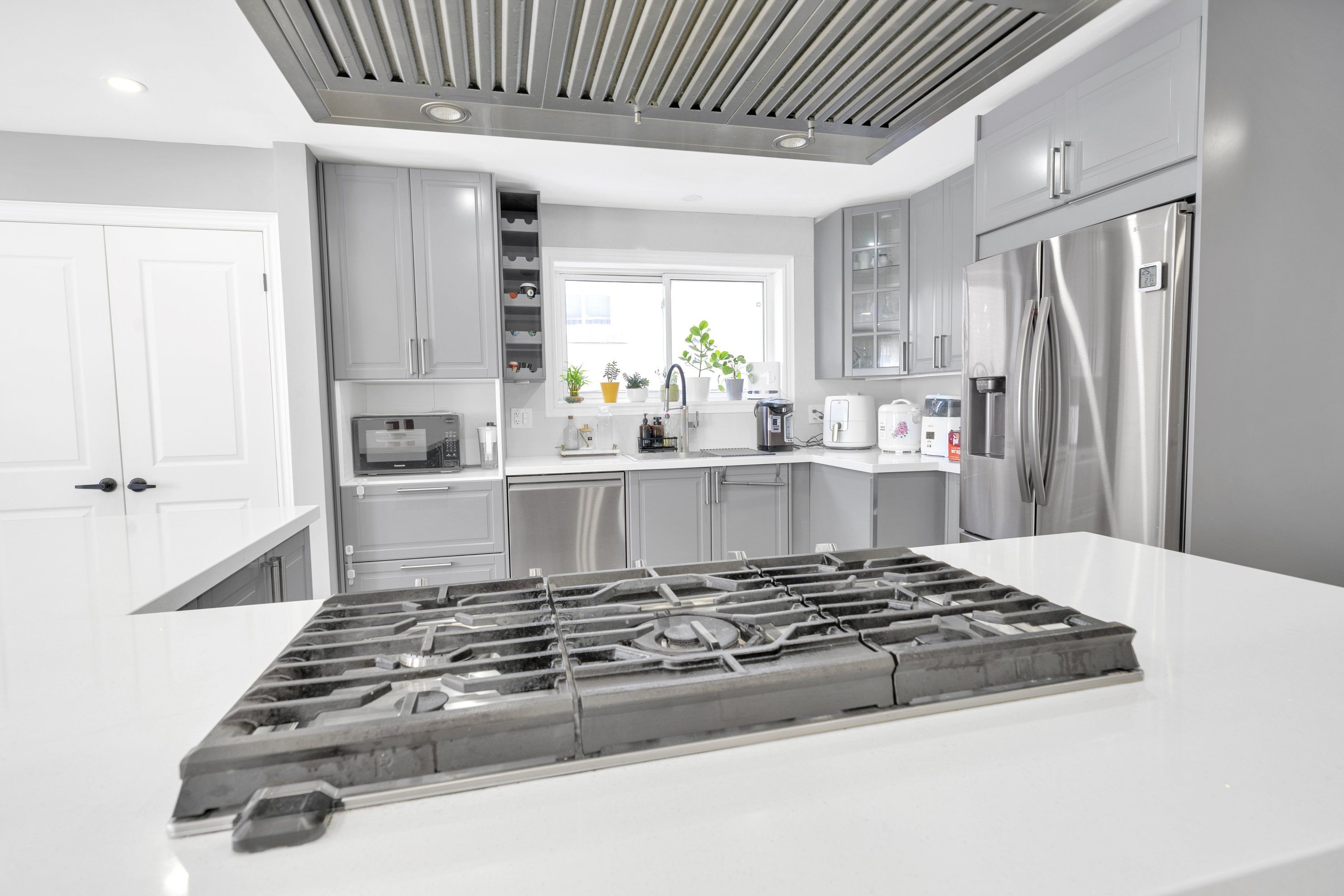 • Open concept kitchen featuring a large island and stainless steel appliances.