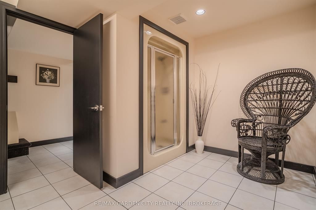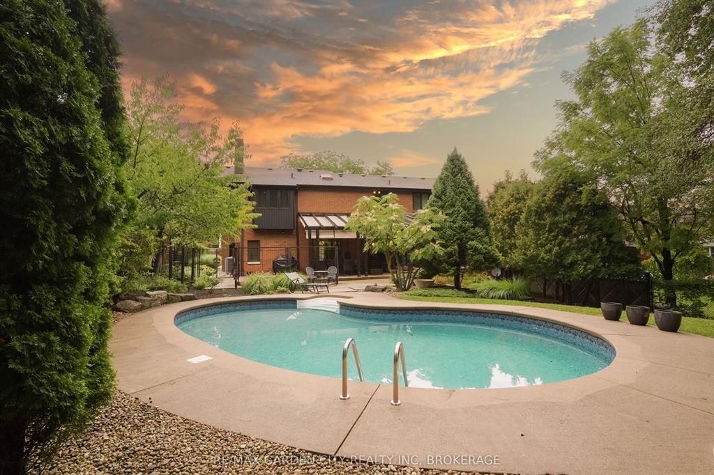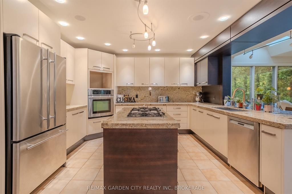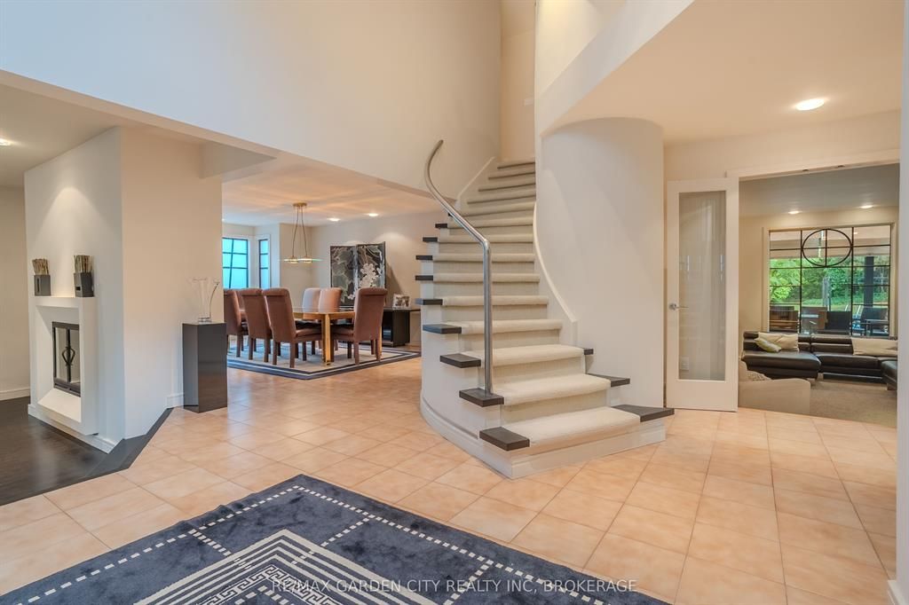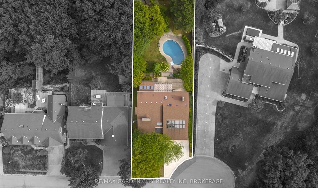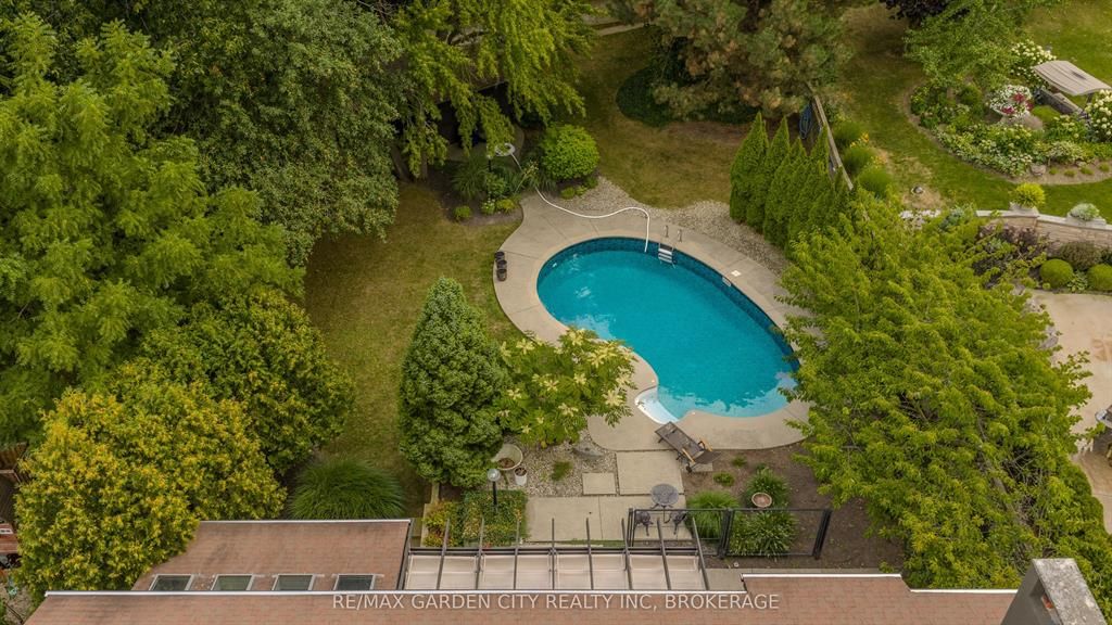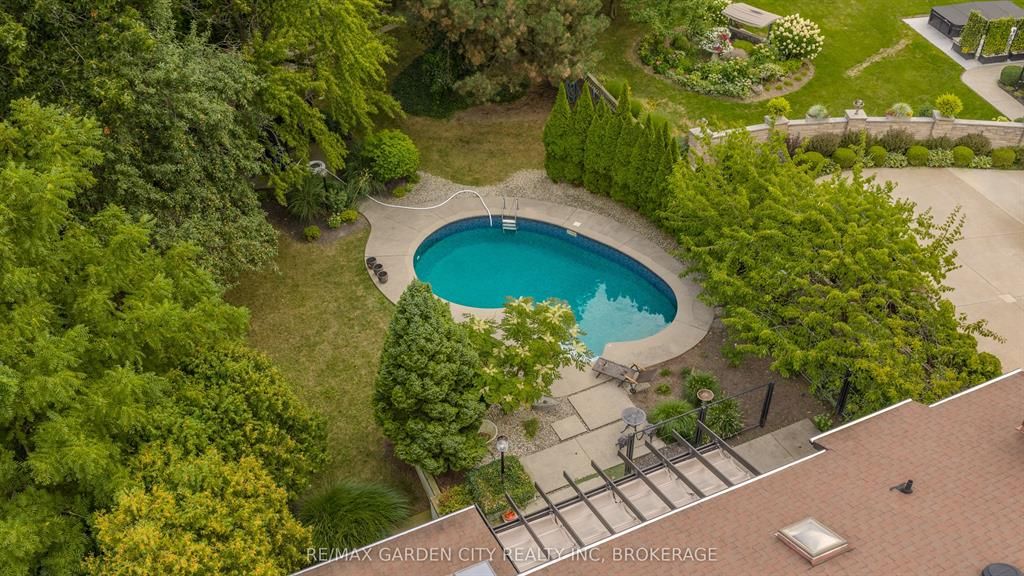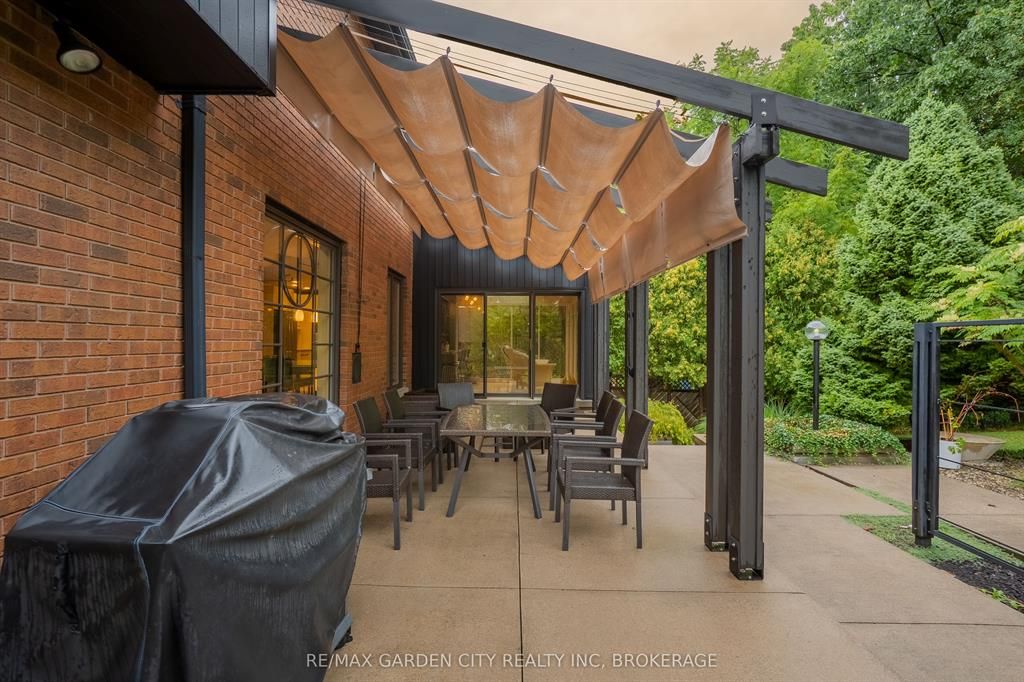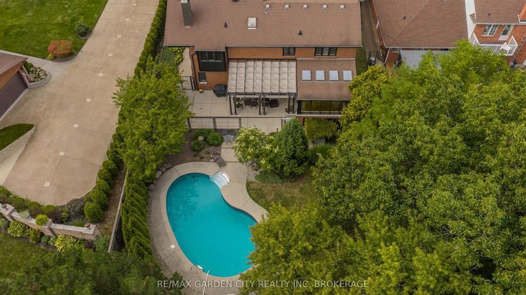 Welcome to 86 tremont drive, a one-of-a-kind residence on one of st. Catharines most desirable streets. Nestled near the top of the niagara escarpment in the sought-after south end, this prime cul-de-sac location backs onto protected greenspace with access to scenic walking trails. The private, mature lot features a backyard retreat with inground pool, patio with trellis, cedar sauna, and bocce court. This striking two-storey brick home offers over 3200 sq ft of living space, a finished 2-car garage with tile floor and drain, and a modern exterior with upgraded black windows and glass-paneled garage doors. A grand foyer welcomes you with an open-tread staircase and custom stainless-steel railing. The sunken living room with hardwood floors and two-sided gas fireplace opens to a formal dining room, while the refaced kitchen with flat-panel cabinetry and granite counters flows into a custom solarium with patio doors to the backyard. A sunken family room with gas fireplace, dramatic powder room, and laundry with garage access complete the main floor. Upstairs, three bedrooms include two secondary bedrooms with ample storage and a shared bath, plus a dramatic primary suite with custom built-ins, black granite tile, private sitting room with skylights, and spa-like ensuite with soaker tub, bidet, and walk-through dressing area. The fully finished lower level adds a rec room with gas fireplace, wet bar, walk-out to the backyard, bath, storage, and cold cellar. Designed by renowned john kazmir, this home blends mid-century influence with bold custom features, offering a rare combination of exceptional location, architectural presence, and private outdoor oasis.