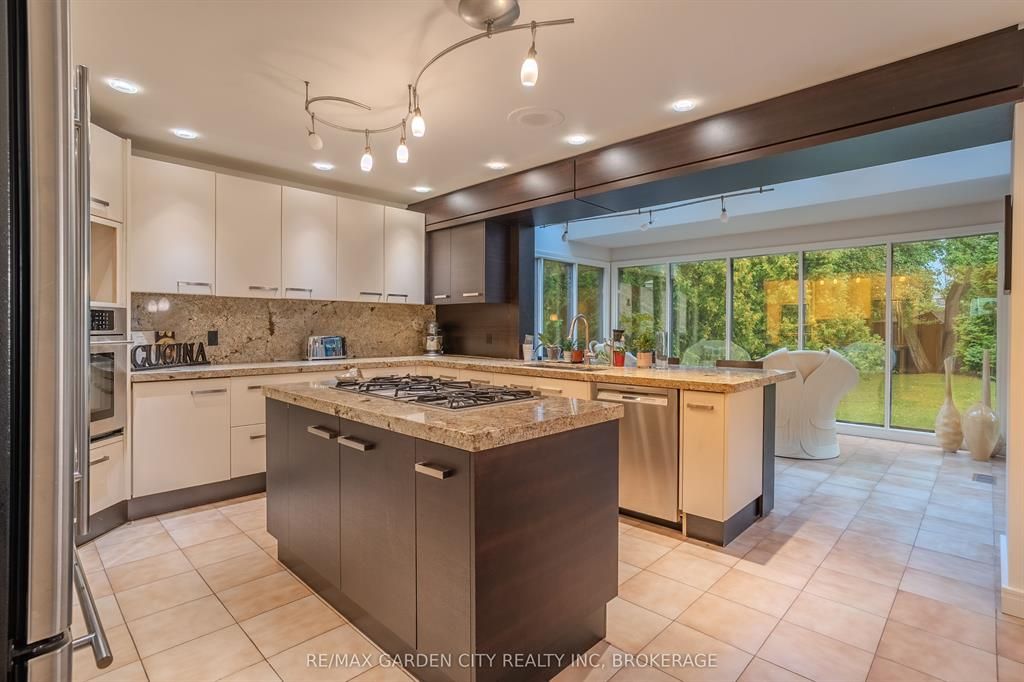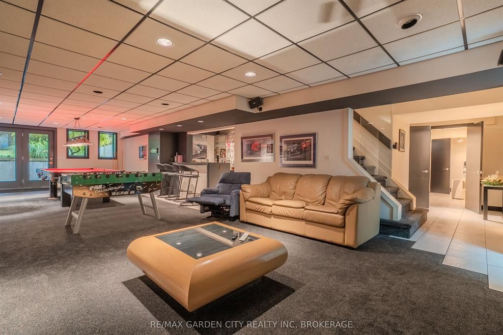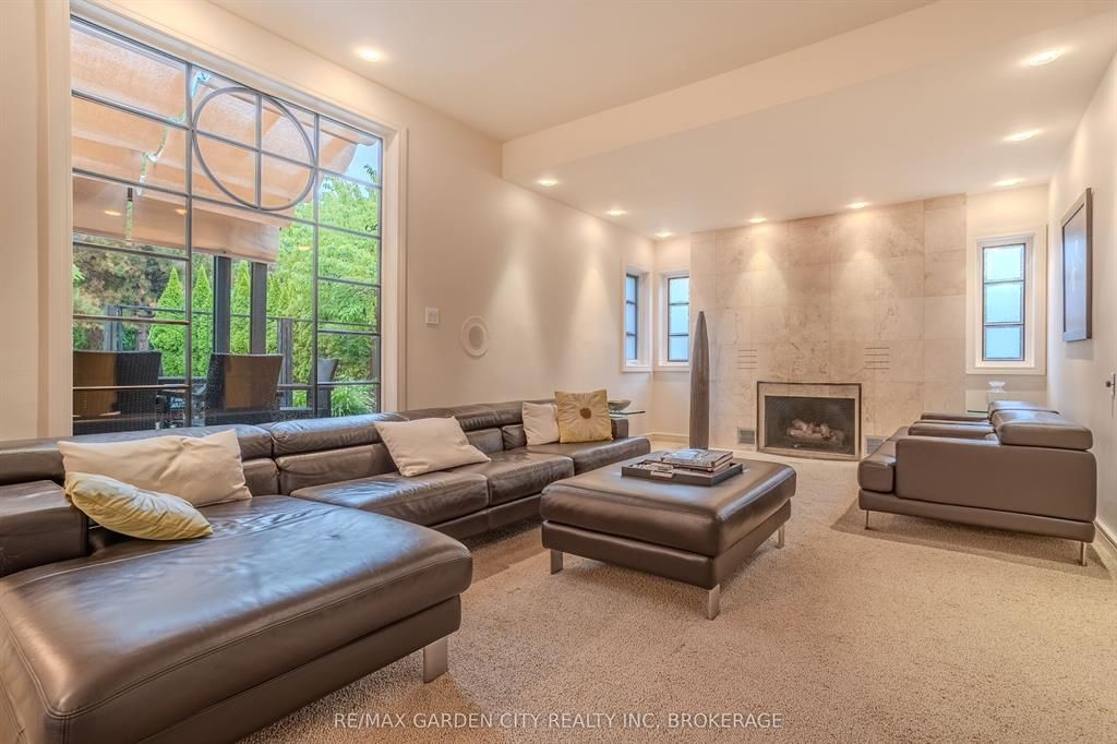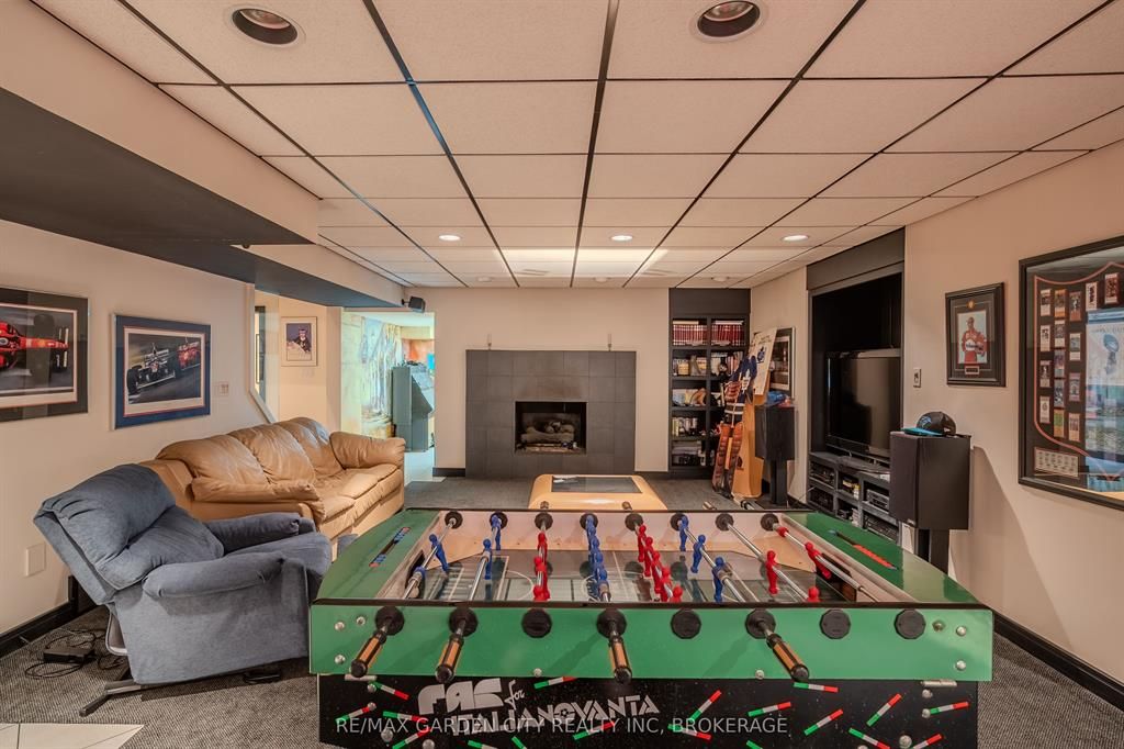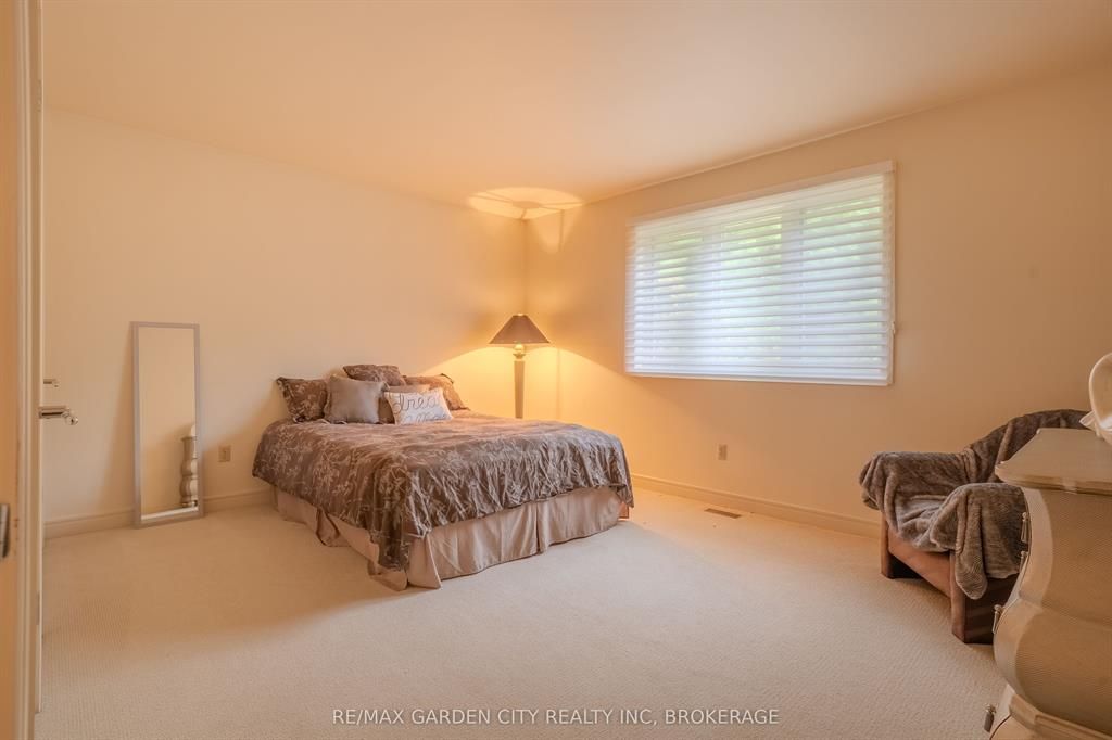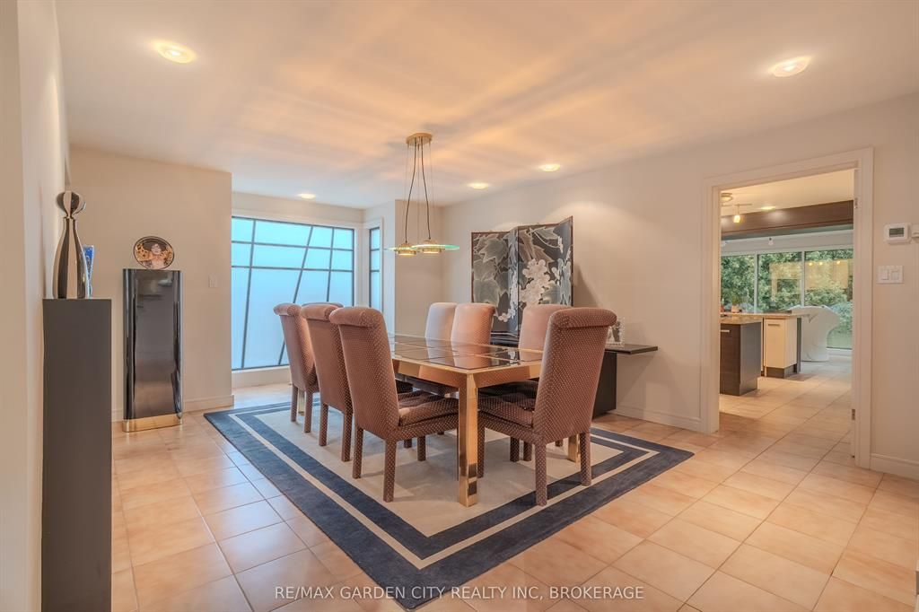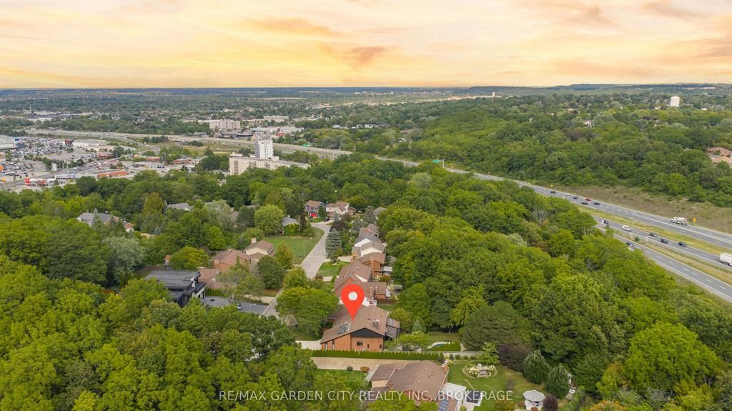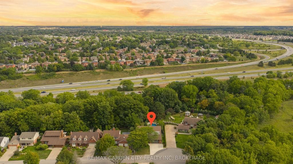 Welcome to 86 tremont drive, a one-of-a-kind residence on one of st. Catharines most desirable streets. Nestled near the top of the niagara escarpment in the sought-after south end, this prime cul-de-sac location backs onto protected greenspace with access to scenic walking trails. The private, mature lot features a backyard retreat with inground pool, patio with trellis, cedar sauna, and bocce court. This striking two-storey brick home offers over 3200 sq ft of living space, a finished 2-car garage with tile floor and drain, and a modern exterior with upgraded black windows and glass-paneled garage doors. A grand foyer welcomes you with an open-tread staircase and custom stainless-steel railing. The sunken living room with hardwood floors and two-sided gas fireplace opens to a formal dining room, while the refaced kitchen with flat-panel cabinetry and granite counters flows into a custom solarium with patio doors to the backyard. A sunken family room with gas fireplace, dramatic powder room, and laundry with garage access complete the main floor. Upstairs, three bedrooms include two secondary bedrooms with ample storage and a shared bath, plus a dramatic primary suite with custom built-ins, black granite tile, private sitting room with skylights, and spa-like ensuite with soaker tub, bidet, and walk-through dressing area. The fully finished lower level adds a rec room with gas fireplace, wet bar, walk-out to the backyard, bath, storage, and cold cellar. Designed by renowned john kazmir, this home blends mid-century influence with bold custom features, offering a rare combination of exceptional location, architectural presence, and private outdoor oasis.