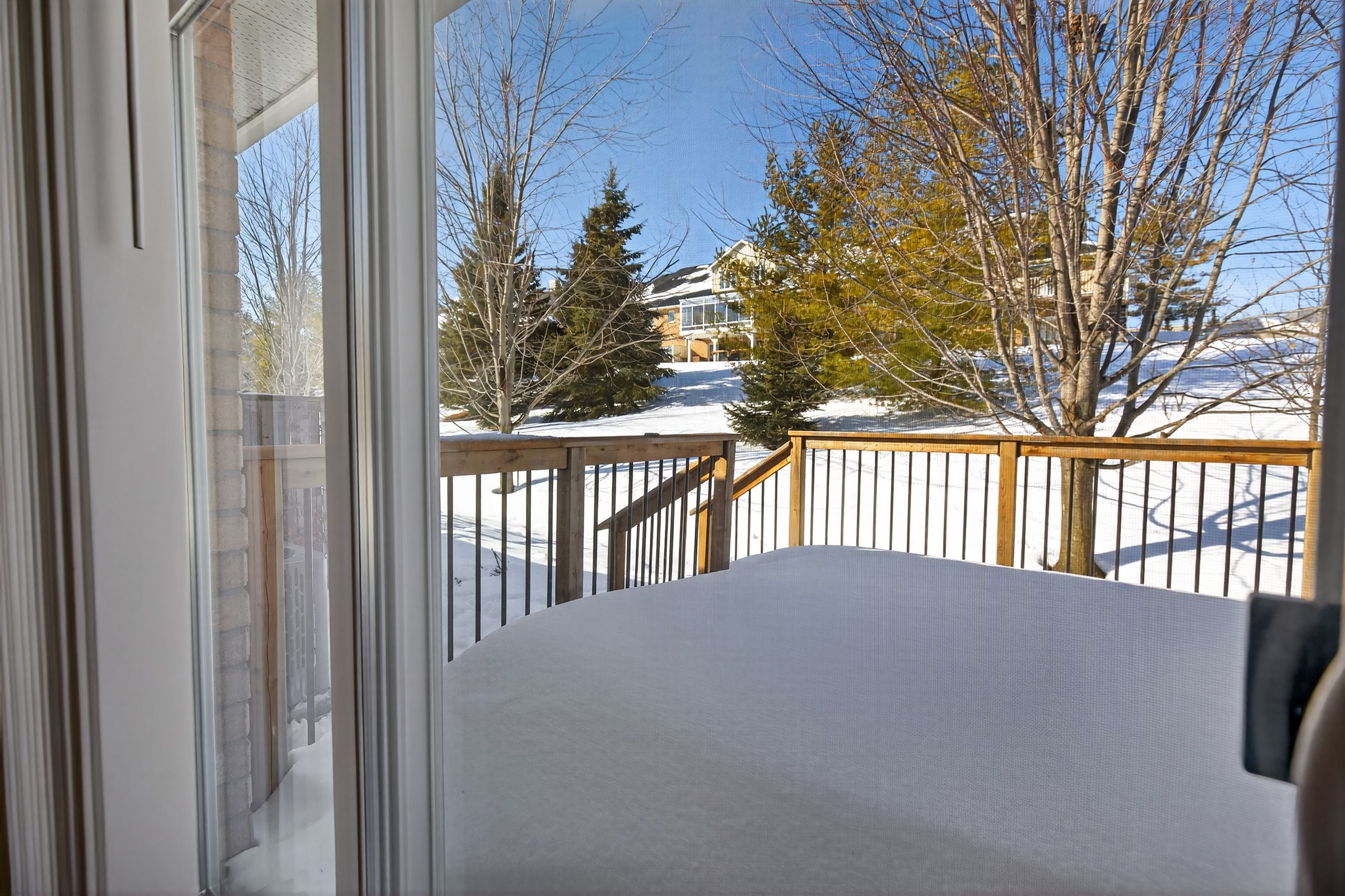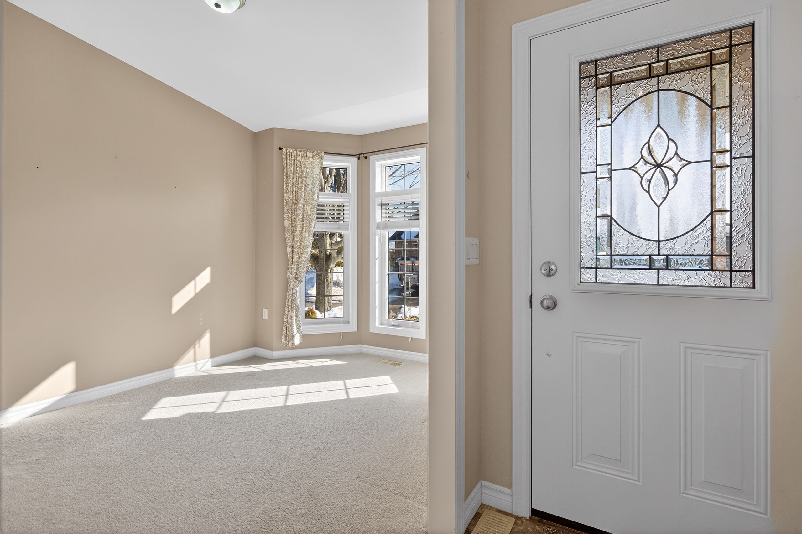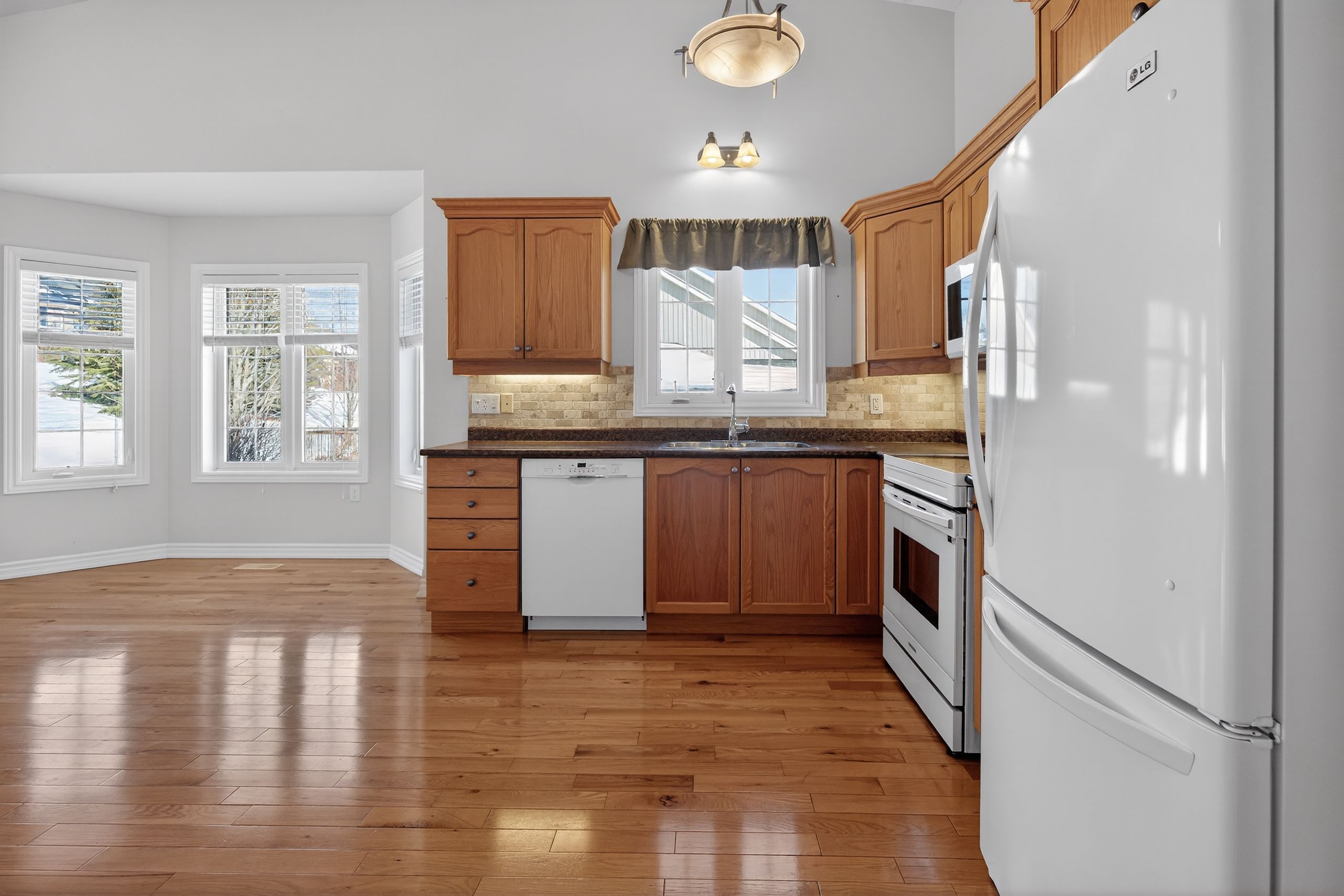 Beautiful bungalow-style home featuring soaring vaulted ceilings and an expansive open-concept living room and dining room with gleaming hardwood floors throughout the main living space. Oversized windows fill the home with natural light, creating a bright and airy atmosphere and a welcoming flow throughout. Spacious kitchen with ample cabinetry, tile backsplash, double sink, built-in microwave, dishwasher, refrigerator and stove overlooking the main living area, ideal for entertaining with ease or comfortable everyday living. Walk-out from the living room to a private elevated deck overlooking open green space with no direct rear neighbours, offering peaceful views and added privacy. Generous primary bedroom with large walk-in closet and plush broadloom designed for relaxed comfort. Well-appointed 3-piece bathroom with glass enclosed shower and extended vanity providing functional design. Convenient main floor laundry for everyday practicality. Full unfinished basement with excellent ceiling height, large windows and cold storage room presenting future development potential for additional living space, recreation room or bedrooms. Attached single-car garage with opener and interior access adds everyday convenience. A wonderful opportunity to enjoy open-concept living in a quiet setting close to amenities, parks and transit.