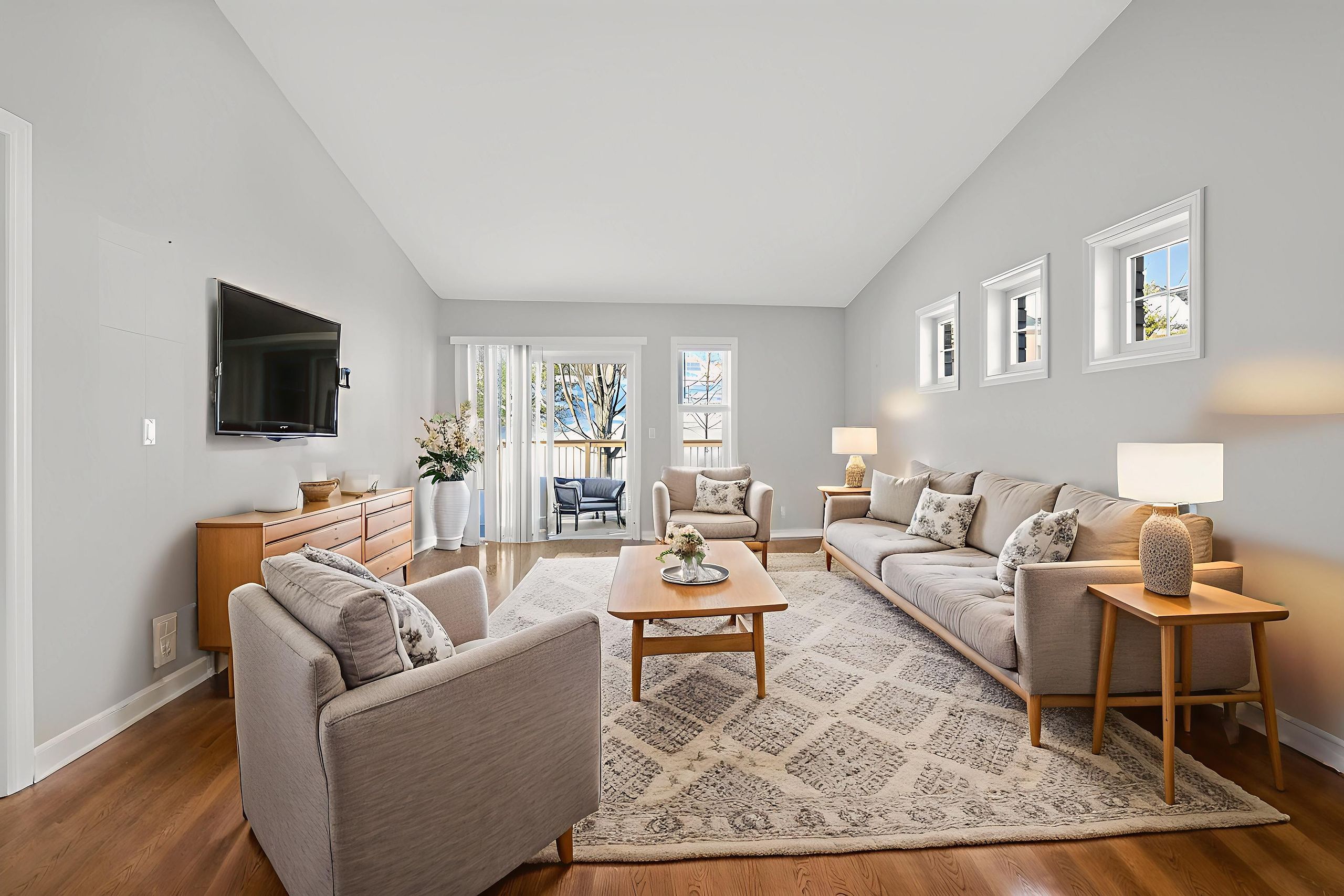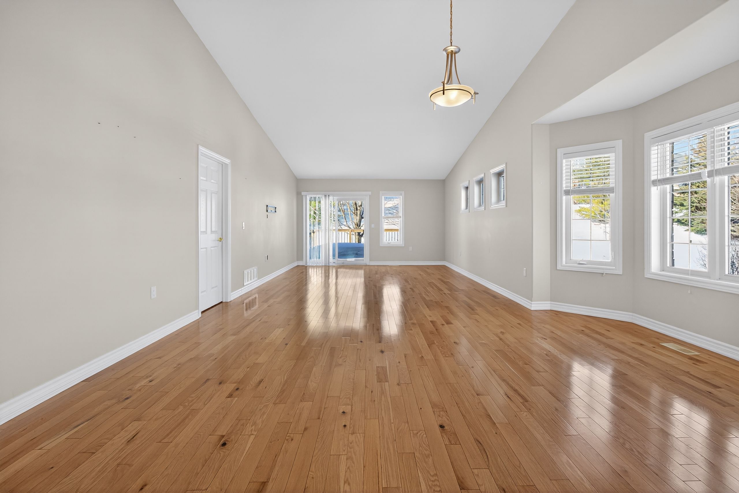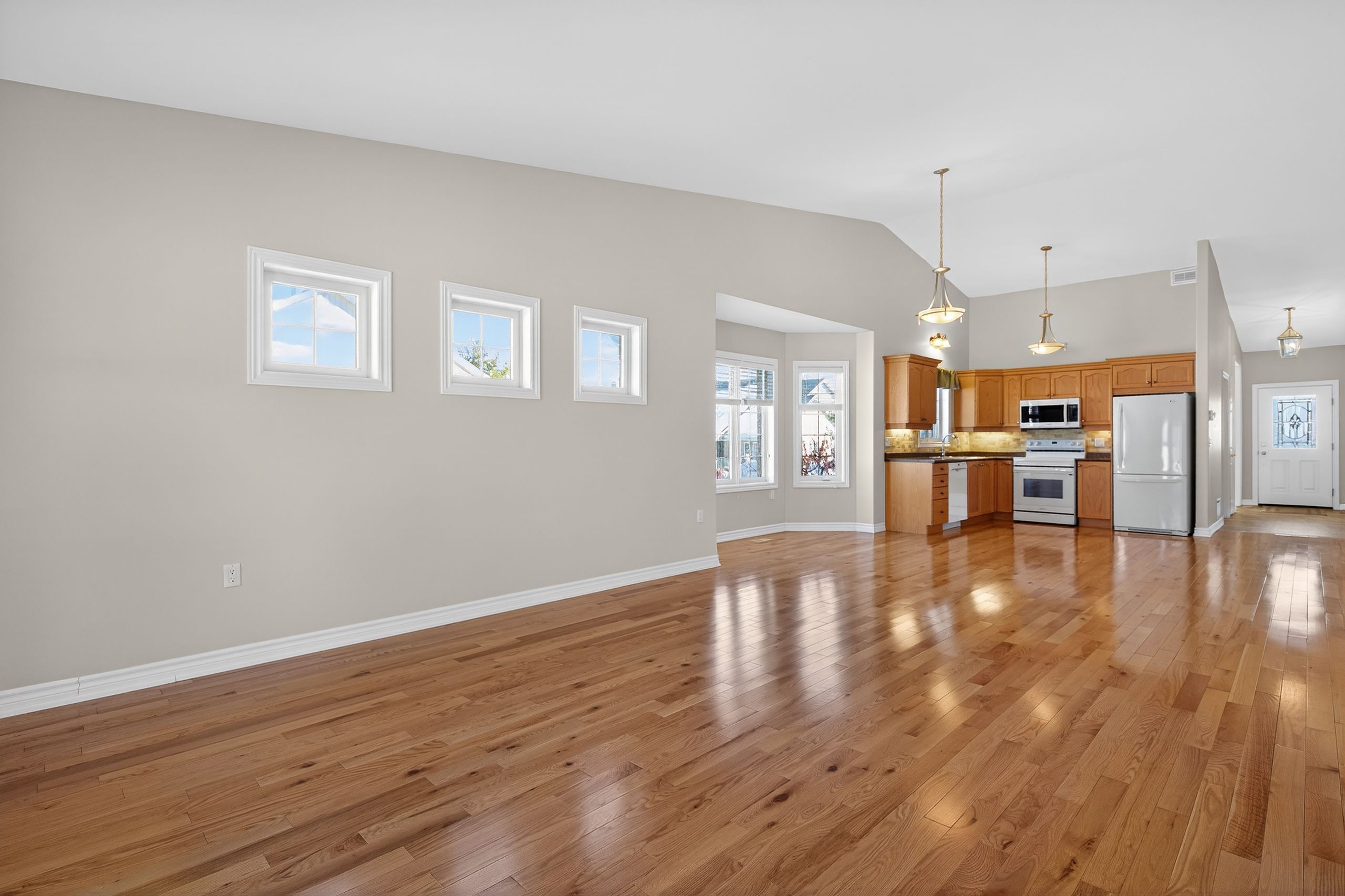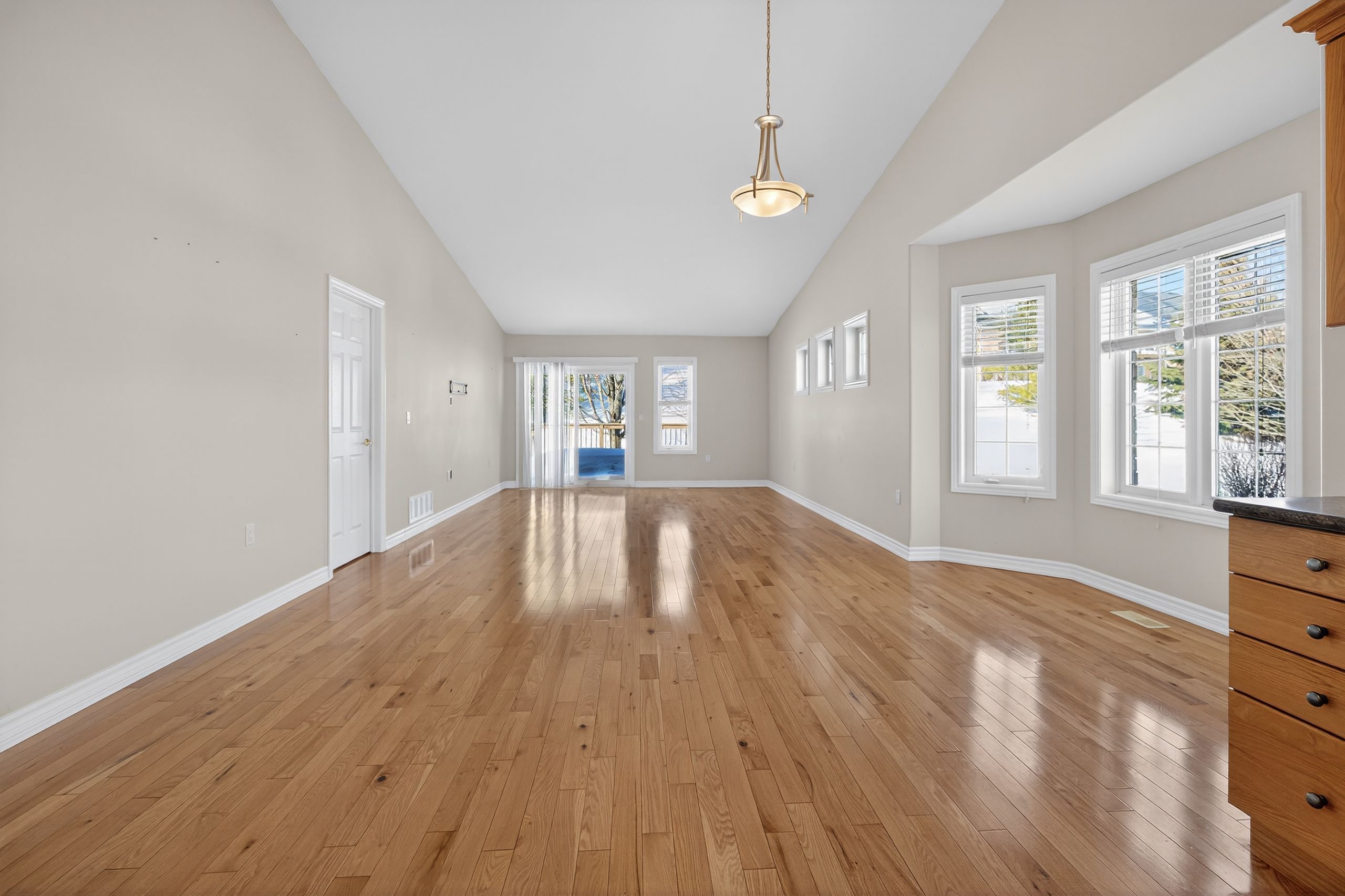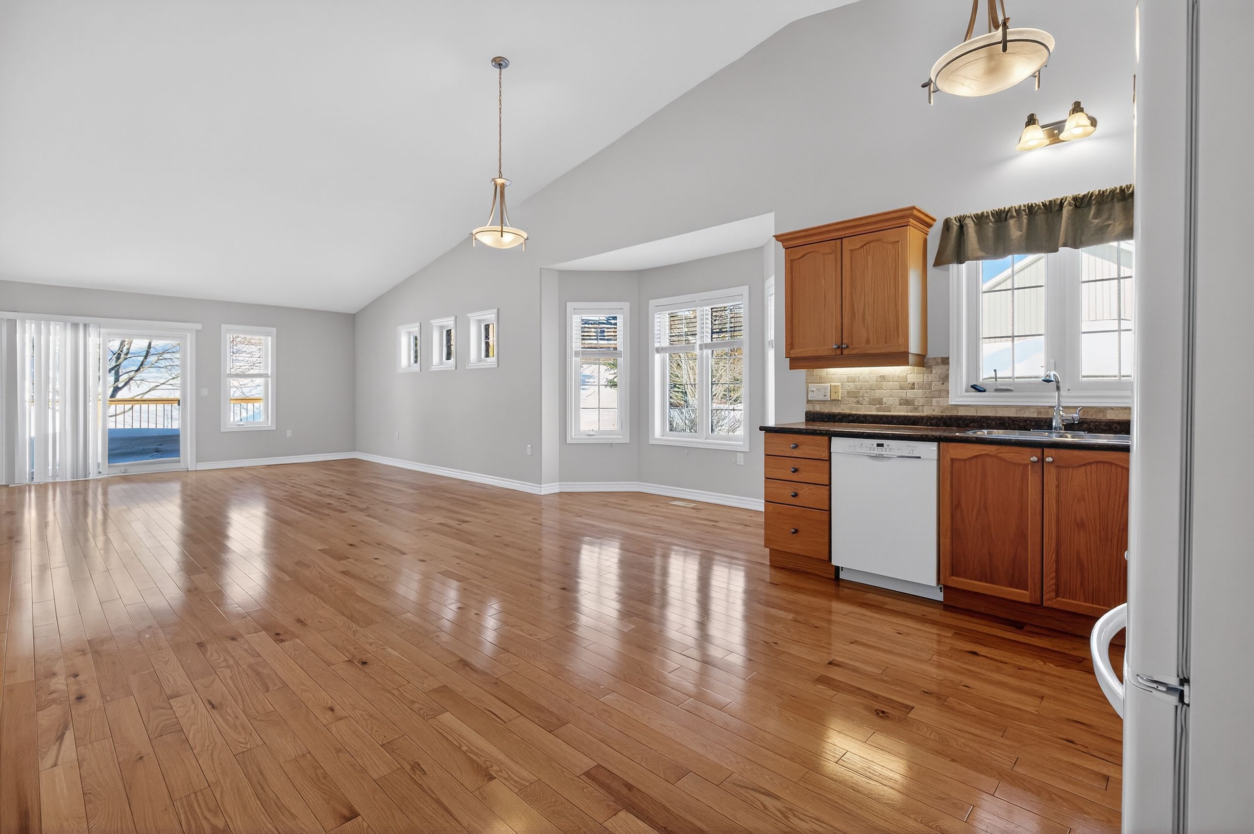 • Bungalow with vaulted ceilings and open-concept living and dining areas.