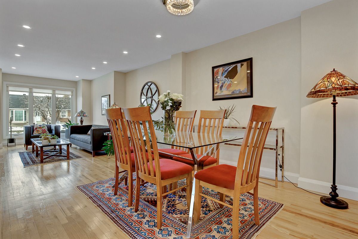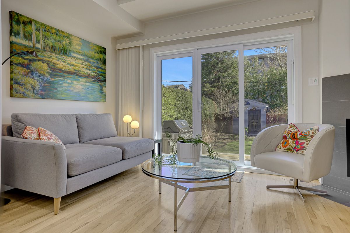 • Bright open-concept living area with floor-to-ceiling windows and hardwood floors.