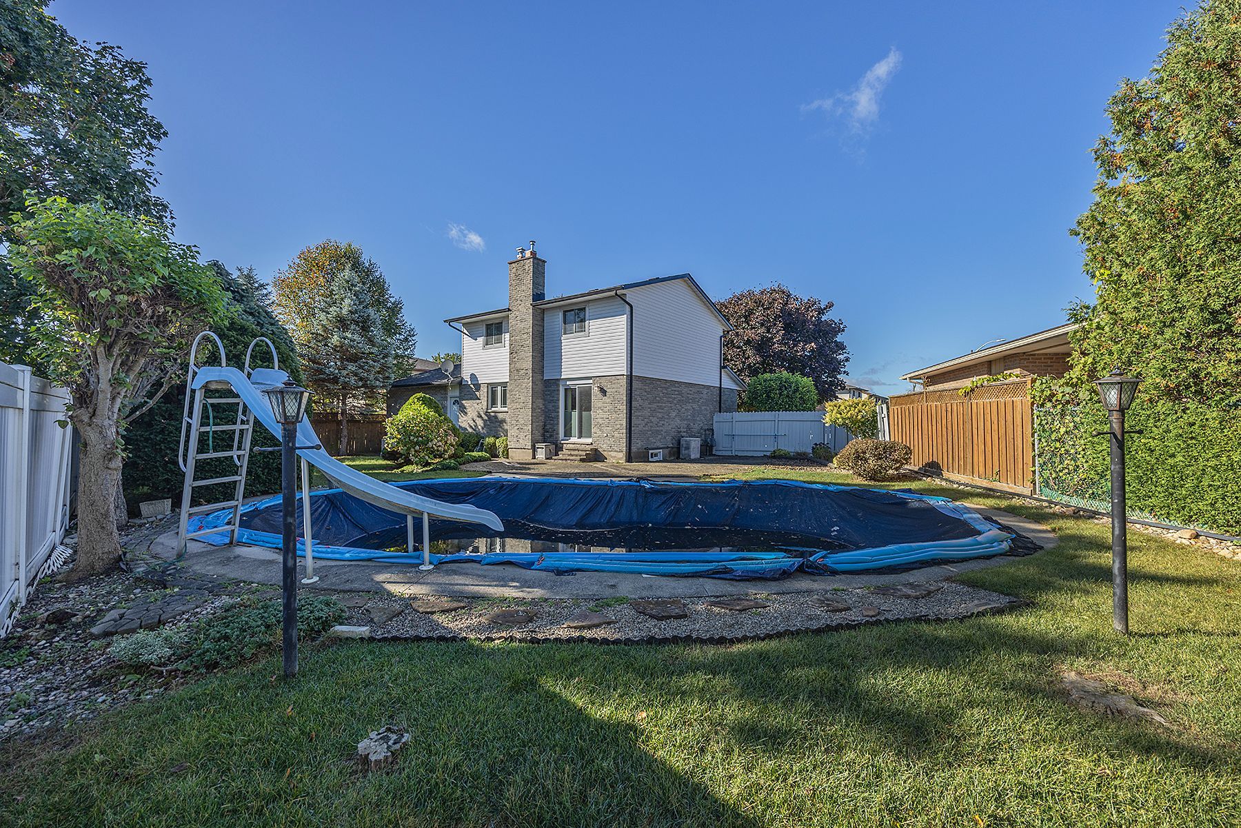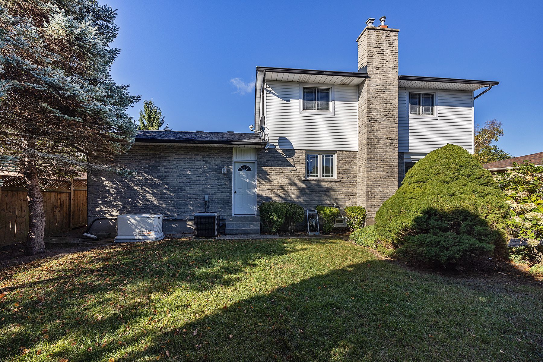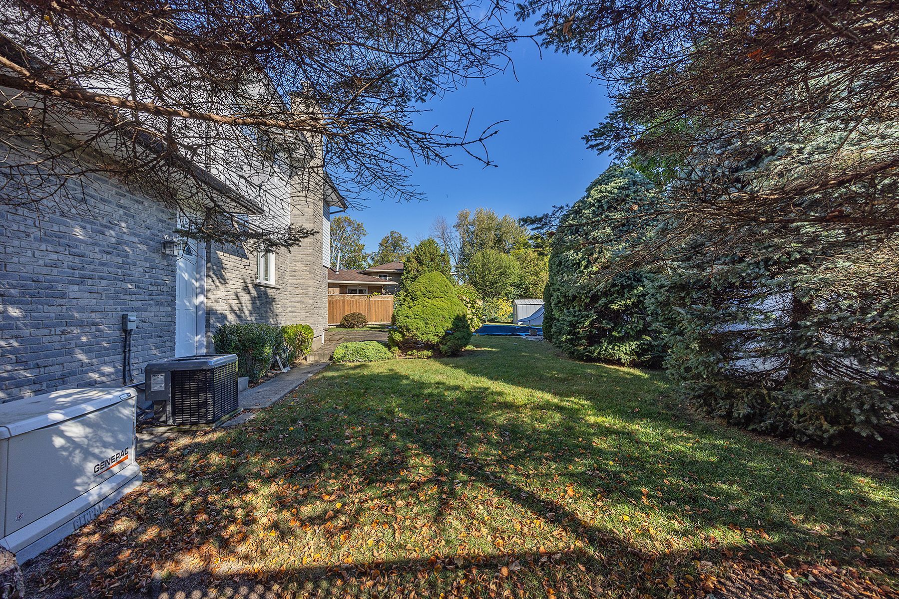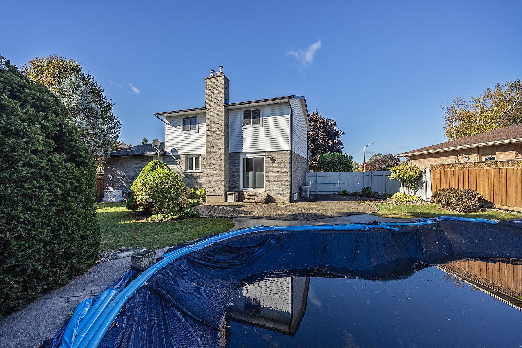 Please consider this: double-wide, extra-long, paved driveway (routinely sealed) with curbs and walkway, fully landscaped, a handsome exterior, large front porch, plenty of space to sit outside and sip your morning coffee. Oversized double car garage with inside entry to home, plus door to the backyard, room to park two cars, and still have a workshop and plenty of storage space, plus there's a change room. Why? For the inground pool, of course! Back to the main entrance... Step through the front door; perfectly sized foyer with coat closet, ceramic tile flooring, classic curved railing dresses up the stairs to second floor. Open concept living/dining with hardwood floors, and heres something i love: when you can see out both the front and back yard windows from your main living space. Classic kitchen with solid cabinetry, plenty of storage, recessed pantry, eat-in kitchen, fridge, stove, dishwasher included. Sink overlooks the lush and private backyard. Sliding patio doors from dining to interlock brick patio, kidney shaped in-ground pool with slide, and garden shed. Still plenty of grass for dogs to run, kids to play, and to garden. Upstairs 3 good sized bedrooms, full bathroom with updates. Main floor also has a two-piece bathroom... Now heading to basement... Fully finished basement with high ceilings, large rec room. Corner gas fireplace with brick surround, brand new bathroom with walk-in shower & glass doors. Bonus room for office/guest area/bar/kitchenette. Utility room with gas forced air furnace (2018), gas hot water tank, laundry sink and washer & dryer. Insulated vinyl siding, contemporary windows and doors, central air (maintained regularly). For peace of mind, an incredible generac generator stands ready to power the entire home during outages. 40 year architectural shingles. Bonus: mere steps to soccer fields, skate park, la salle high school. Walk to conveniences such as shopper's drug mart. All on a quiet street near cfb kingston.