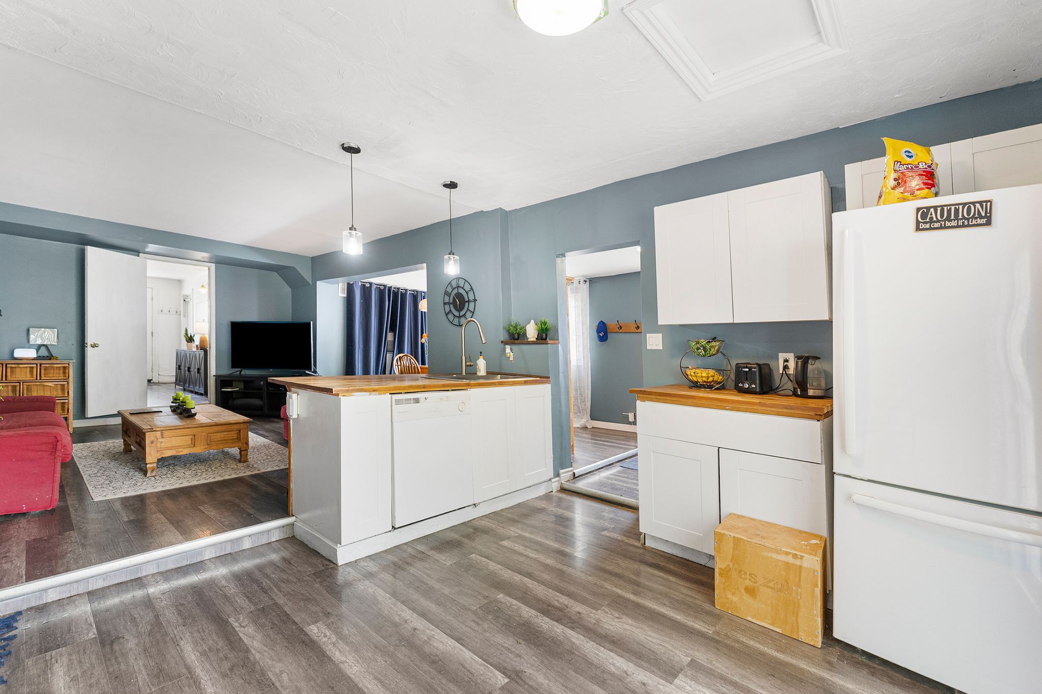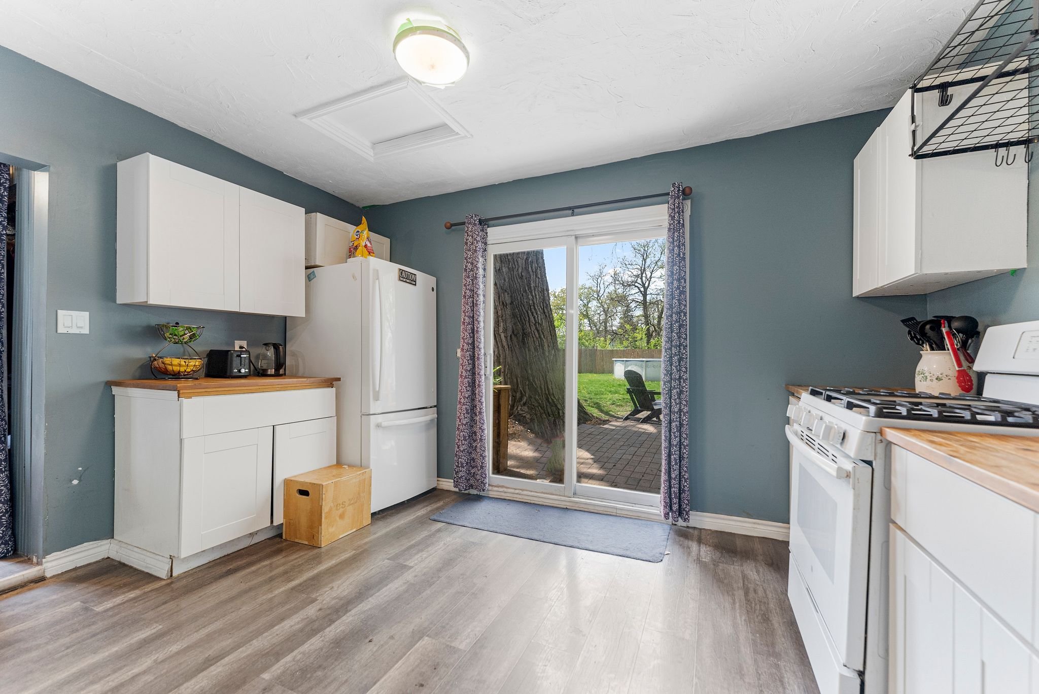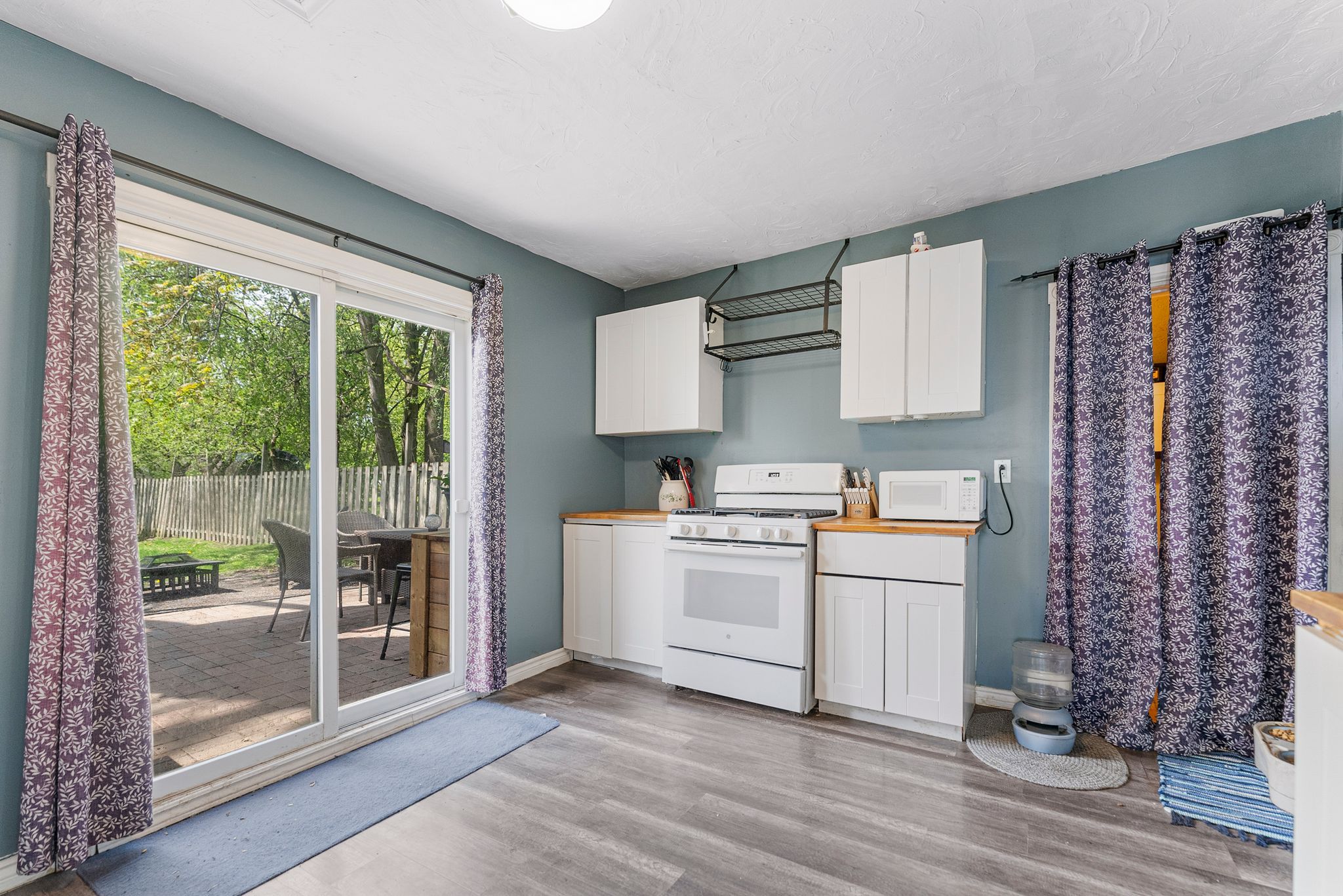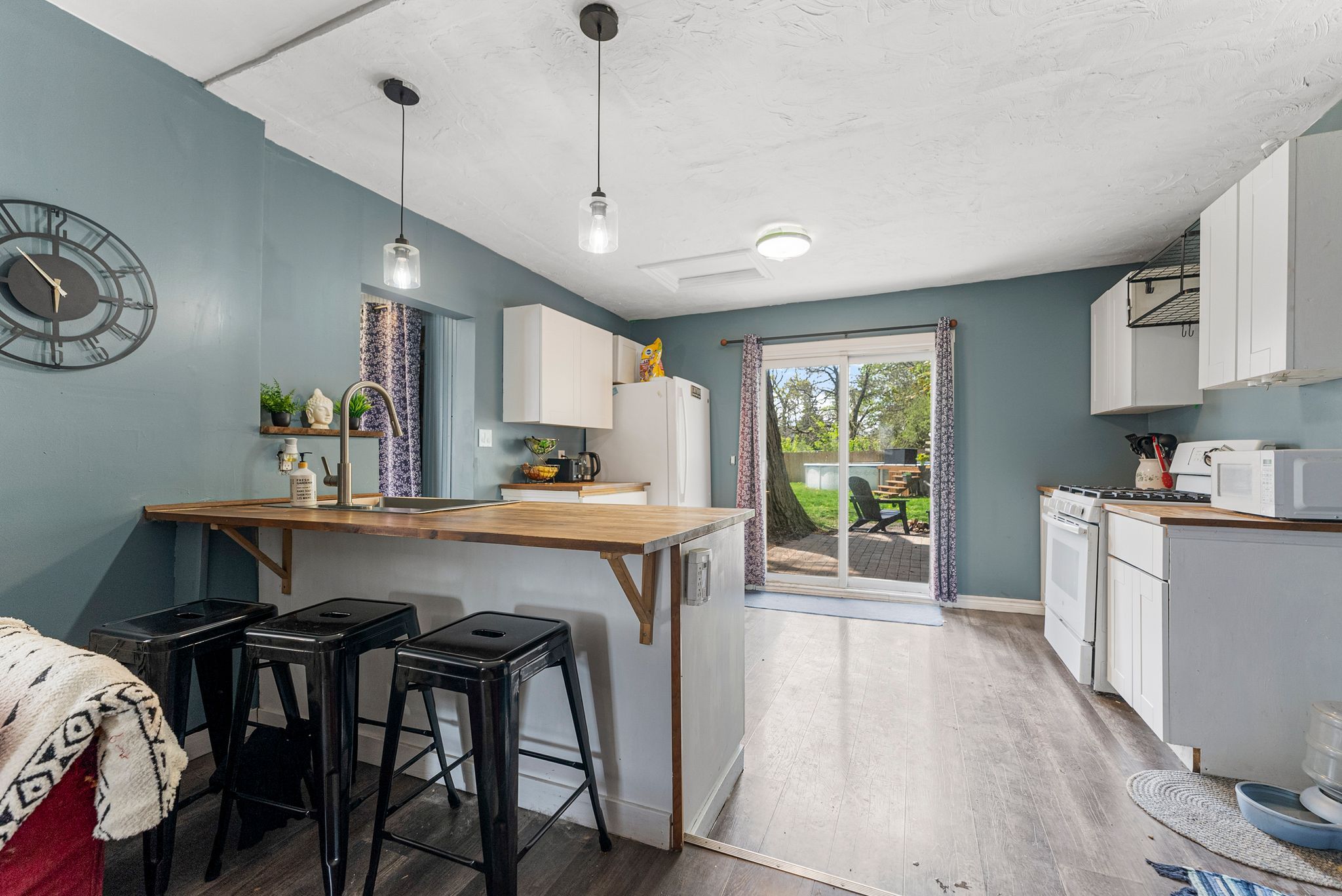 • Updated kitchen with butcher-block countertop and views of the backyard.