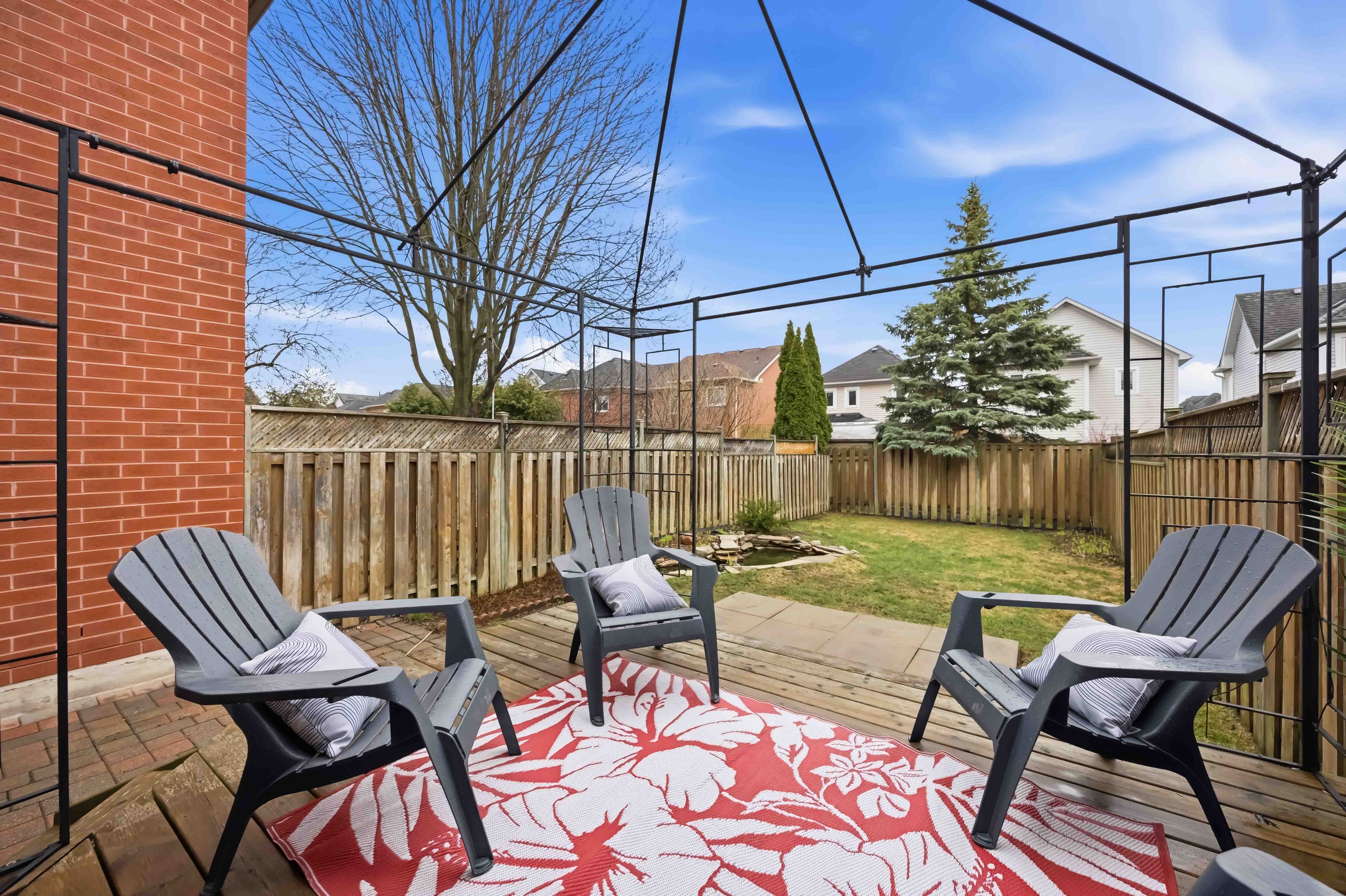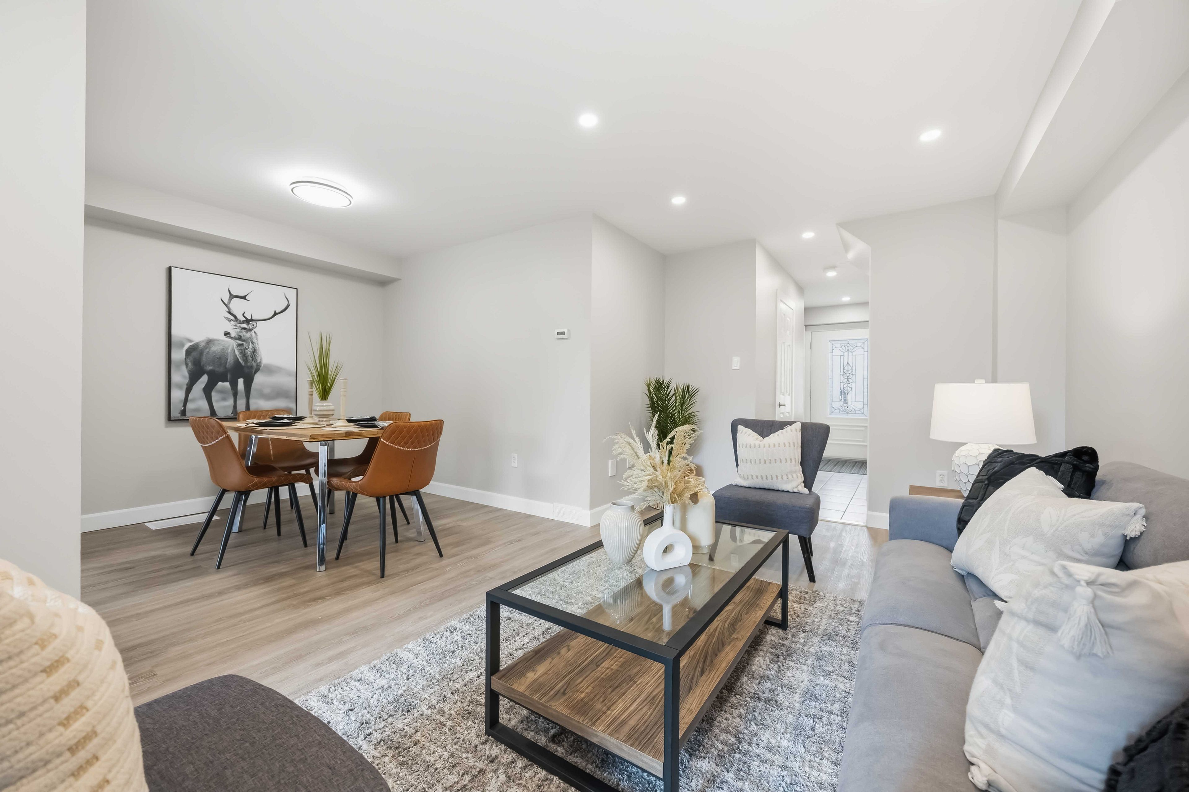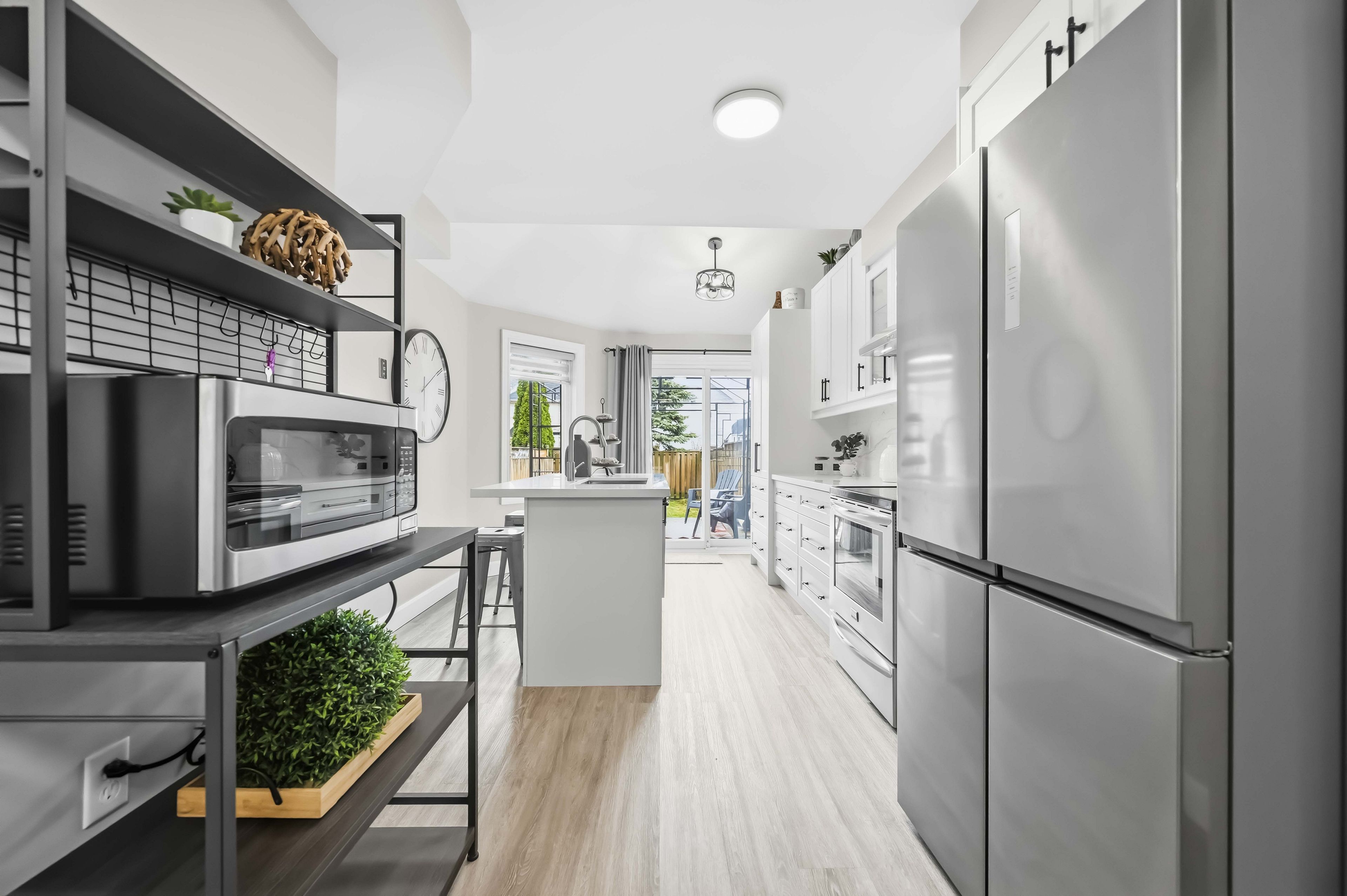 Beautifully and professionally upgraded 3-bedroom, 3-bath freehold townhome in a highly sought-after brooklin family community! Thoughtfully finished from top to bottom, this move-in-ready home features fresh neutral paint, all new trim and baseboards, updated lighting, renovated bathrooms, and new broadloom on the stairs and second floor. The custom open concept main floor offers smooth ceilings with pot lights, new luxury vinyl plank flooring, and a spacious living room with a cozy gas fireplace and lovely backyard views. The gourmet kitchen is designed to impress, featuring quartz countertops, a large centre island with breakfast bar, subway tile backsplash, pantry, vaulted ceiling, and a sliding glass walk-out to the entertainer's deck. A generous dining area makes hosting family and friends easy. Step outside to a fully fenced, great sized backyard complete with a gazebo, patio, and tranquil pond - the perfect setting for relaxing or entertaining. Upstairs, you'll find 3 generously sized bedrooms, including a spacious primary retreat with a walk-in closet and a beautifully updated 3-piece ensuite with quartz vanity and glass shower. The immaculate, unspoiled basement offers above grade windows, a cold cellar, and laundry area, providing excellent potential for future living space. Ideally located close to schools, parks, golf, downtown brooklin shops, and with easy access to hwy 407, this exceptional home is perfect for first-time buyers, young couples, and growing families!