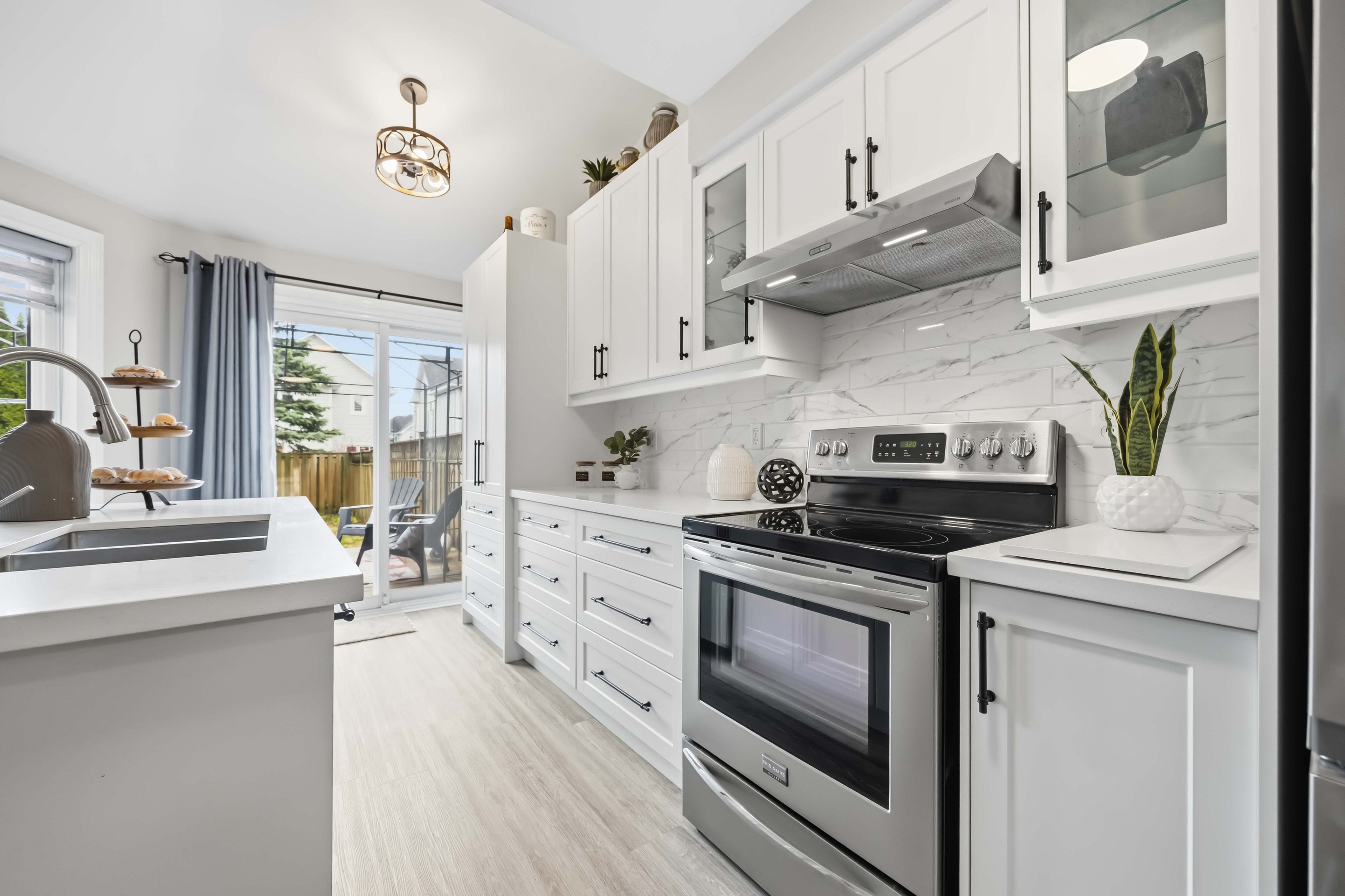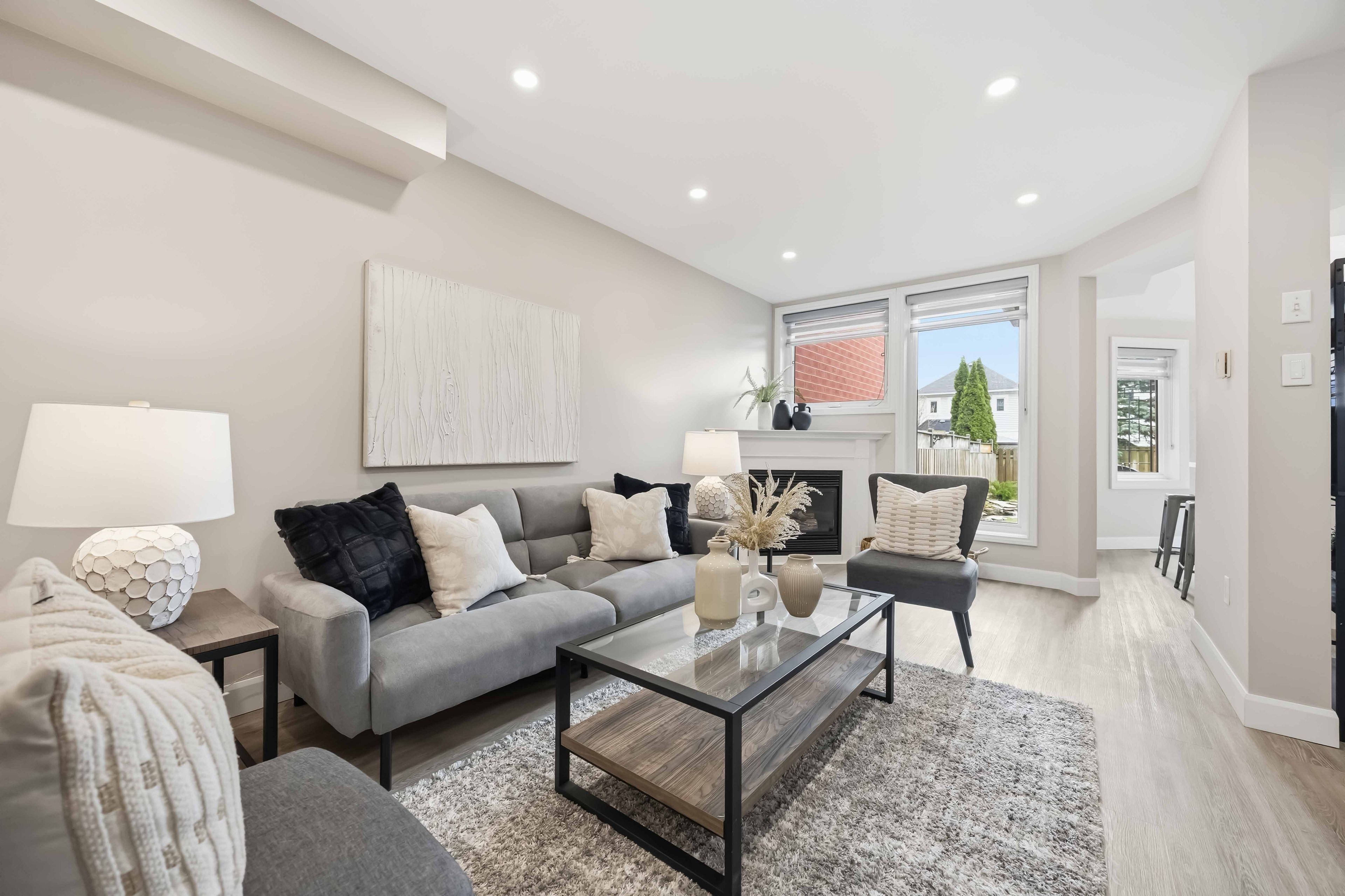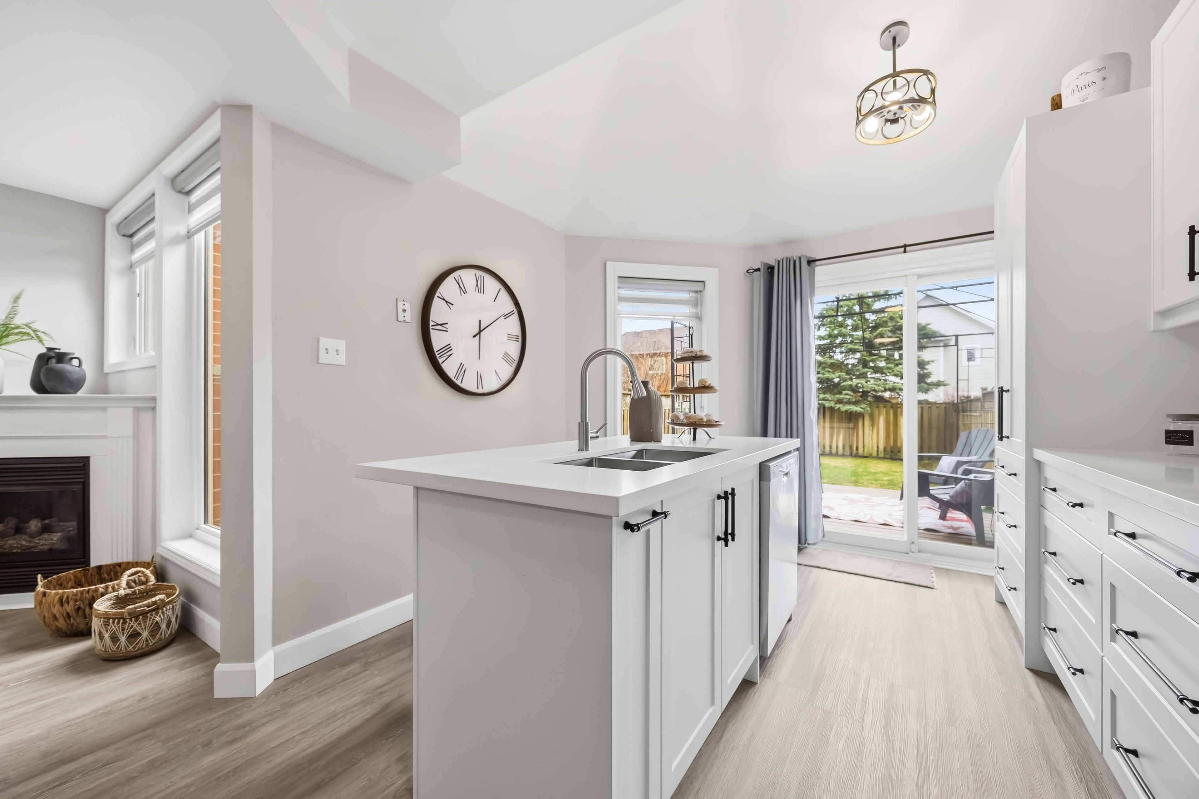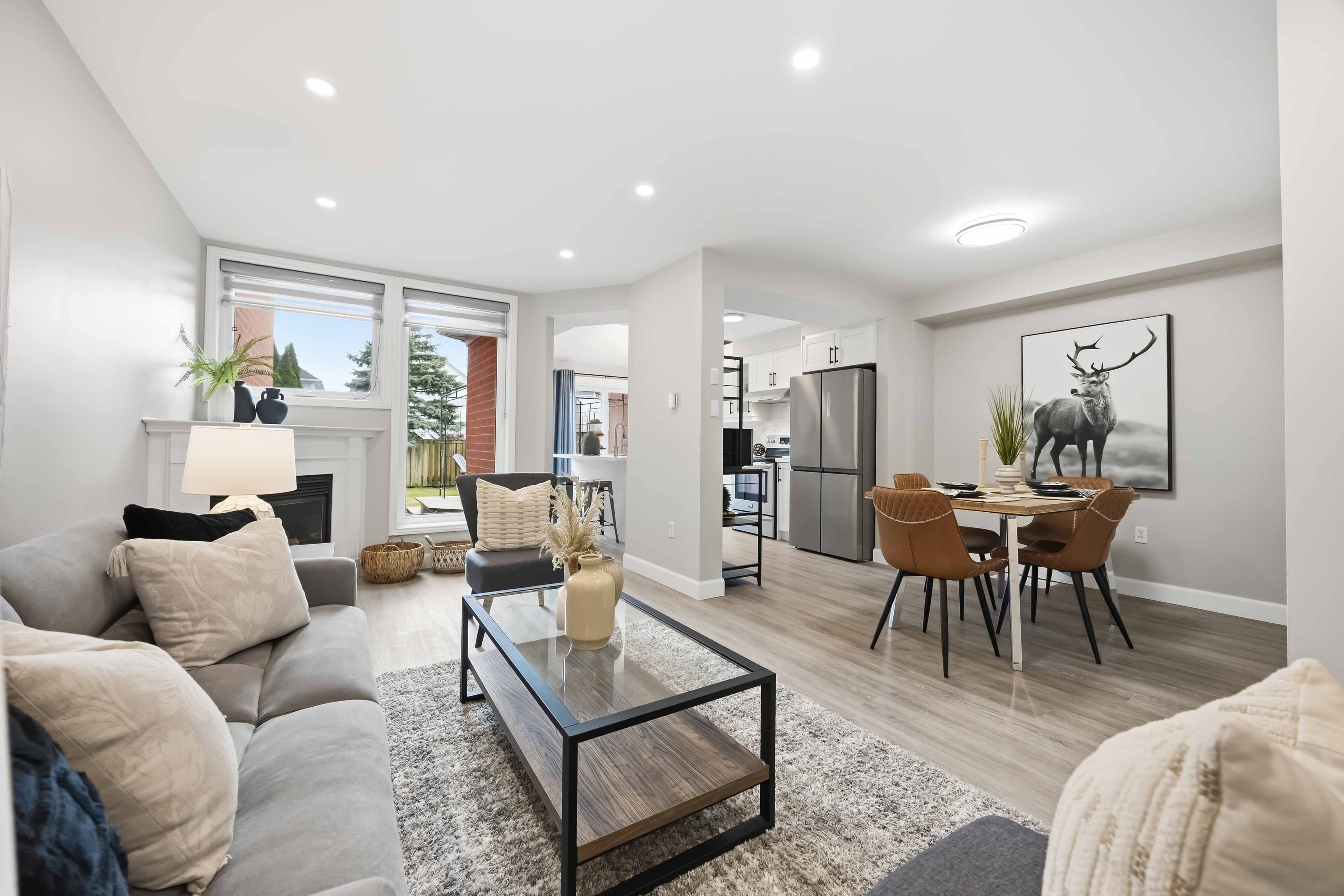 Beautifully and professionally upgraded 3-bedroom, 3-bath freehold townhome in a highly sought-after brooklin family community! Thoughtfully finished from top to bottom, this move-in-ready home features fresh neutral paint, all new trim and baseboards, updated lighting, renovated bathrooms, and new broadloom on the stairs and second floor. The custom open concept main floor offers smooth ceilings with pot lights, new luxury vinyl plank flooring, and a spacious living room with a cozy gas fireplace and lovely backyard views. The gourmet kitchen is designed to impress, featuring quartz countertops, a large centre island with breakfast bar, subway tile backsplash, pantry, vaulted ceiling, and a sliding glass walk-out to the entertainer's deck. A generous dining area makes hosting family and friends easy. Step outside to a fully fenced, great sized backyard complete with a gazebo, patio, and tranquil pond - the perfect setting for relaxing or entertaining. Upstairs, you'll find 3 generously sized bedrooms, including a spacious primary retreat with a walk-in closet and a beautifully updated 3-piece ensuite with quartz vanity and glass shower. The immaculate, unspoiled basement offers above grade windows, a cold cellar, and laundry area, providing excellent potential for future living space. Ideally located close to schools, parks, golf, downtown brooklin shops, and with easy access to hwy 407, this exceptional home is perfect for first-time buyers, young couples, and growing families!