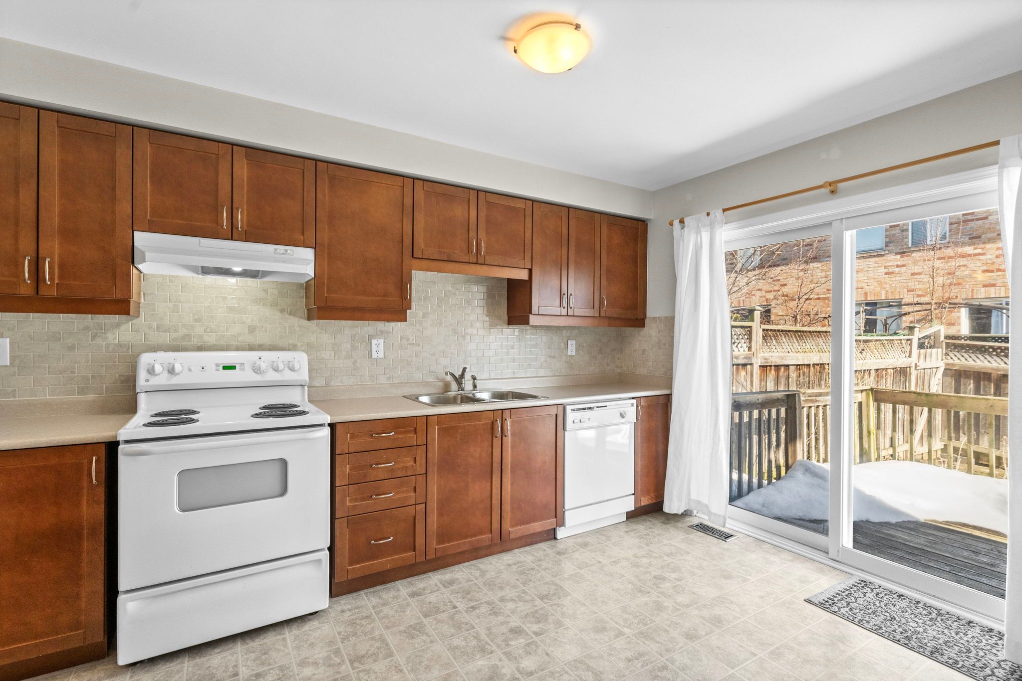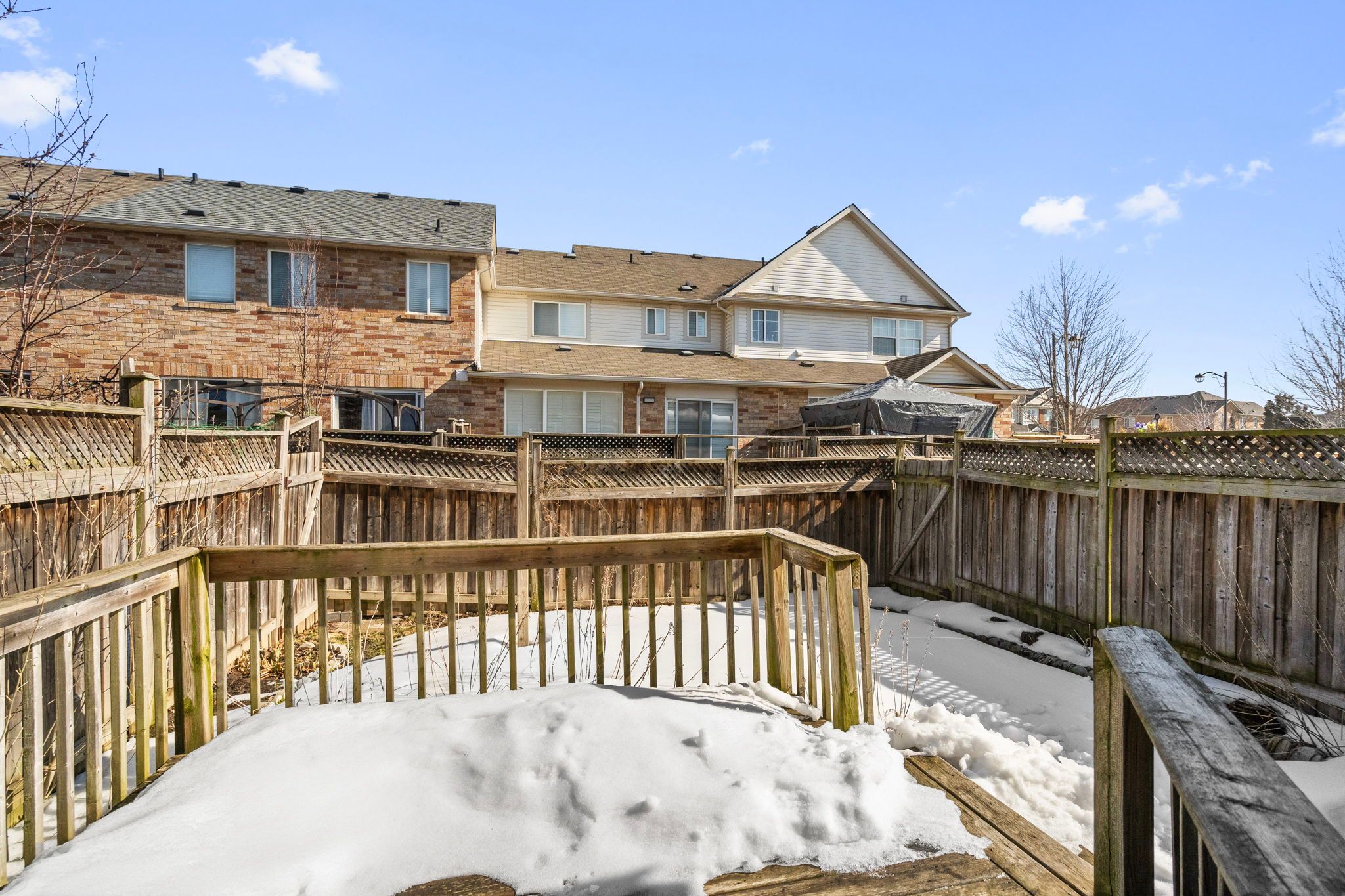 • Private fenced backyard with a wood deck and gardens.
