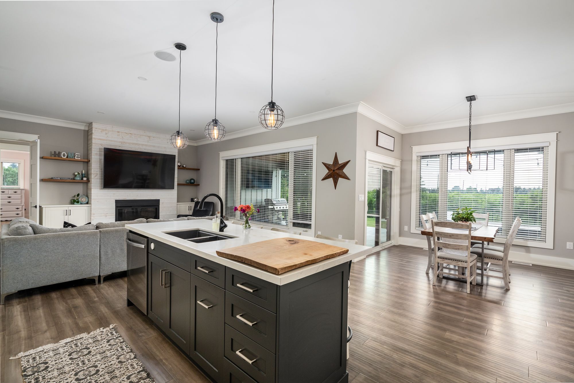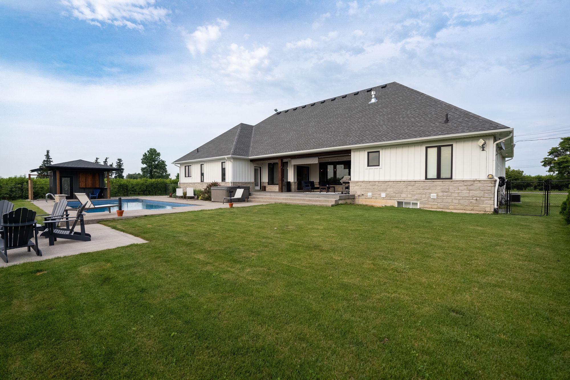 Welcome to this stunning 2,945 sq. Ft. Bungalow, expertly crafted with a blend of stone and hardie board exterior. From the moment you step inside, you'll be greeted by the expansive open concept living area, featuring soaring 10-ft ceilings and no carpets. The heart of the home is the gourmet kitchen, boasting quartz countertops throughout, a large island with bar stool seating, stainless steel appliances, abundant counter and cupboard space, and a spacious pantry. The main floor master bedroom wing is a true retreat, complete with a coffered ceiling, a generous walk-in closet, and a luxurious 5-piece ensuite. Enjoy private access to the rear yard from your master bedroom. The main floor also offers a versatile office (or potential fourth bedroom), two additional bedrooms with walk-in closetsone with a private 4-piece ensuite and the other with ensuite privilegeand a 2-piece powder room off the foyer. The mudroom off the garage features a laundry area and barn-style roller door. The fully finished basement includes a large rec room with a rough in kitchenette, an additional bedroom, and a 3-piece bathroom with a spacious glass shower. With 9-ft ceilings and a heated slab, the basement is as comfortable as it is functional. Outdoor living is equally impressive, with a covered rear patio complete with tv hookup, bbq line, and pull-down privacy screens. Relax in the inground heated saltwater pool, unwind in the hot tub, or enjoy the fully fenced, landscaped yard with a stone wall surround. The property, just under an acre, is surrounded by picturesque vineyards and fruit farms. Additional features include an insulated 2-car garage with hot water hookup, city water, an interior and exterior wired-in speaker system, a security system, and central vac. This exquisite home offers the perfect blend of luxury, comfort, and tranquility.