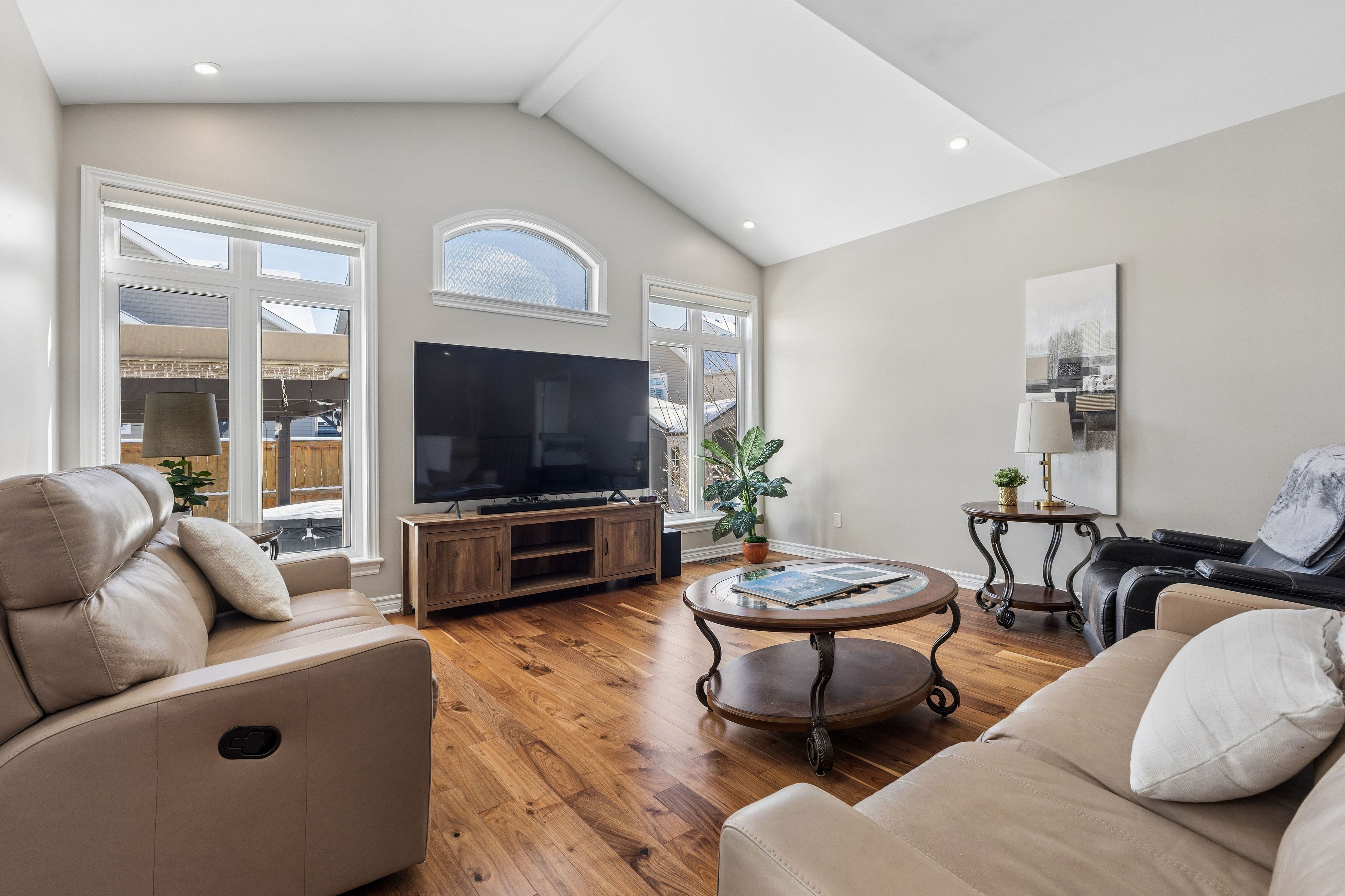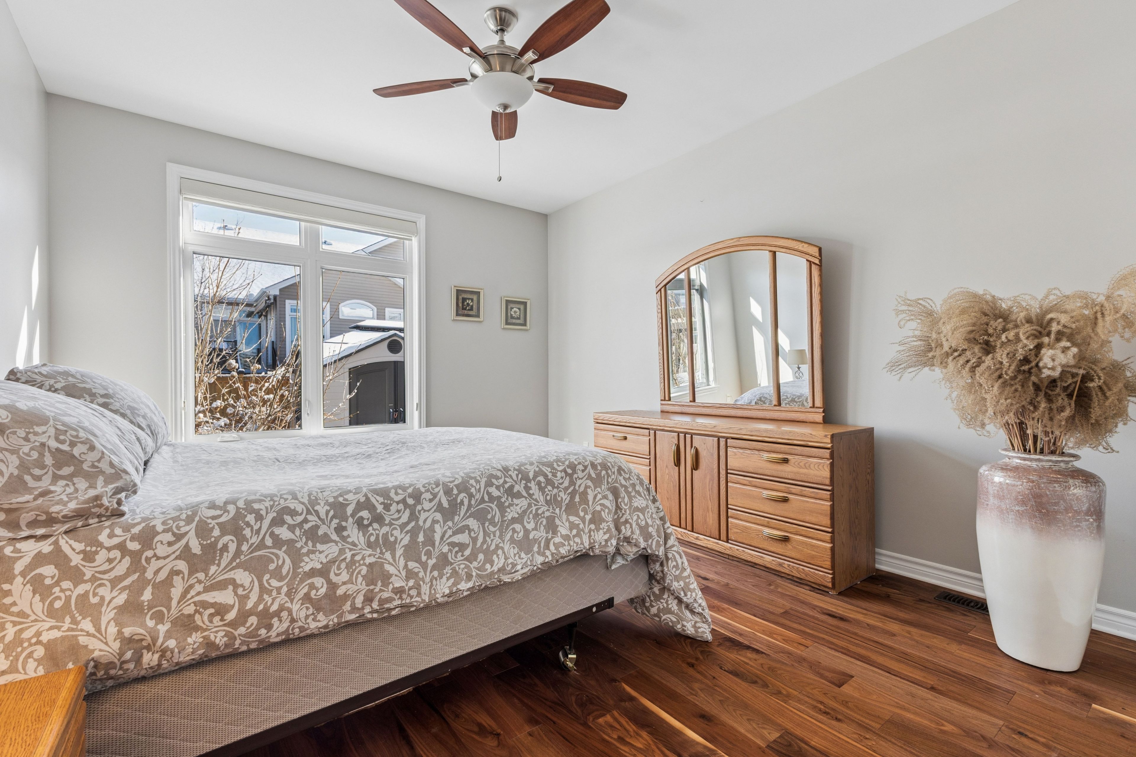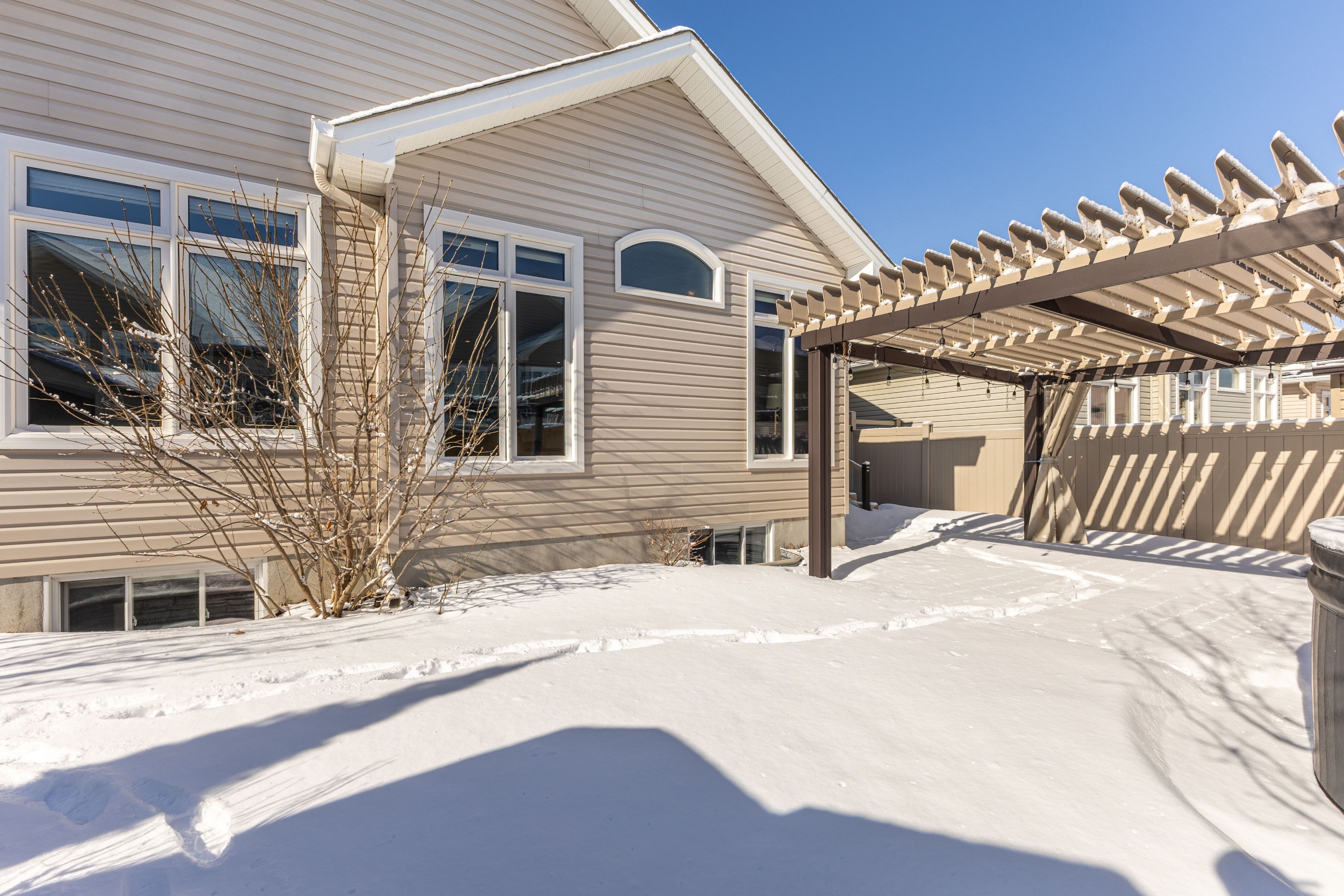 Select images have been virtually staged // pride of ownership is evident throughout this beautifully maintained bungalow in cardinal creek, ideally situated within a sought-after adult lifestyle enclave of similar homes offering access to a nearby community building designed for social gatherings and neighbourhood events. This inviting home features desirable main-floor living with 9-ft ceilings, rich upgraded walnut hardwood flooring, pot lights throughout, and an upgraded hardwood staircase. The bright open-concept layout is highlighted by a stunning living room with cathedral ceilings and large windows that fill the space with natural light, while the kitchen is beautifully appointed with upgraded walnut cabinetry, quartz countertops, a convenient pantry cabinet, and a spacious island offering enhanced storage and workspace. Two bedrooms are located on the main level, including a spacious primary retreat with walk-in closet and a luxurious 5-piece en-suite featuring double sinks, a soaker tub, and glass walk-in shower. A versatile second bedroom is ideal for guests, a home office, or reading space, complemented by convenient main-floor laundry and a partial bath. The fully finished basement offers upgraded carpeting, a large recreation area centred around a cozy gas fireplace, an additional bedroom, full bathroom, and ample storage. Step outside to an exceptional fenced backyard featuring extensive hardscaping, garden beds, storage shed, hot tub area, and a sleek louvered pergola creating a true outdoor retreat. Additional highlights include a double car garage, covered front porch, customizable led soffit lighting, and a location close to the future lrt and everyday amenities.