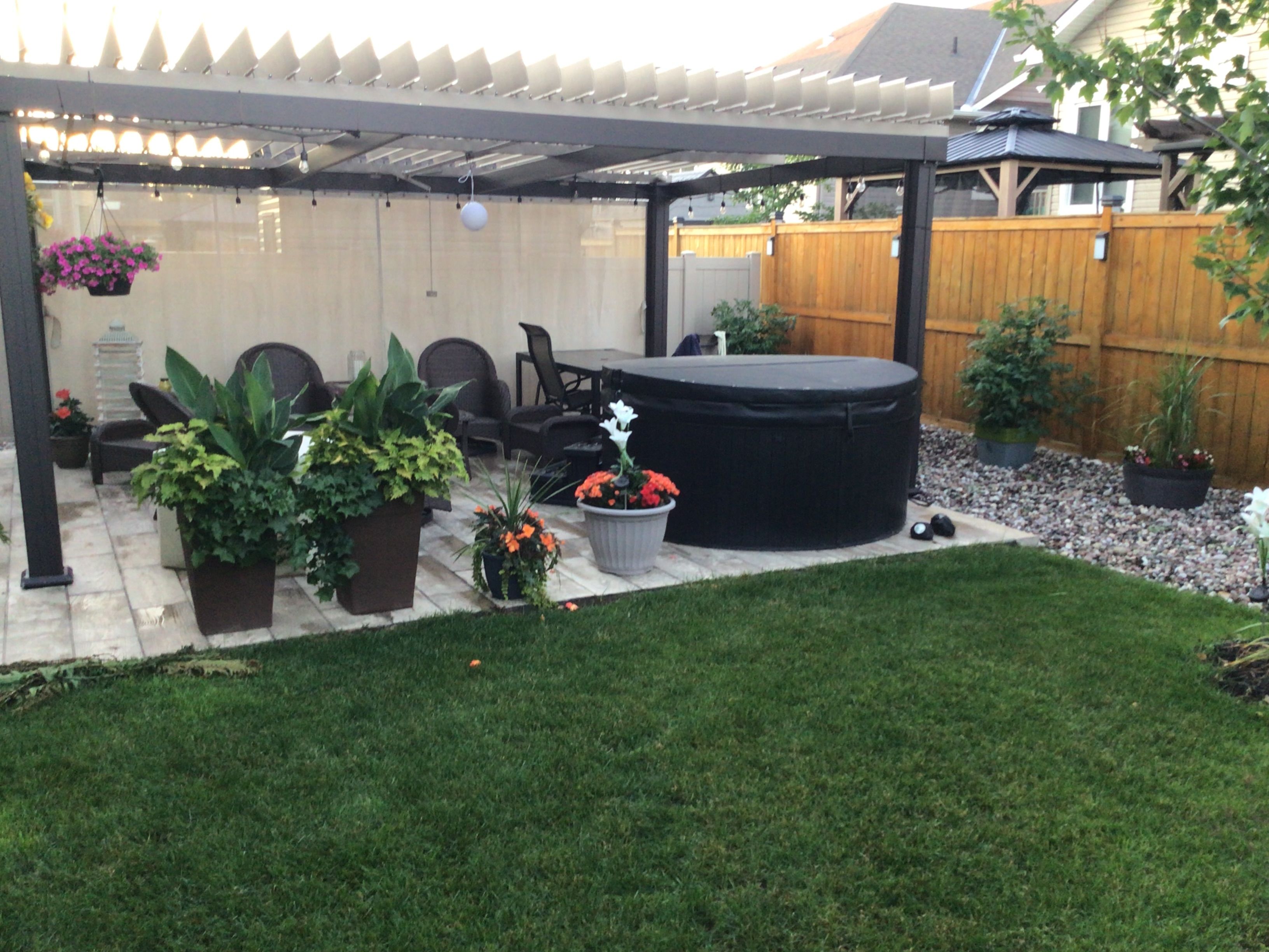 • Exceptional backyard retreat featuring hardscaping, garden beds, and hot tub area.