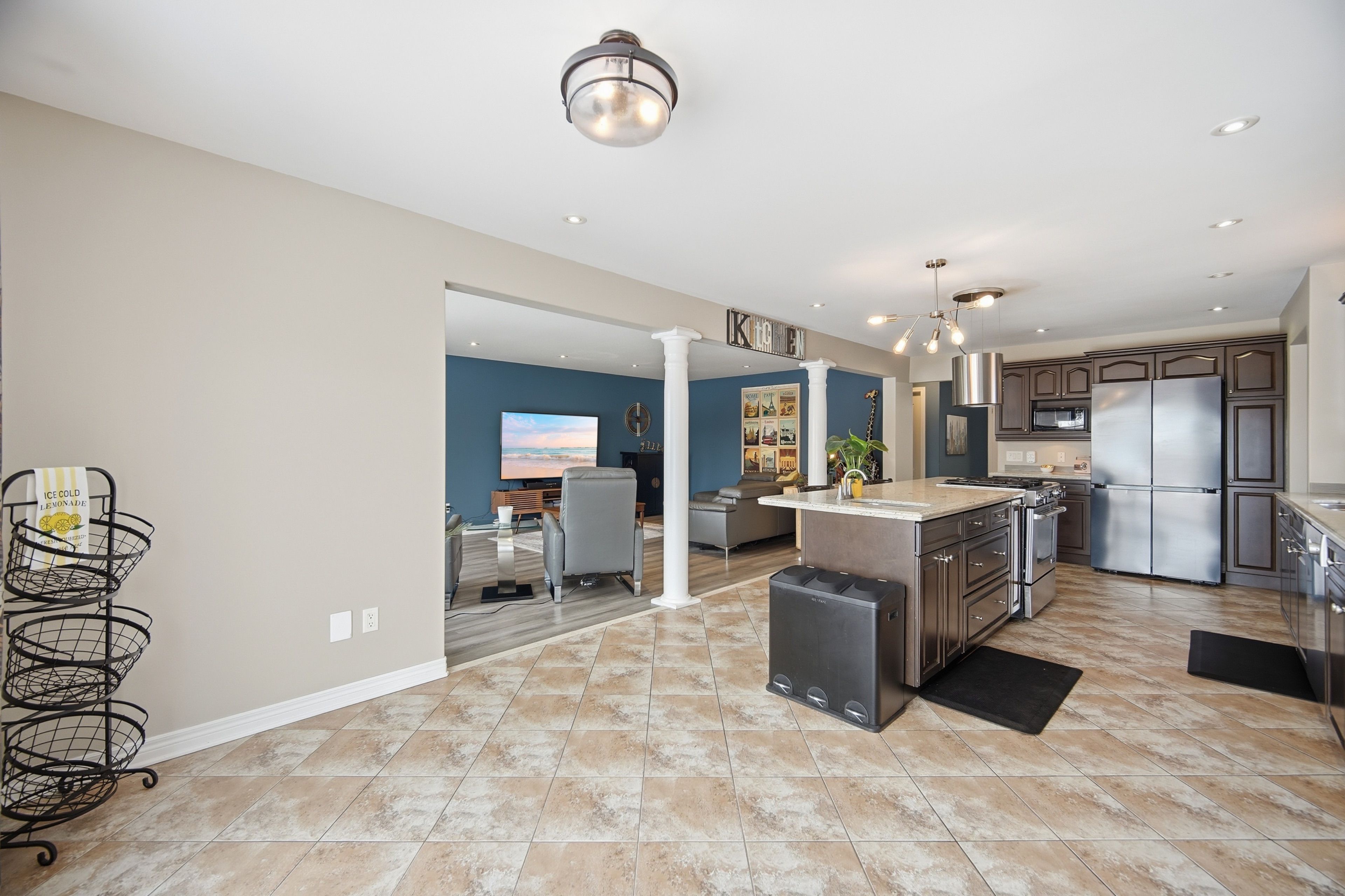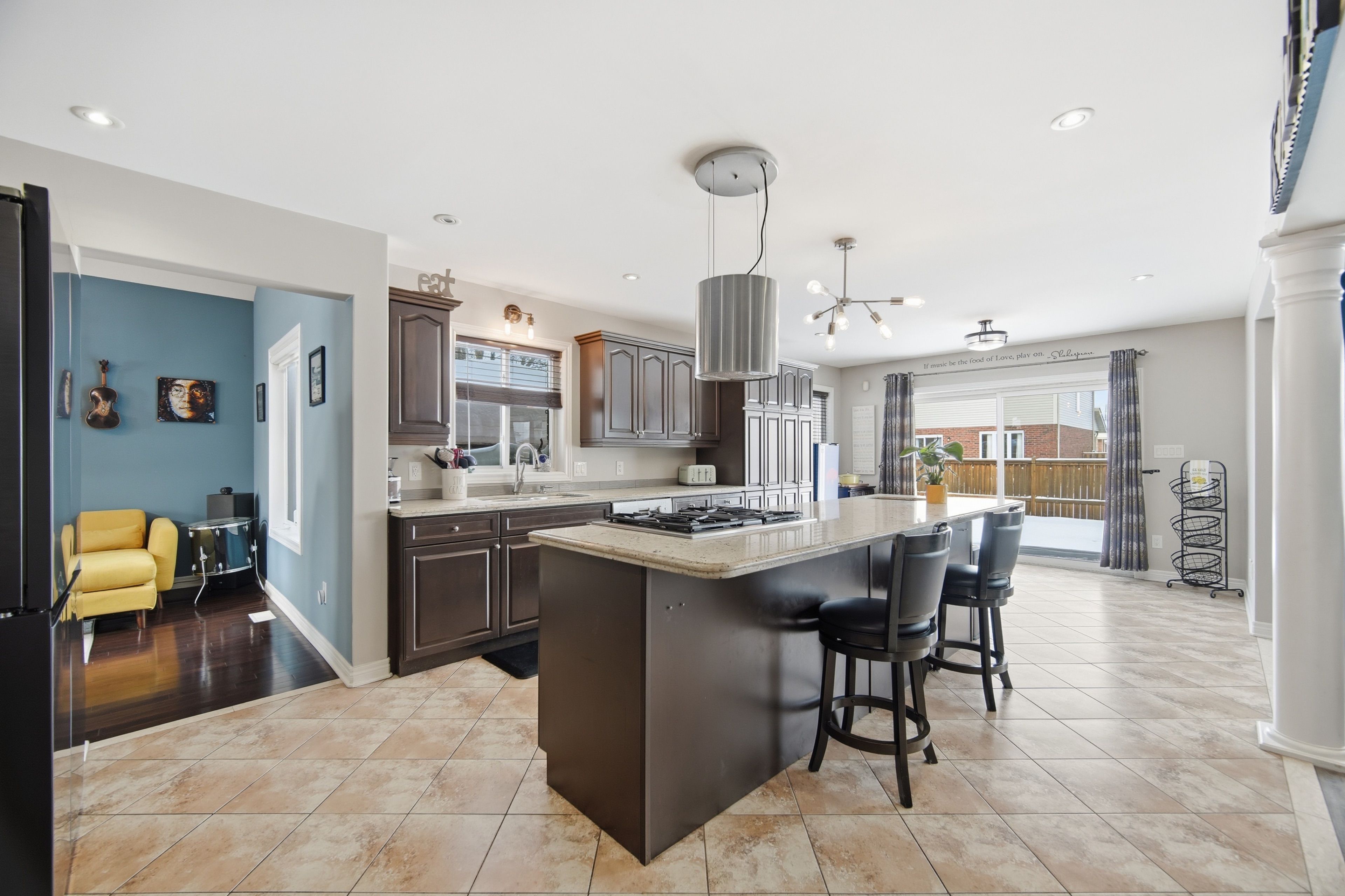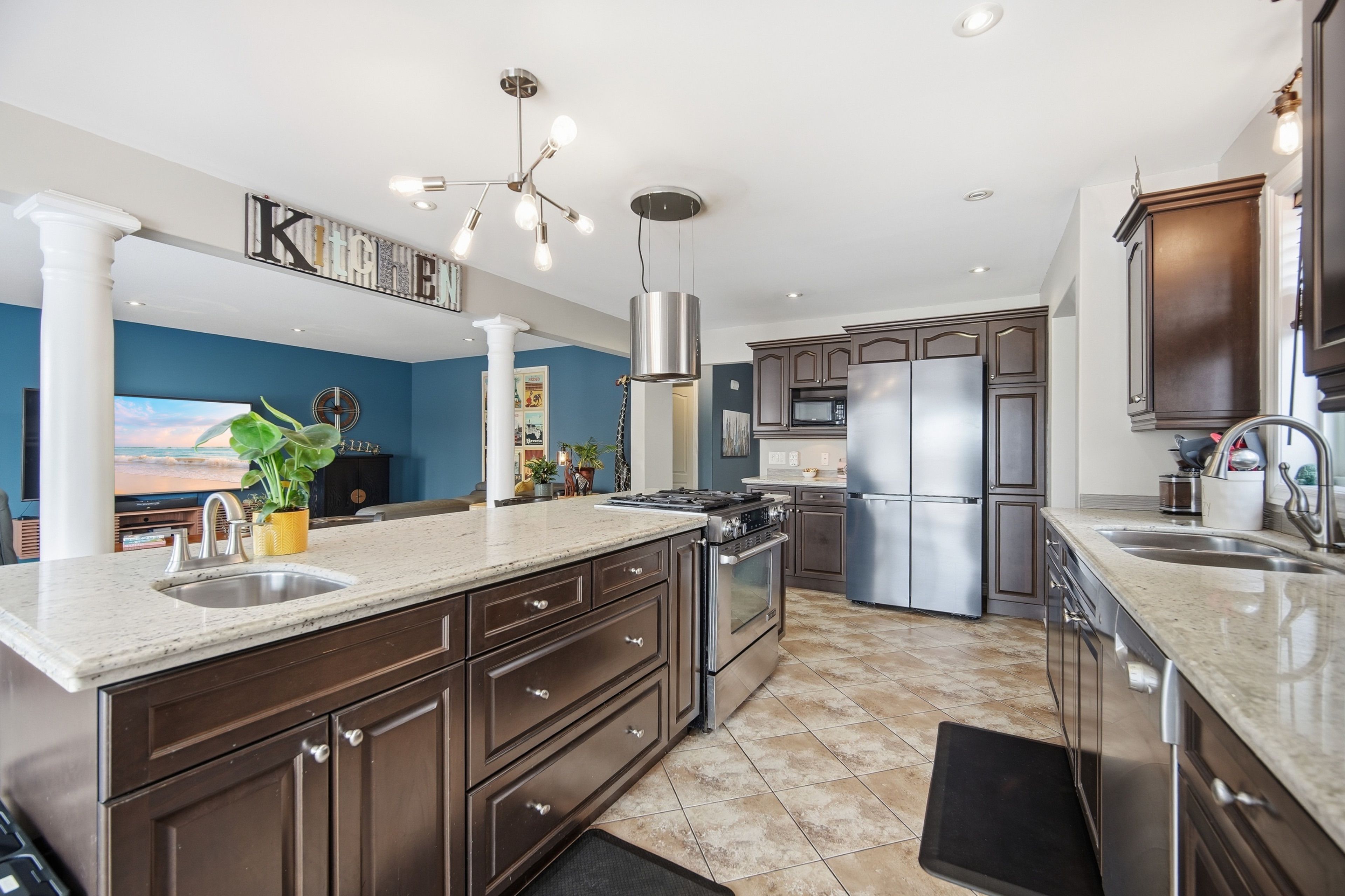 • Custom chef's kitchen with granite countertops and oversized island.