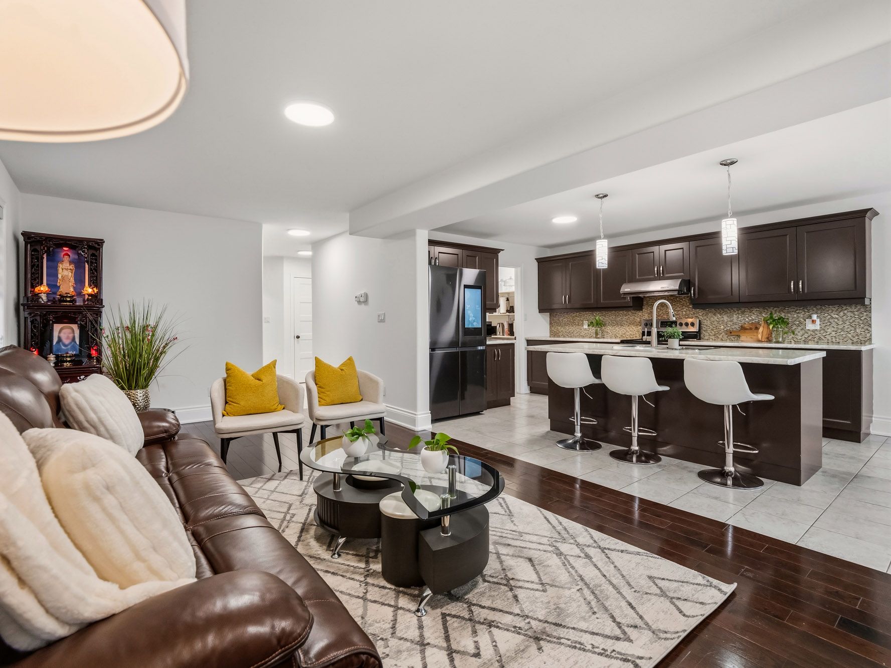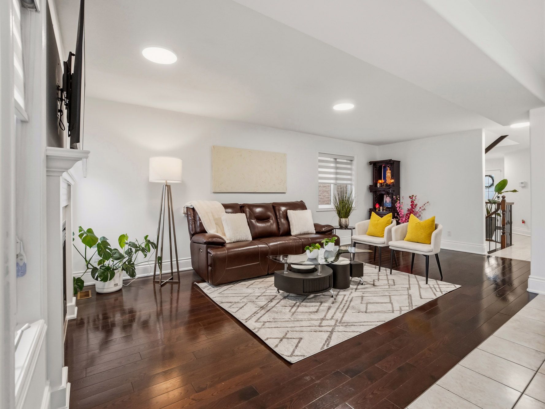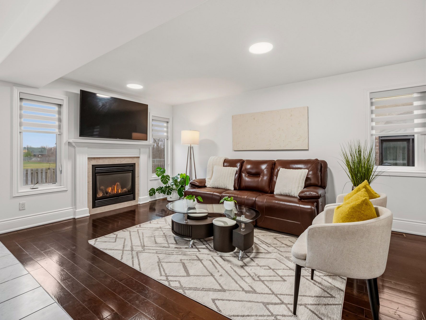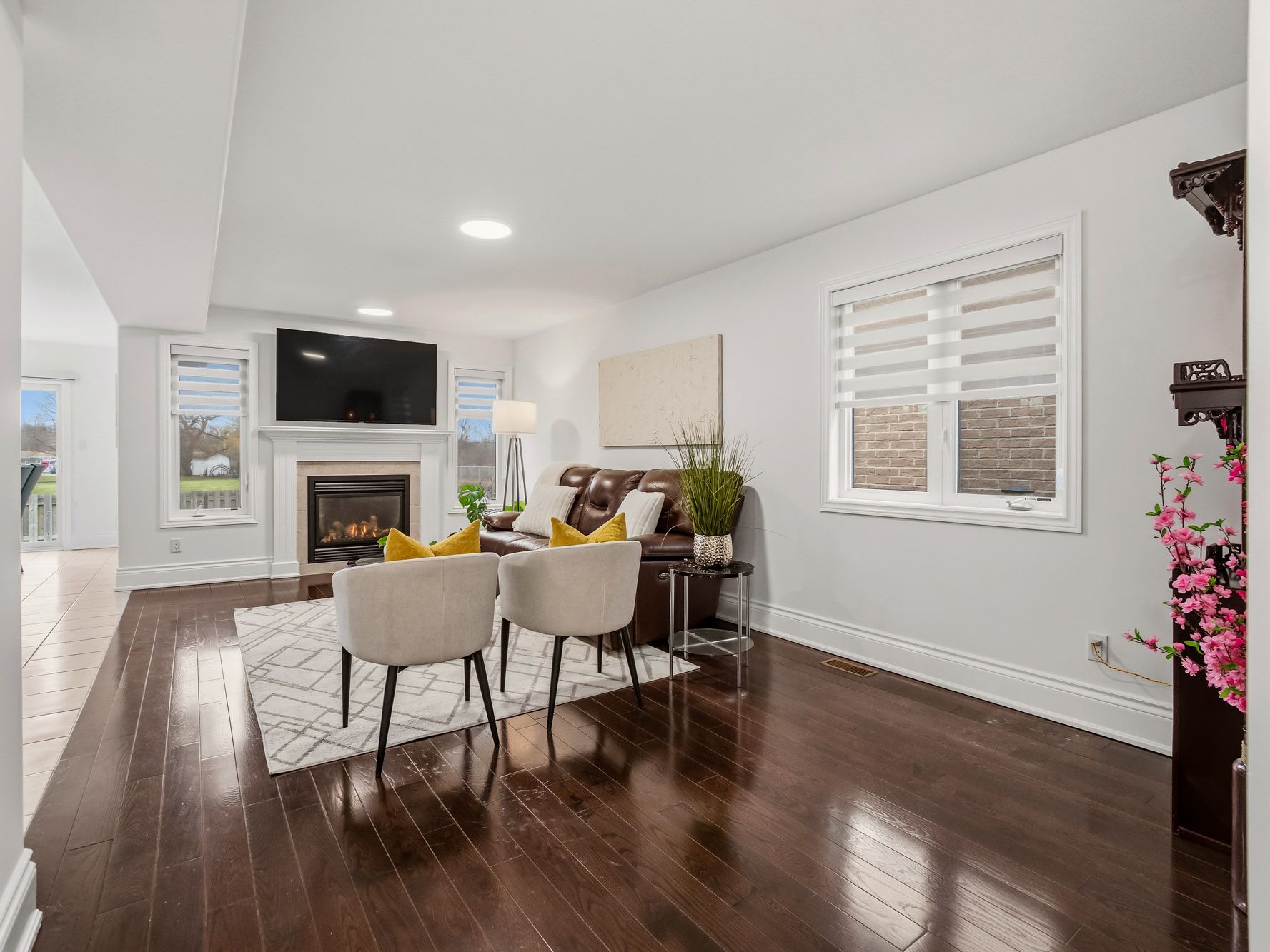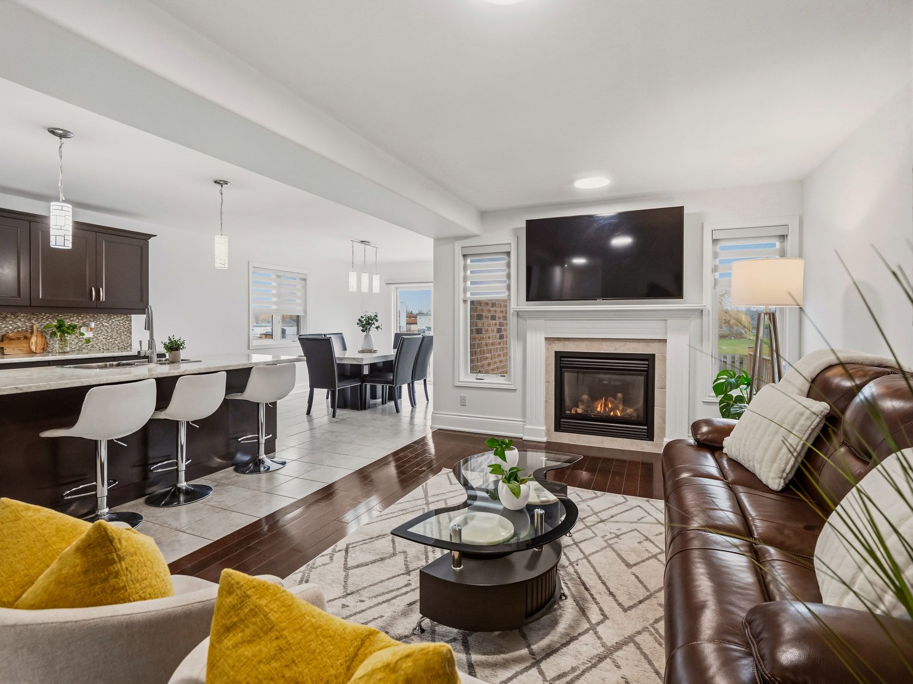 • Spacious open concept living area with hardwood floors and cozy gas fireplace.