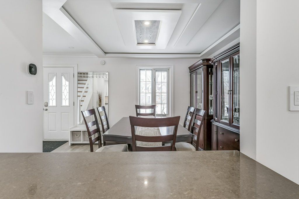 • Elegant dining room with hardwood floors and recessed crown moulding.