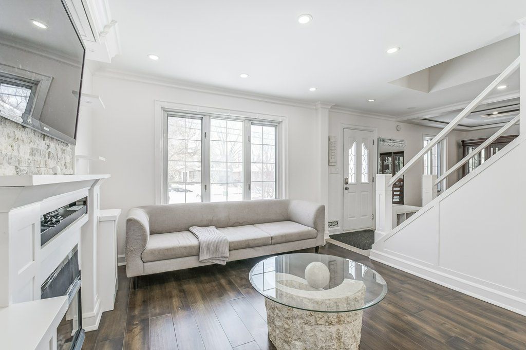 • Inviting living room featuring a gas fireplace and mood lighting.
