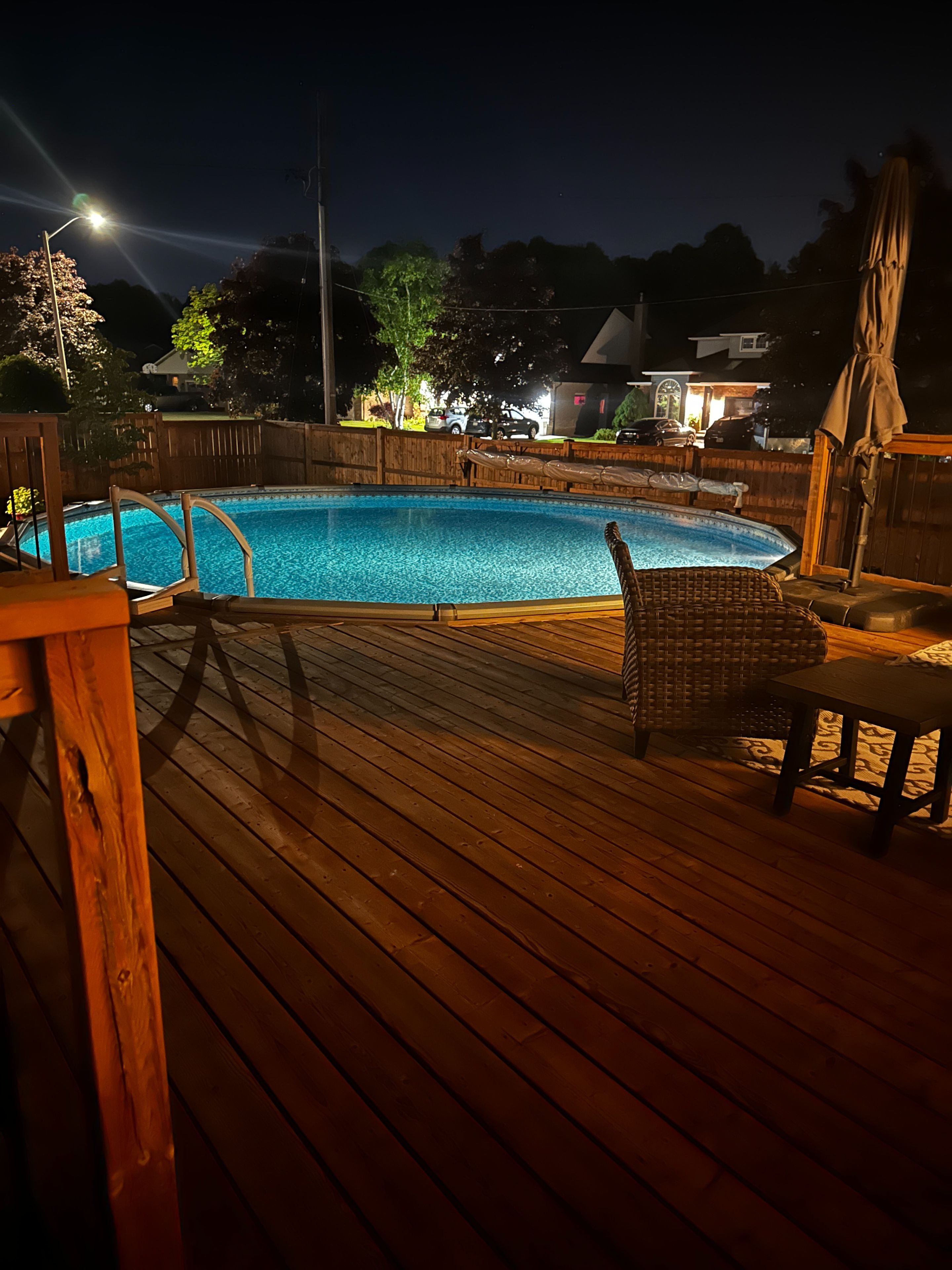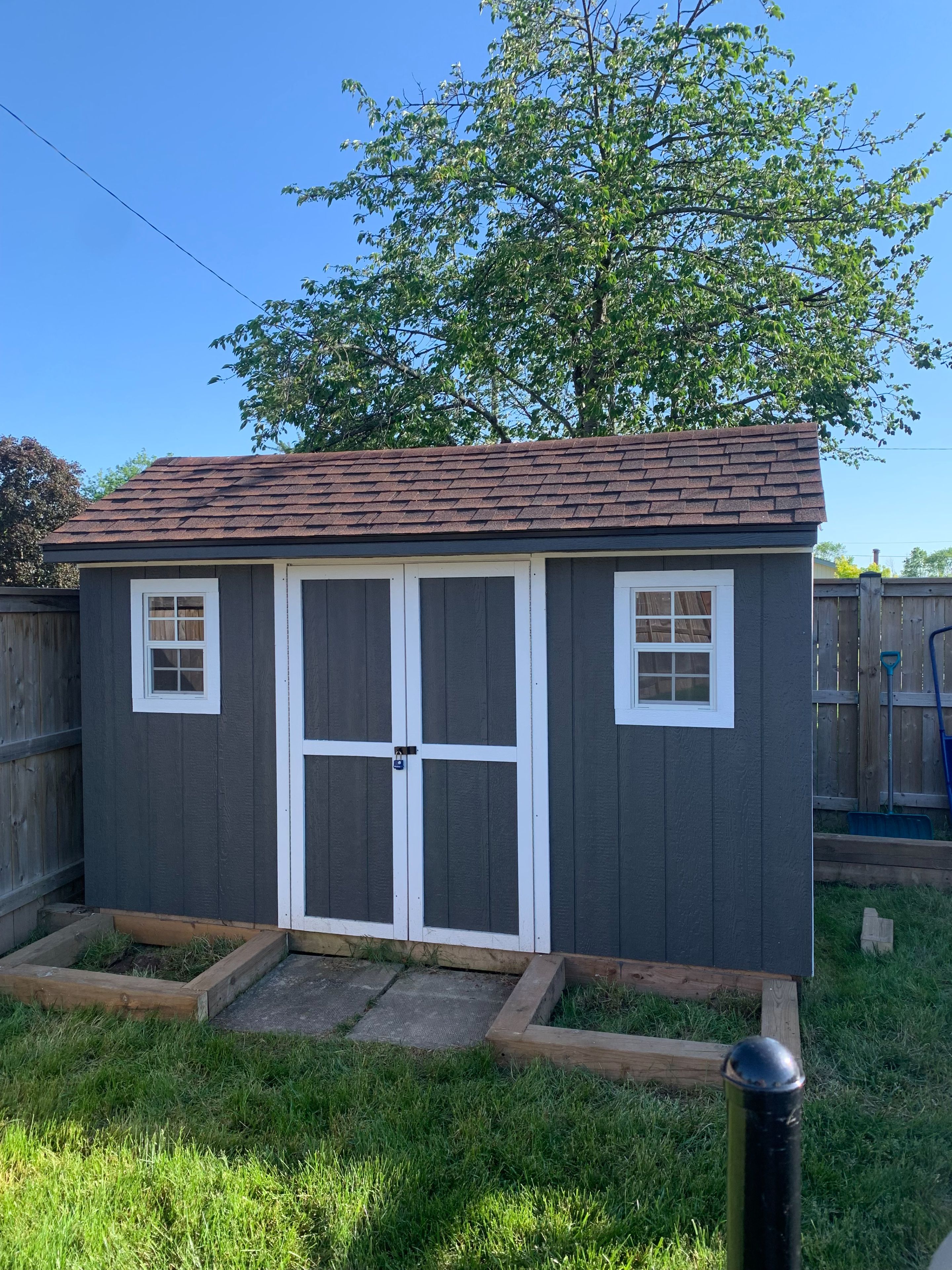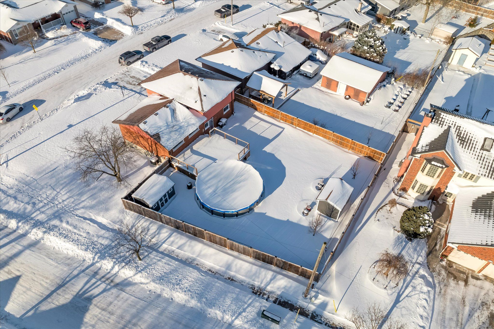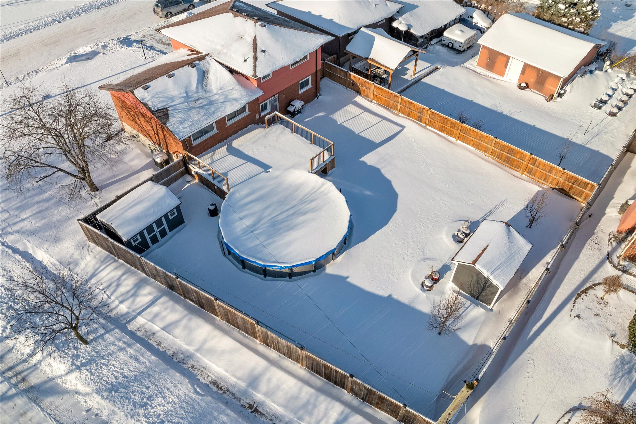 • Backyard retreat with a pool, deck, and storage sheds.