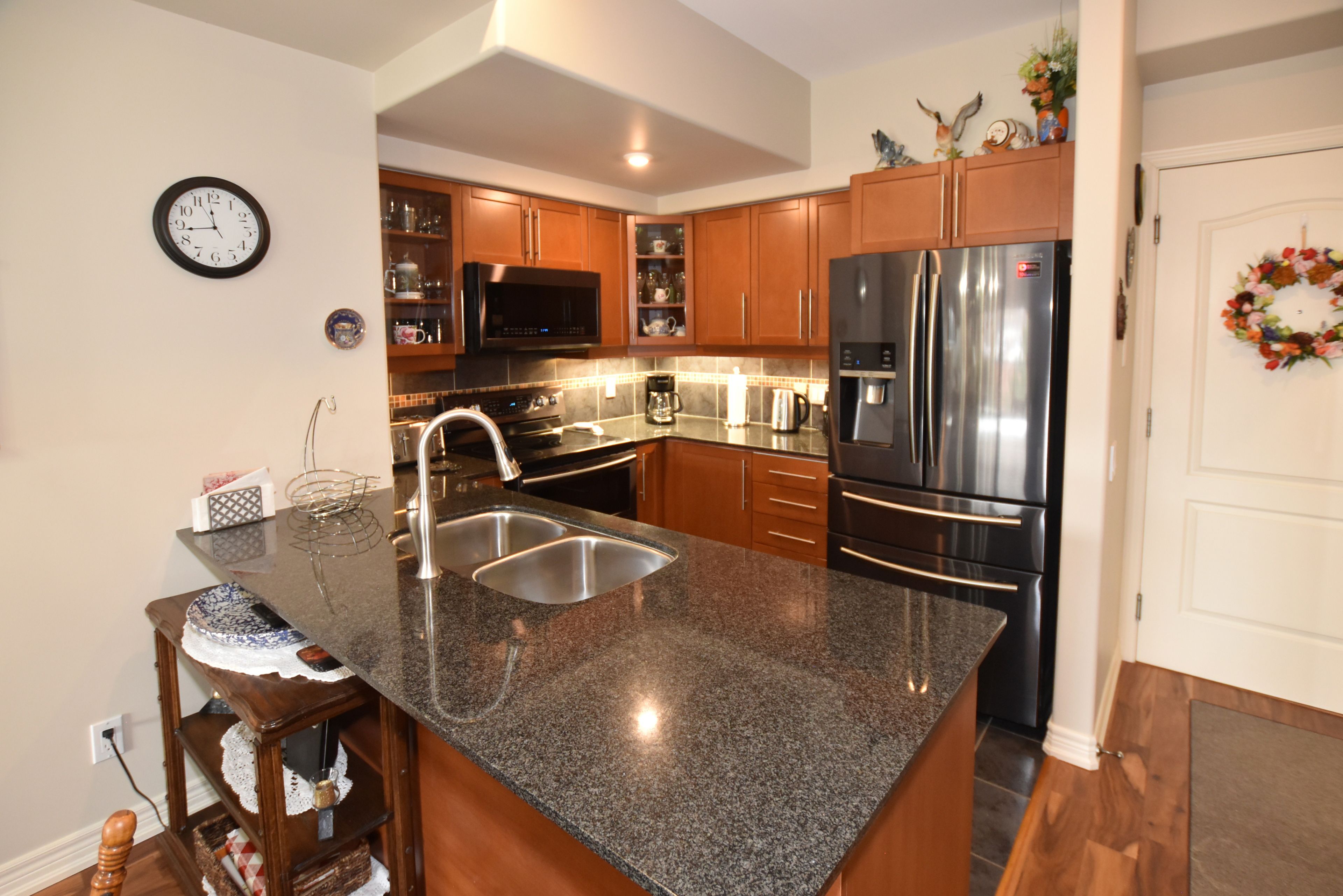 Gorgeous condo, beautifully maintained. Located in 'the glen' with beautiful western views & sunsets. This condo has many upgrades throughout with open kitchen, maple cabinetry, black granite countertops, high end stainless steel appliances, rosewood flooring. Master bedroom with beautiful ensuite with walk-in tiled glass shower. Den/office could be an additional bedroom. Secondary 2 pc bath. Shows to perfection. Upgraded light fixtures, spacious balcony to enjoy sunets. Walk to all amenities & bus pick-up close by. A pleasure to show. Locker is #332, and parking spot #11.