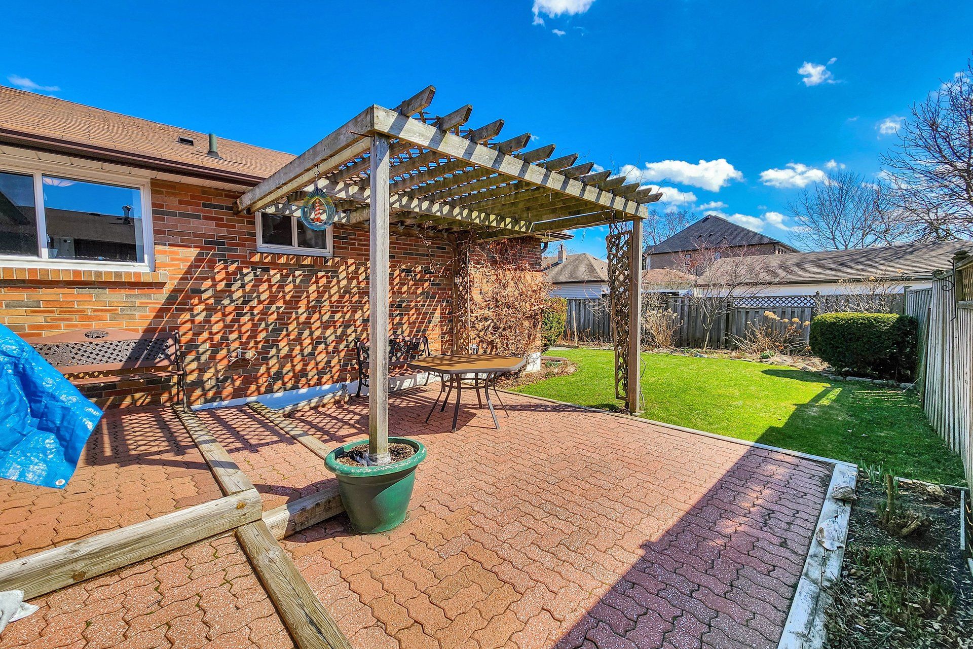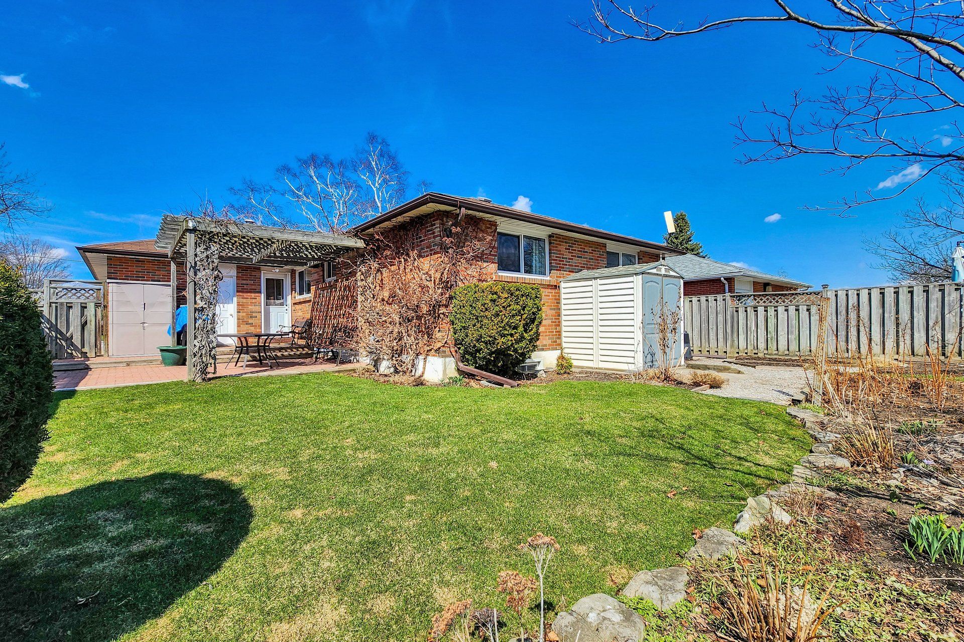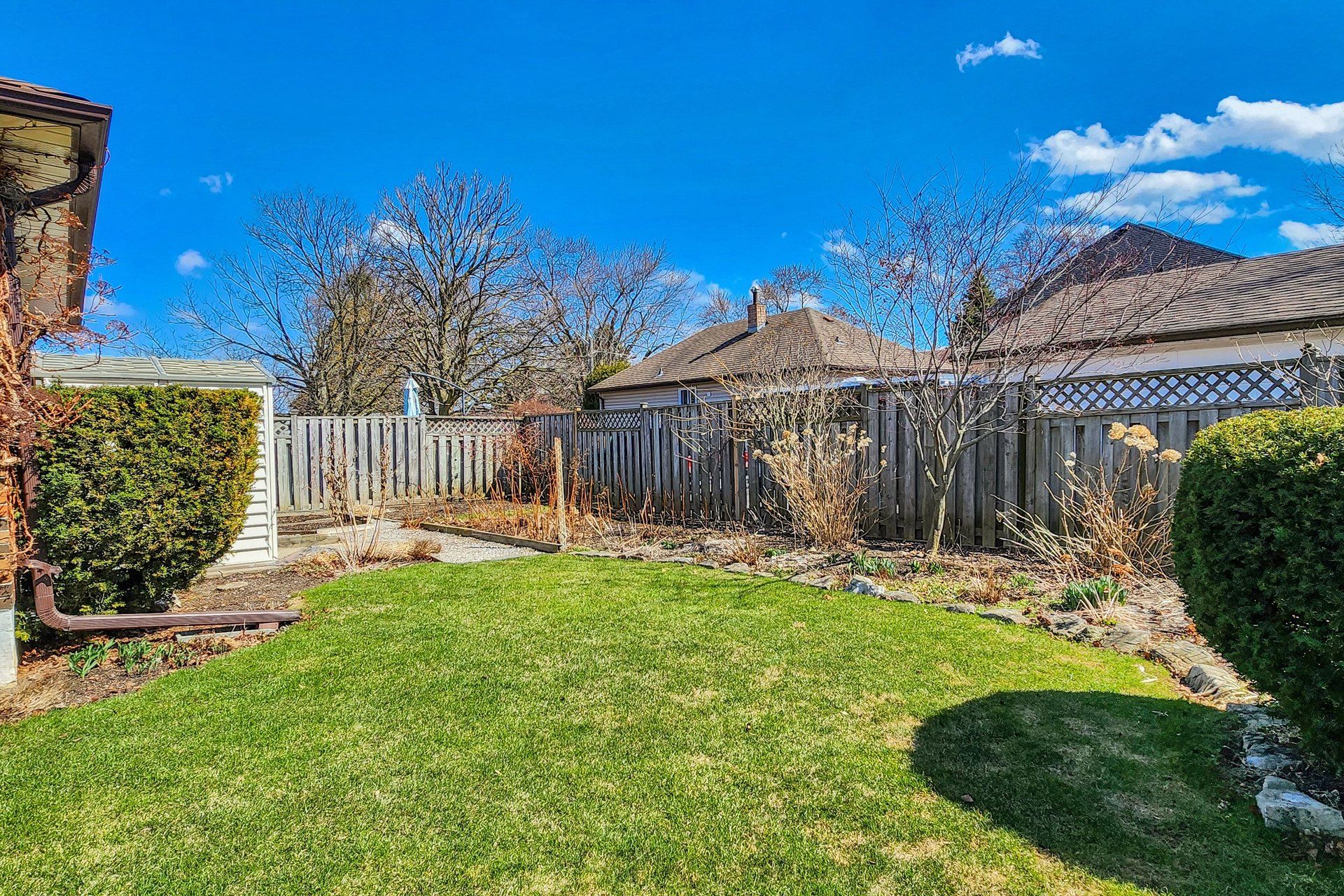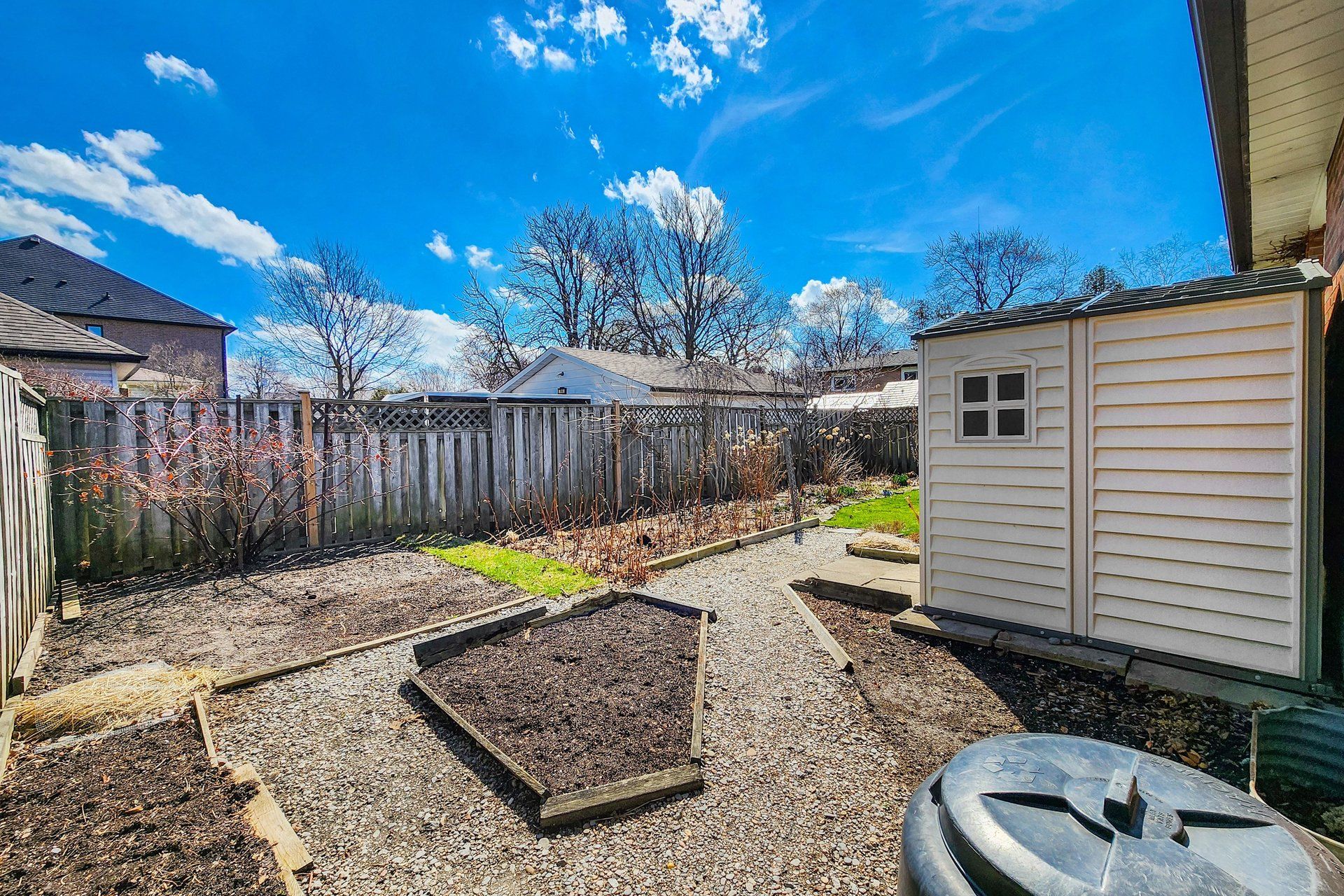 • Backyard features raspberry and blackberry bushes for gardening.