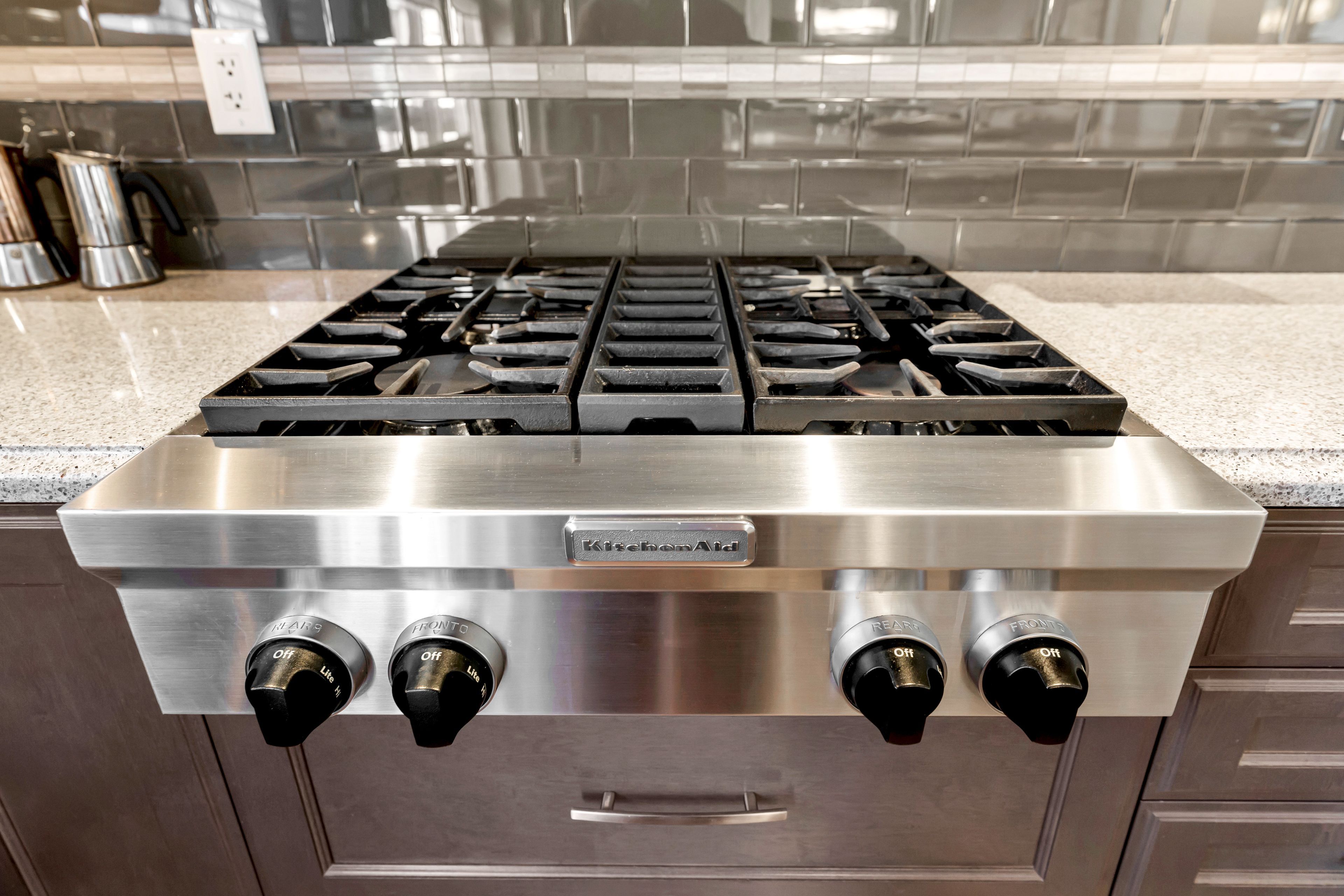 • Gourmet kitchen features an oversized quartz island and high-end appliances.