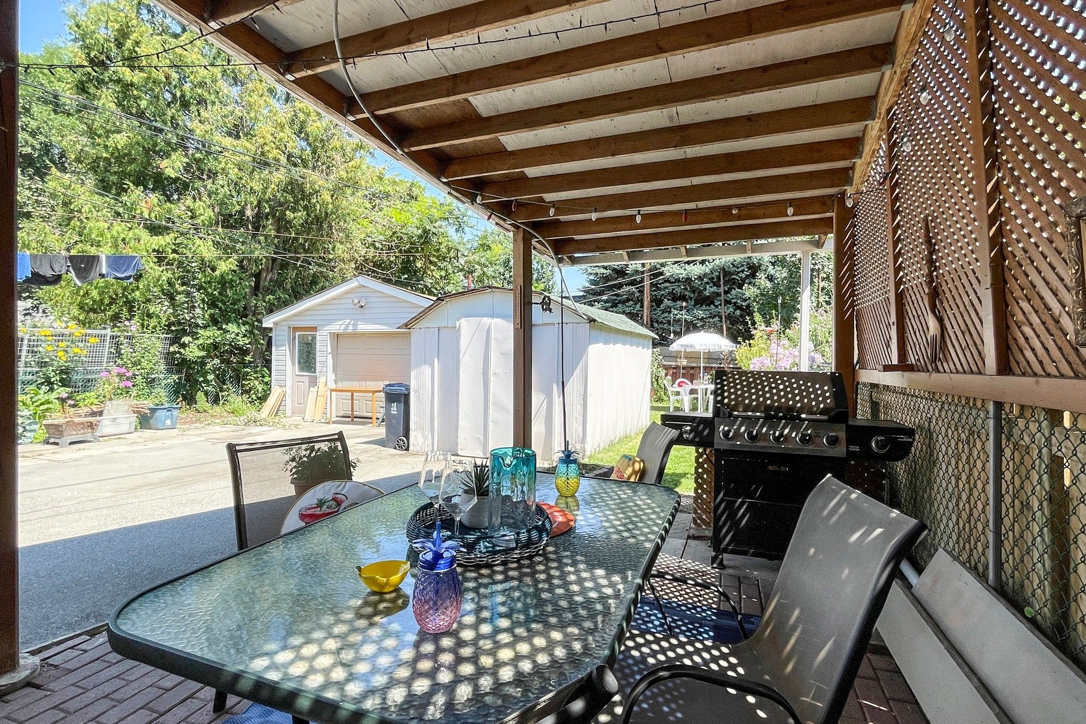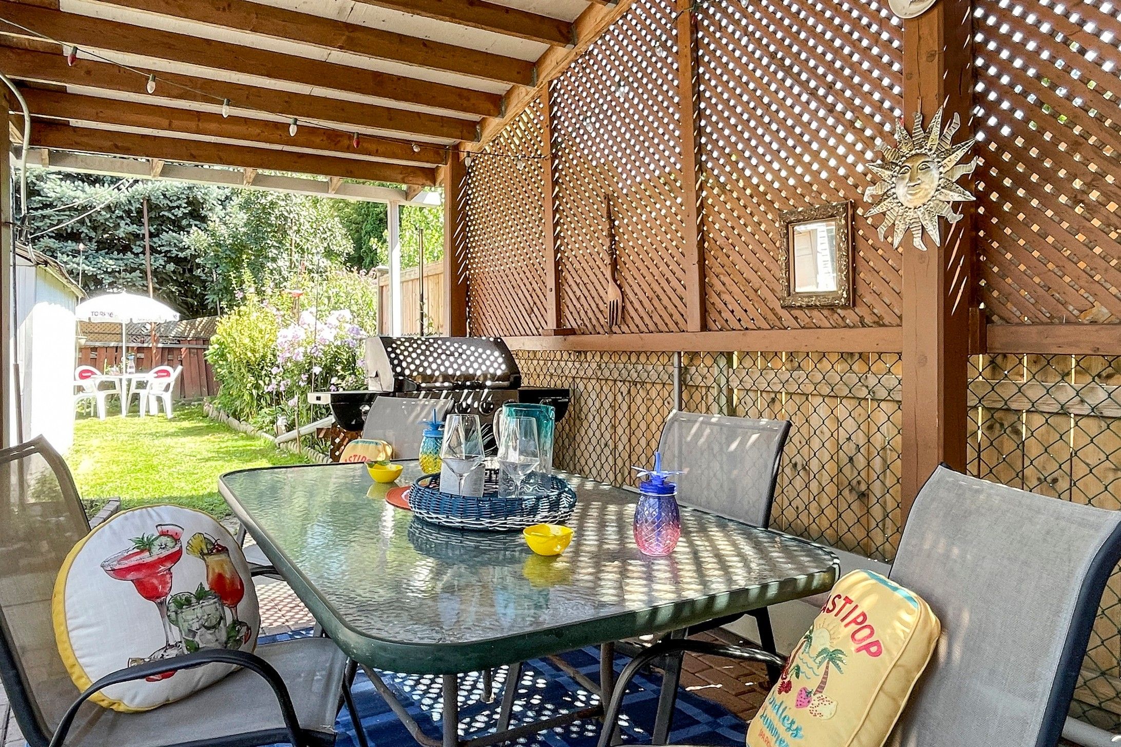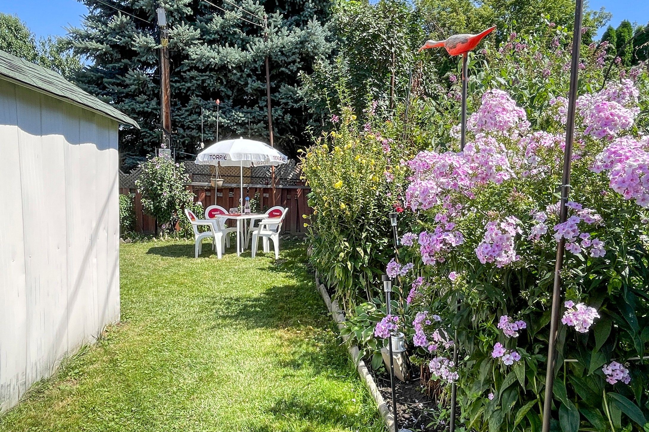• Backyard oasis with a garden and covered area for outdoor gatherings.