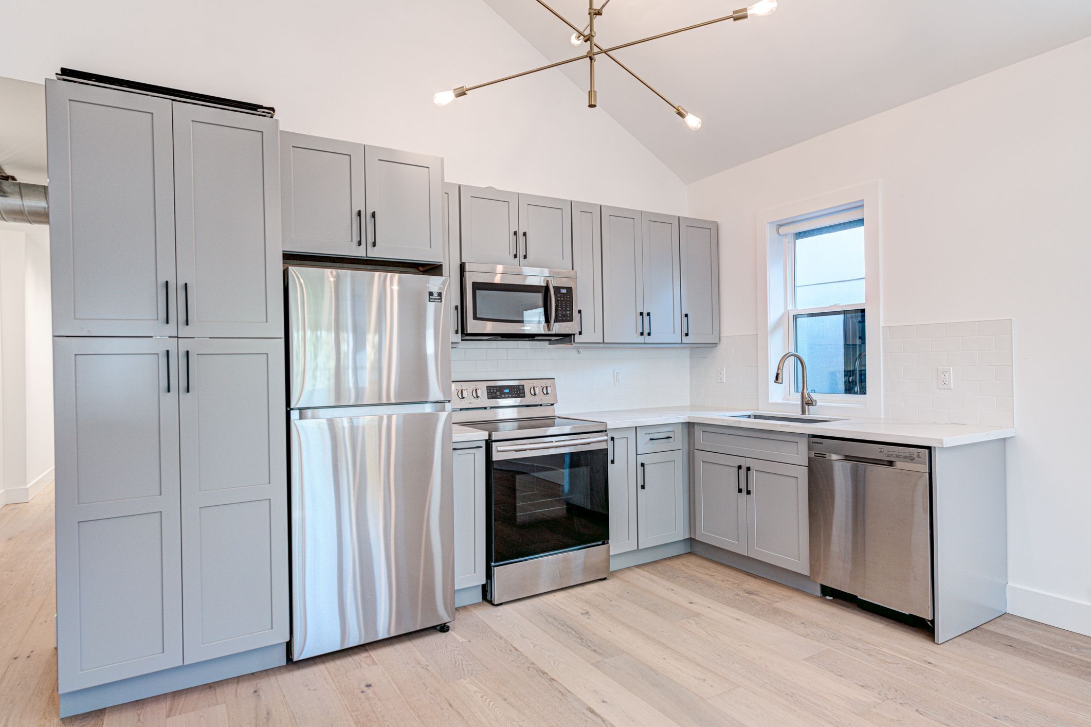• Beautiful kitchen featuring stone counters and stainless steel appliances.