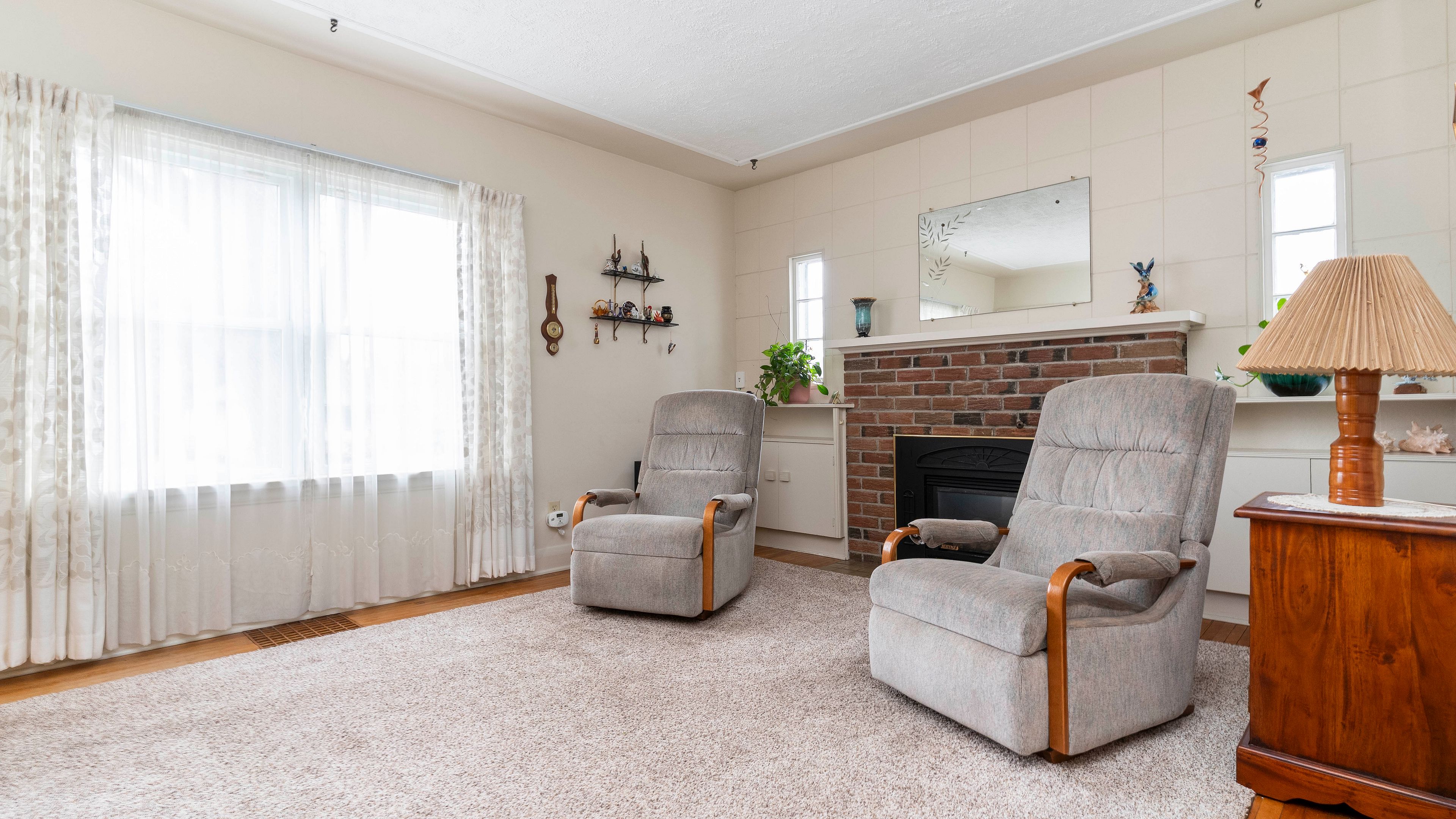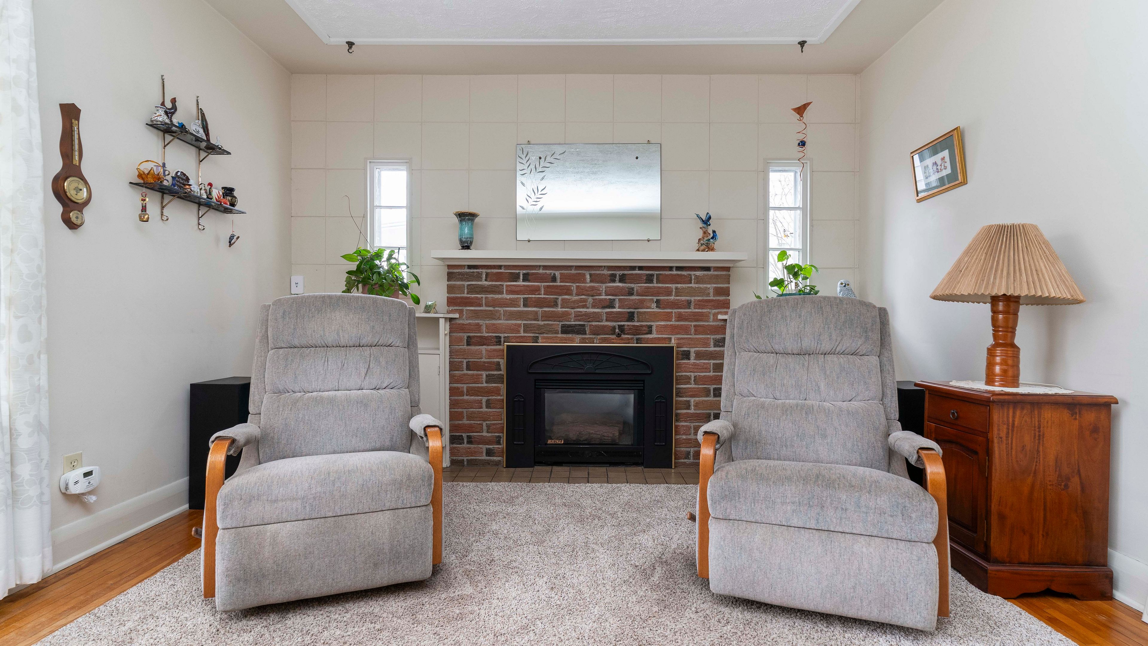 • Inviting living room with a cozy gas fireplace and red brick surround.
