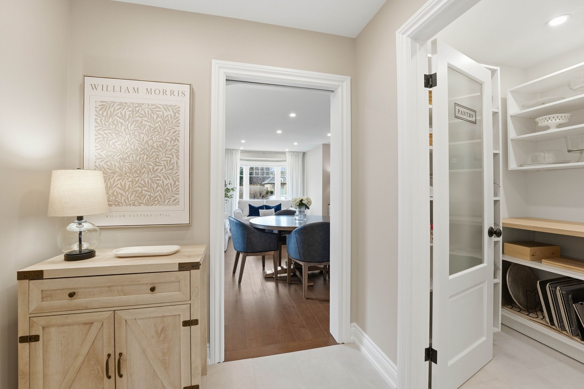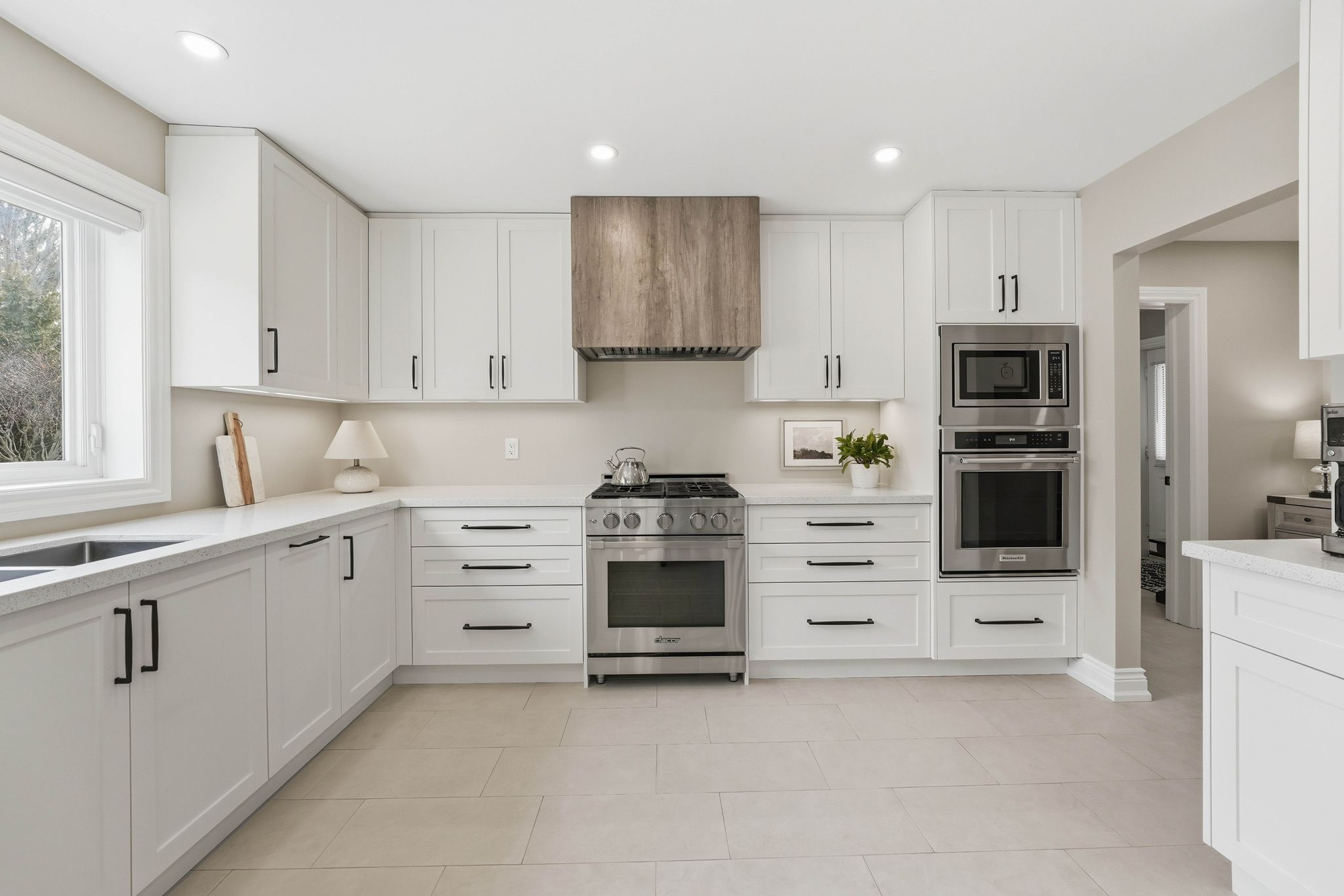 • Chef's kitchen with custom cabinetry, Caesarstone countertops, and walk-in pantry.