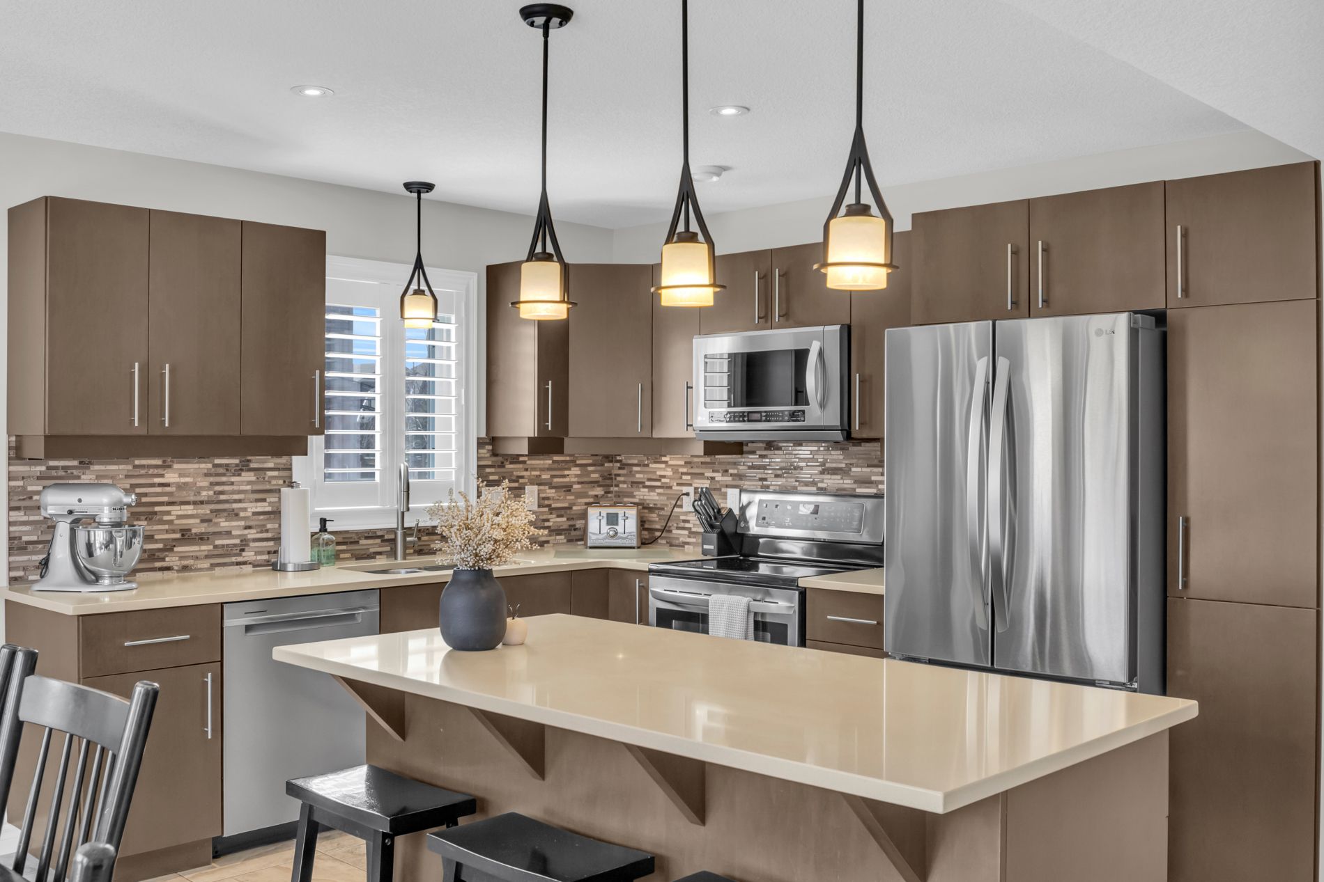 • Spacious eat-in kitchen with stainless steel appliances and large island.