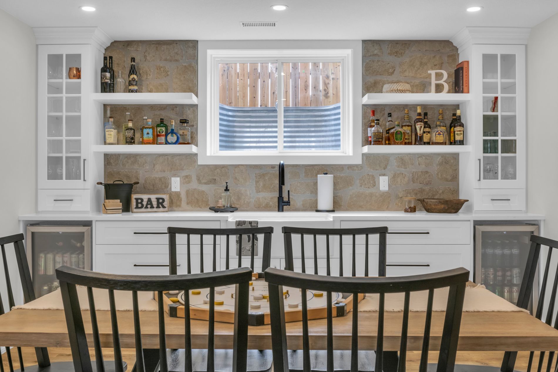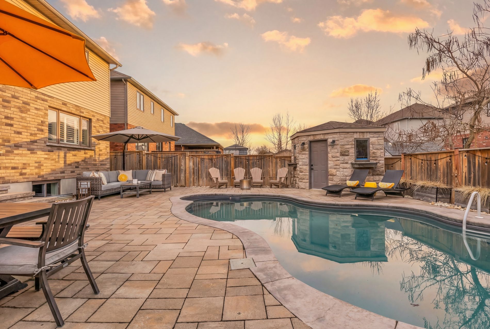 • Private backyard with saltwater pool, stone patio, and cozy features.