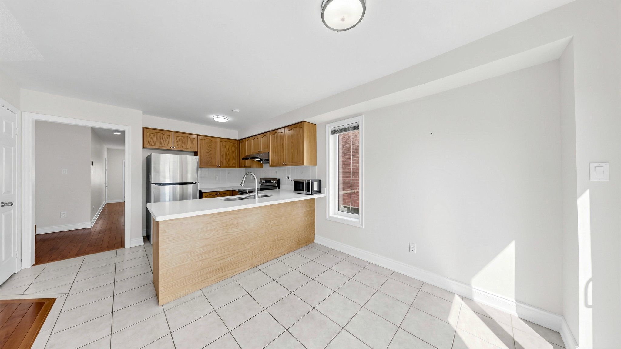 • Functional kitchen with quartz countertops and backyard access.