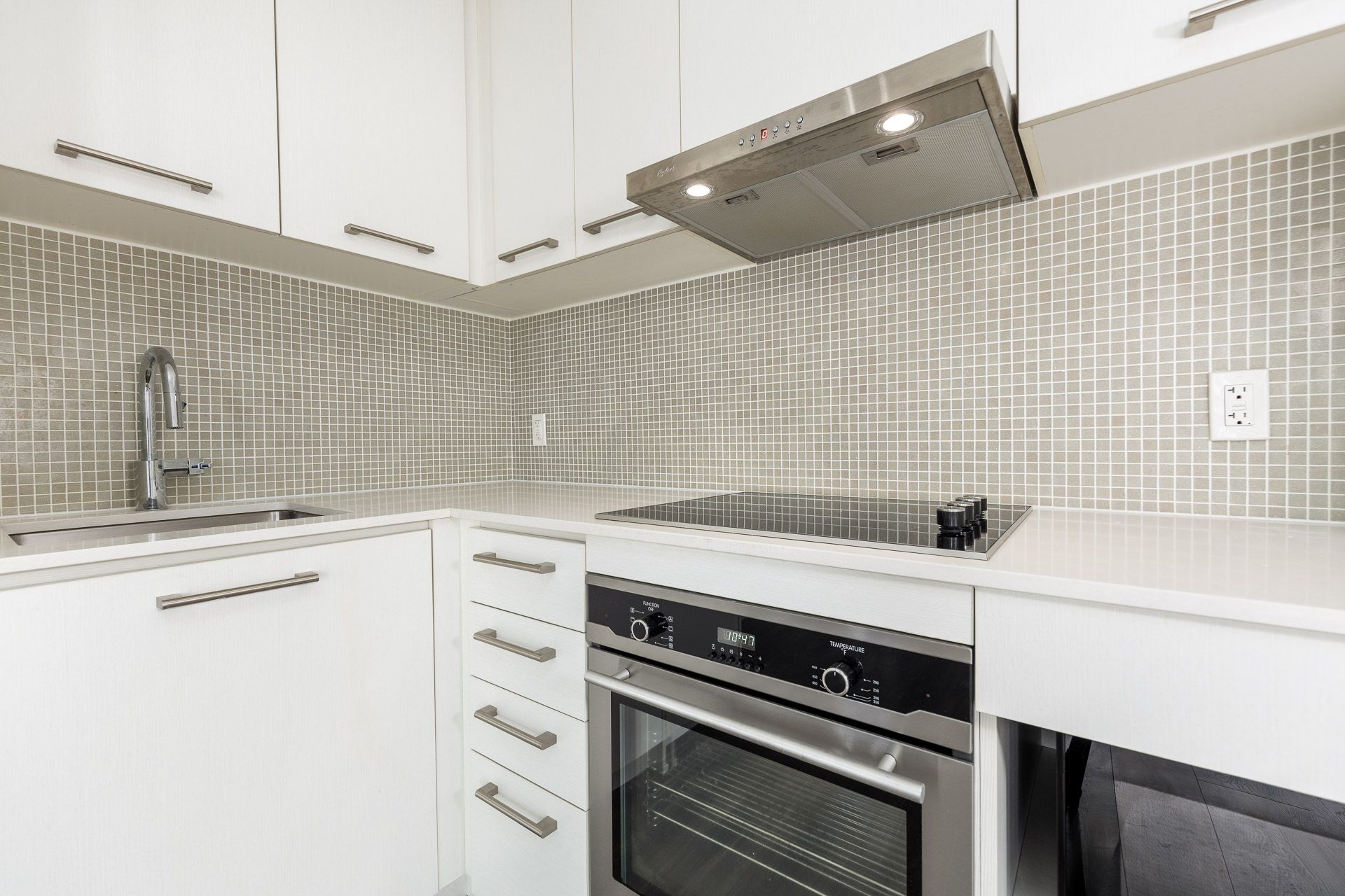 • Modern L-shaped kitchen with built-in appliances for convenience.