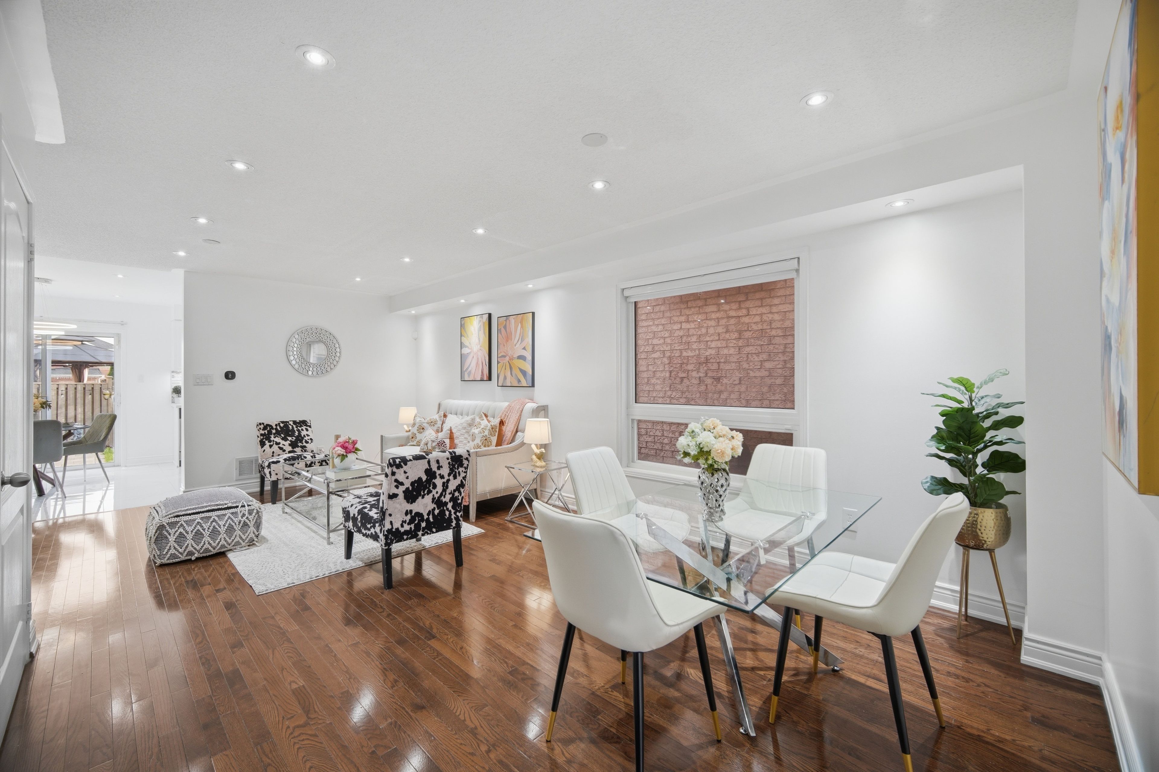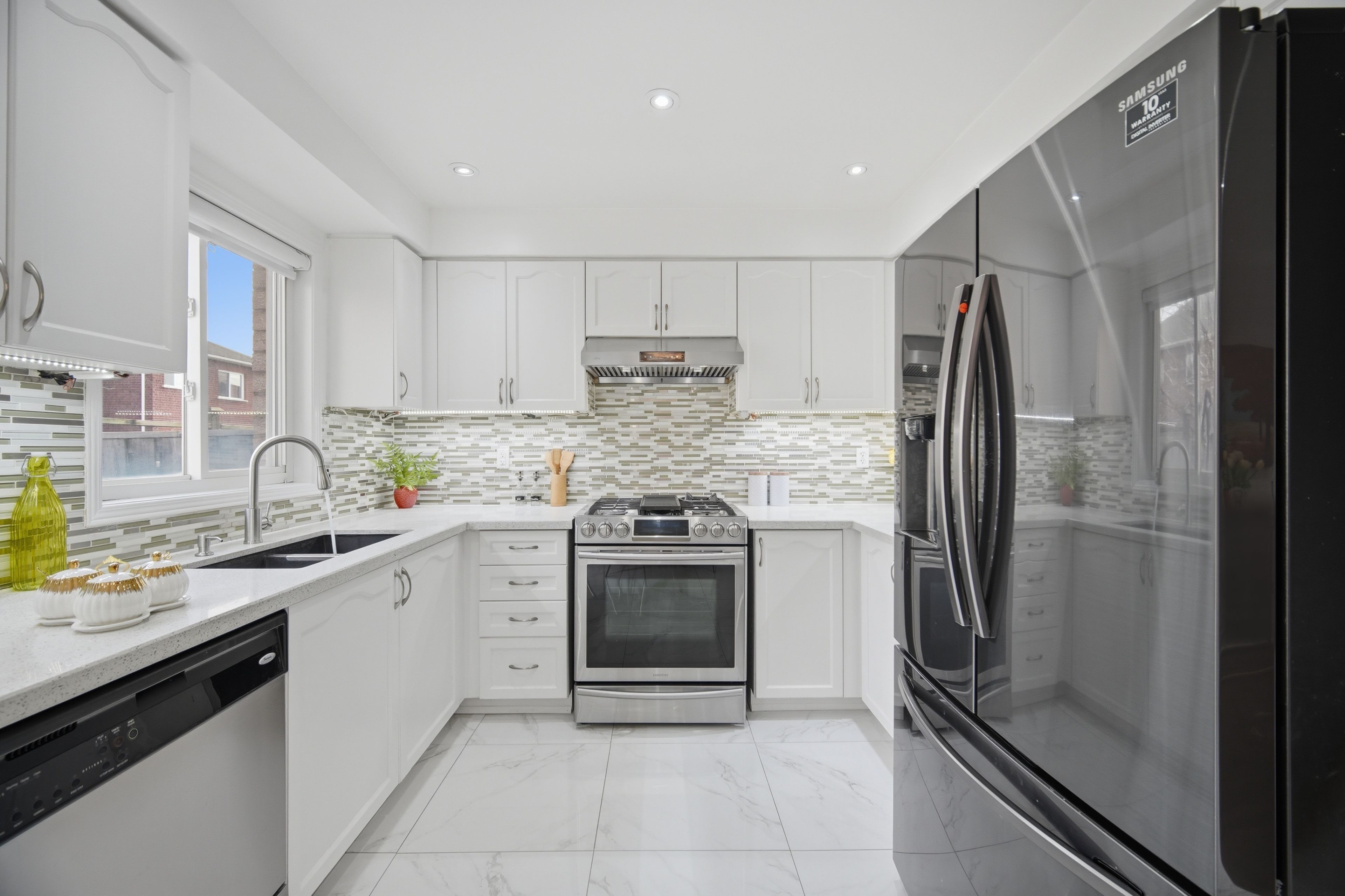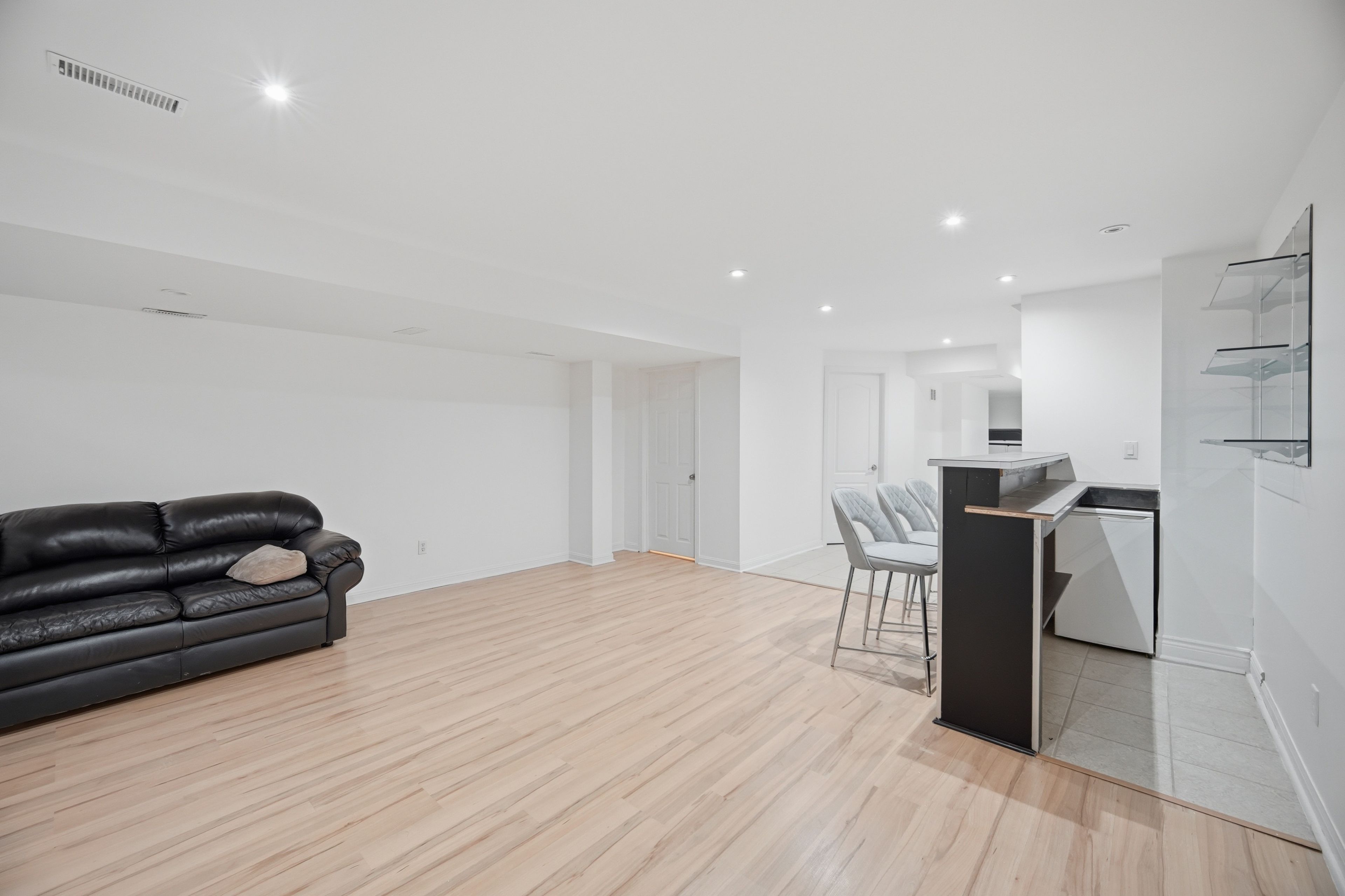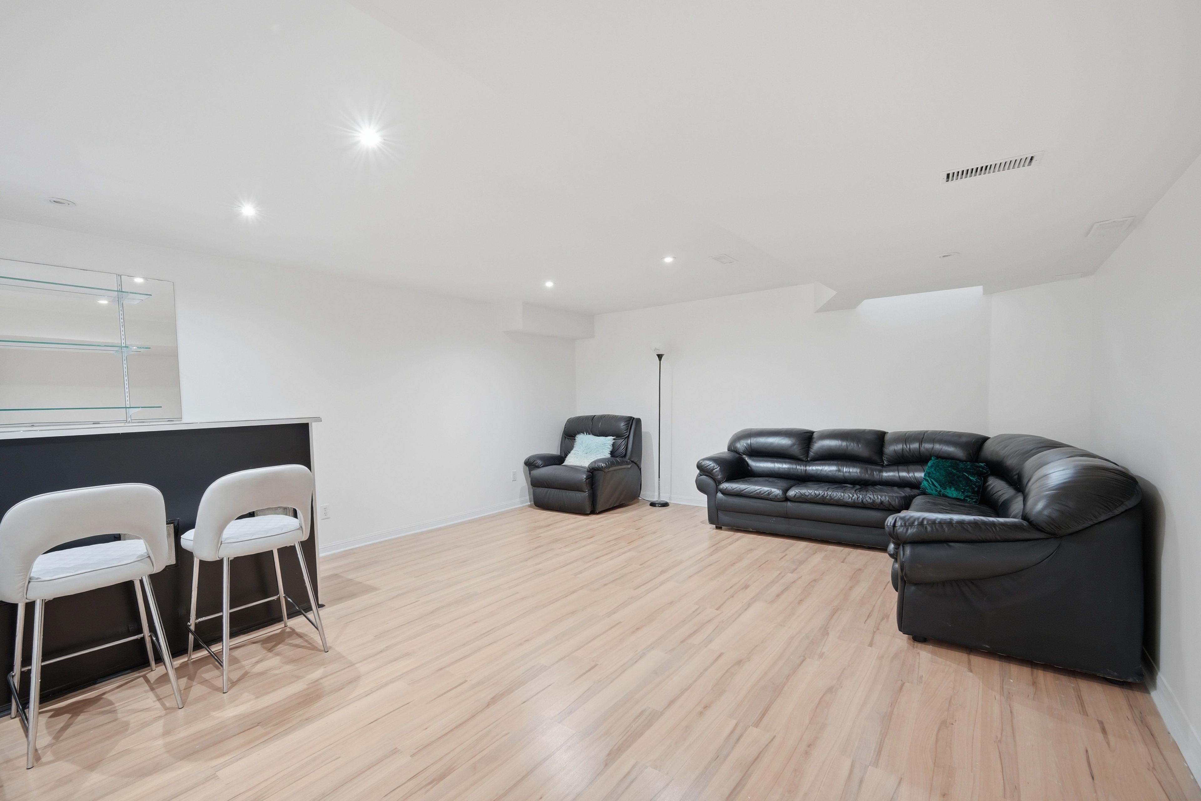 Wow! This is an absolute showstopper and a must-see! This stunning home offers exceptional privacy, abundant natural light, and one of the largest layouts on the street (approx. 1,757 sq. Ft.). Bright and meticulously maintained, it features a grand double-door entry and a spacious foyer, leading into an open-concept living and dining area with hardwood flooring and pot lights. Enjoy brand new 24"x24" porcelain tiles and a modern kitchen complete with quartz countertops, stylish backsplash, and a breakfast area overlooking a beautifully designed backyard-perfect for relaxing or entertaining. Elegant oak stairs lead to the second level, where you'll find a spacious primary bedroom with a custom built walk-in closet and ensuite bath, along with two other large sized bedrooms with double closets. A convenient second-floor laundry room adds everyday ease. Freshly painted throughout, this home also features an extended driveway and a tastefully finished basement with a large recreation area, open bar, 2-piece bathroom, and additional storage-ideal for hosting gatherings. This house garage is attached but the roof in the back is fully detached. Located in a superb, family-friendly neighborhood close to major shopping, schools, and just minutes to mount pleasant go station, new tennis court wj clifford park. A perfect blend of style, space, and convenience-don't miss this incredible opportunity!