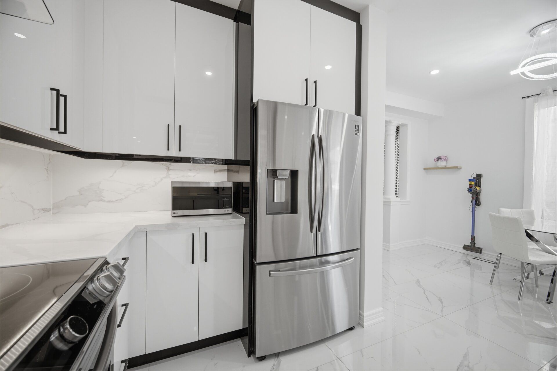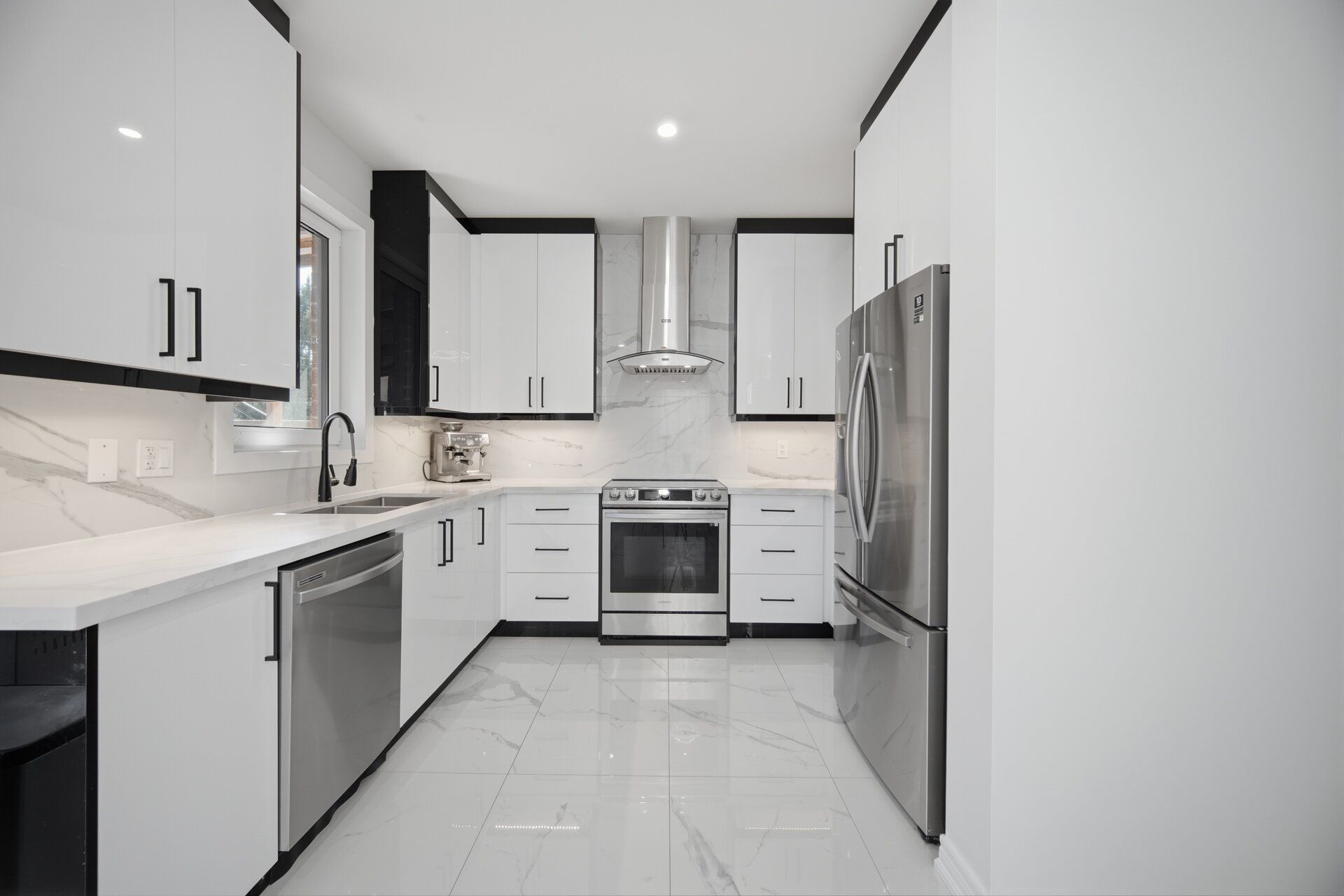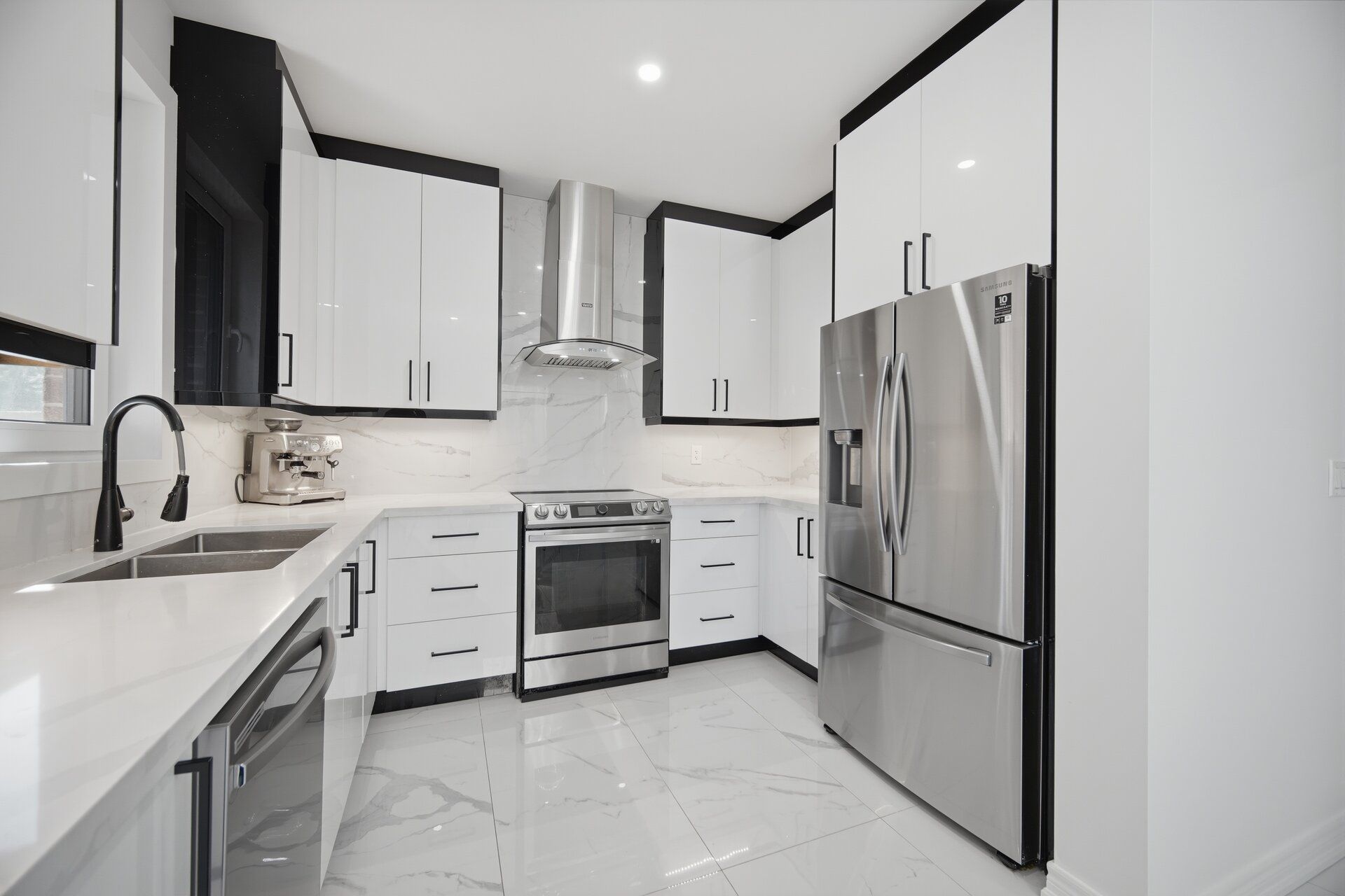 • Modern kitchen with quartz countertops and stainless steel appliances.